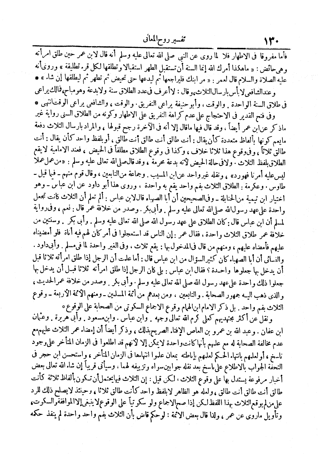 وقد فتح القدير في الأحتجاج على عدم كراهة التفريق على الإطهار وكونه من الطلاق السني غير ما ذكر عن ابن عمر أيضا وقد قال فيها ما قال إلا أنه في الآخرة رجح قبولها والمراد بإرسال الثلاث دفعة ما يعم كونها بألفاظ متعددة كأن يقال : أنت طالق أنت طالق أنت طالق أو بلفظ واحد كأن يقال : أنت طالق ثلاثا وفي وقوع هذا خلاف وكذا في وقوع الطلاق مطلقا في الحيض فعند الإمامية لا يقعالطلاق بلفظ الثلاث ولا في حالة الحيض لأنه بدعة محرمة وقد قال صلى الله تعالى عليه وسلم : من عمل عملا ليس عليه أمرنا فهو رد ونقله غير واحد عن ابن المسيب وجماعة من التابعين وقال قوم منهم فيما قيل طاوس وعكرمة : الطلاق الثلاث بفم واحد يقع به واحدة وروي هذا أبو داود عن ابن عباس وهو اختيار ابن تيمية من الحنابلة وفي الصحيحين أن أبا الصهباء قال لابن عباس : ألم تعلم أن الثلاث كانت تجعلواحدةعلى عهد رسول الله صلى الله تعالى عليه وسلم وأبي بكر وصدر من خلافة عمر قال : نعم وفي روايةلمسلم أن ابن عباس قال : كان الطلاق على عهد رسول الله صلى الله تعالى عليه وسلم وأبي بكر وسنتين من خلافة عمر طلاق الثلاث واحدة فقال عمر : إن الناس قد استعجلوا في أمر كان لهم فيه أناة فلو أمضيناه عليهم فأمضاه عليهم ومنهم من قال في المدخول بها : يقع ثلاث وفي الغير واحدة لمافي مسلم وأبي داود والنسائي أن أبا الصهباء كان كثير السؤال من ابن عباس قال : أما علمت أن الرجل إذا طلق امرأته ثلاثا قبل أن يدخل بها جعلوها واحدة فقال ابن عباس : بلى كان الرجل إذا طلق امرأته ثلاثا قبل أن يدخل بهاجعلوا ذلك واحدة على عهد رسول الله صلى الله تعالى عليه وسلم وأبيبكر وصدر من خلافة عمر الحديث والذي ذهب إليه جمهور الصحابة والتابعين ومن بعدهم من أئمة المسلمين ومنهم الأئمة الأربعة وقوعالثلاث بفم واحد بل ذكر الإمام ابن الهمام وقوع الإجماع السكوتي من الصحابة على الوقوع
