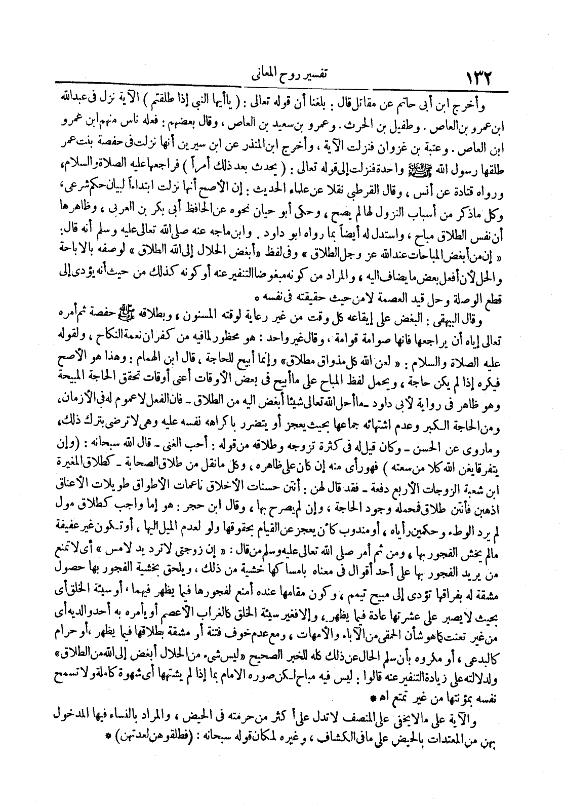 وأخرج ابن أبي حاتم عن مقاتل قال : بلغنا أن قوله تعالى : يا أيها النبي إذا طلقتم الآية نزل في عبد الله ابن عمرو بن العاص وطفيل بن الحرث وعمرو بن سعيد بن العاص وقال بعضهم : فعله ناس منهم ابن عمرو ابن العاص وعتبة بن غزوان فنزلت الآية وأخرج ابن المنذر عن ابن سيرين أنها نزلت في حفصة بنت عمر طلقها رسول الله صلى الله عليه و سلم واحدة فنزلت إلى قوله تعالى : يحدث يعد ذلك أمرا فراجعها عليه الصلاة و السلام ورواه قتادة عن أنس وقال القرطبي نقلا عن علماء الحديث : إن الأصح أنها نزلت ابتداءا لبيان حكم شرعي وكل ما ذكر من أسباب النزول لها لم يصح وحكى أبو حيان نحوه عن الحافظ أبي بكر بن العربي وظاهرها أن نفس الطلاق مباح واستدل له أيضا بما رواه أبو داود وابن ماجه عنه صلى الله تعالى عليه وسلم أنه قال : إن من أبغض المباحات عند الله عز و جل الطلاق وفي لفظ أبغض الحلال إلى الله الطلاق لوصفه بالإباحة والحل لأن أفعل بعض ما يضاف إليه والمراد من كونه مبغوضا التنفير عنه أو كونه كذلك من حيث أنه يؤدي إلى قطع الوصلة وحل قيد العصمة لا من حيث حقيقته في نفسه
