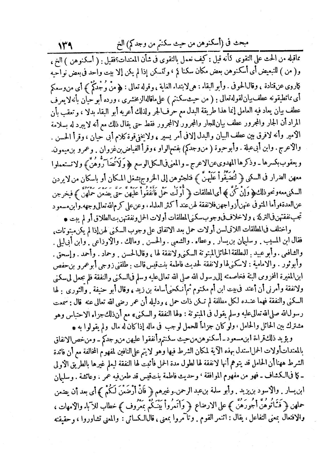مما قبه من الحث على التقوى كأنه قيل : كيف نعمل بالتقوى في شأن المعتدات فقيل : أسكنوهن الخ و من للتبعيض أي أسكنوهن بعض مكان سكناكم ولتسكن إذا لم يكن إلا بيت واحد في بعض نواحيه كما روي عن قتادة وقال الحوفي وأبو البقاء : هي لابتداء الغاية وقوله تعالى : من وجدكم أي من وسعكم أي مما تطيقونه عطف بيان لقوله تعالى : من حيث سكنتم على ما قاله الزمخشري ورده أبو حيان بأنه لا يعرف عطف بيان يعدا فيه العامل إنما هذا طريقة البدل مع حرف الجر ولذلك أعربه أبو البقاء بدلا وتعقب بأن المراد أن الجار والمجرور عطف بيان للجار والمجرور فقط حتى يقال ذلك مع أنه لا يبرد له بسلامة الأمير وأنه لا فرق بين عطف البيان والبدل إلا في أمر يسير ولا يخفى قوة كلام أبي حيان وقرأ الحسن والأعرج وابن أبي عبلة وأبو حيوة من وجدكم بفتح الواو وقرأ الفياض بن غزوان وعمرو بن ميمون ويعقوب بكسرها وذكرها المهدوي عن الأعرج والمعنى في الكل الوسع ولا تضآروهن ولا تستعملوا معهن الضرار في السكنى لتضيقوا عليهن فتلجئوهن إلى الخروج بشغل المكان أو بإسكان من لا يردن السكنى معه نحو ذلك وإن كان أي المطلقات أولت حمل فأنفقوا عليهن حتى يضعن حملهن فيخرجن عن العدة وأما المتوفي عنهن أزواجهن فلا نفقة لهن عند أكثر العلماء وعن علي كرم الله تعالى وجهه وابن مسعود تجب نفقتهن في التركة ولا خلاف في وجوب سكنى المطلقات أولات الحمل ونفقتهن بت الطلاق أو لم يبت