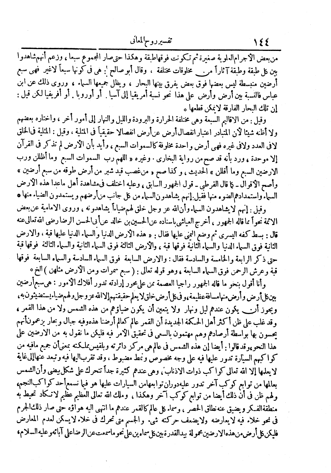 وأنا أقول بنحو ما قاله الجمهور راجيا العصمة ممن على محور إرادته تدور أفلاك الأمور : هي سبع أرضين بين كل أرض وأرض منها مسافة عظيمة وفي كل أرض خلق لا يعلم حقيقتهم إلا الله عز و جل ولهم ضياء يستضيئون به ويجوز أن يكون عندهمليل ونهار ولا يتعين أن يكون ضيهؤهم من هذه الشمس ولا من هذا القمر وقد غلب على ظن أكثر أهل الحكمة الجديدة أن القمر عالم كعالم أرضنا هذه وفيه جبال وبحار يزعمون أنهم يحسون بها بواسطة أرصادهم وهم مهتمون بالسعي في تحقيق الأمر فليكن ما نقول به من الأرضين على هذا النحو وقد قالوا : أيضا إن هذه الشمس في عالم هي مركز دائرته وبلقيس مملكته بمعنى أن جميع ما فيه من كواكبهم السيارة تدور عليها فيه على وجه مخصوص ونمط مضبوط وقد تقرب إليها فيه وتبعد عنها إلى غاية لا يعلمها إلا الله تعالى كواكب ذوات الأذناب وهي عندهم كثيرة جداتتحرك على شكل بيضي وأن الشمس بعالمها من توابع كوكب تتدور عليه دوران توابعها من السيارات عليها هو فيما نسمع أحد كواكب النجم ولهم ظن في أن ذلك أيضا من توابع كوكب آخر وهكذا وملك الله تعالى العظيم عظيم لا تكاد تحيط به منطقة الفكر ويضيق عنه نطاق الحصر وسماء كل عالم كالقمر عندهم ما انتهى إليه هوؤه حتى صار ذلك الجرم في نحو خلاء فيه لا يعارضه ولا يضعف حركته شيء والجسم متى تحرك في خلاء لا يسكن لعدم المعارض فليكن كل أرض من هذه الأرضين محمولة بيد القدرة بين كل سماءين على نحو ما سمعتت عن الرضا على آبائه وعليه السلام