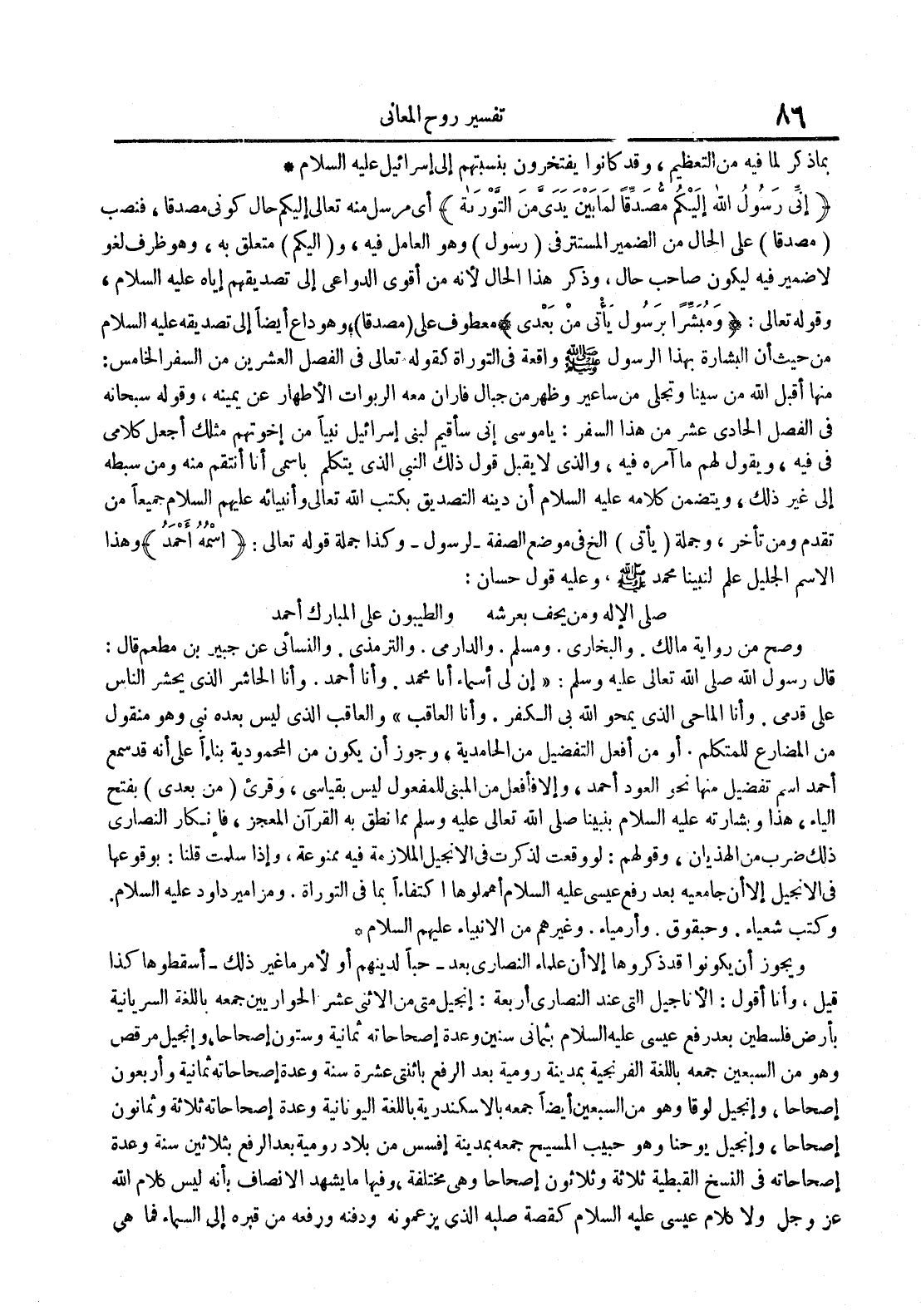 إني رسول الله إليكم مصدقا لما بين يدي من التوراة أي مرسل منه تعالى إليكم حال كوني مصدقا فنصب مصدقا على الحال من الضمير المستتر في رسول وهو العامل فيه و إليكم متعلق به وهو ظرف لغو لا ضمير فيه ليكون صاحب حال وذكر هذا الحال لأنه من أقوى الدواعي إلى تصديقهم إياه عليه الصلام وقوله تعالى : ومبشرا برسول من بعدي معطوف على مصدقا وهو داع أيضا إلى تصديقه عليه السلام من حيث أن البشارة بهذا الرسول صلى الله عليه و سلم واقعة في التوراة كقوله تعالى في الفصل العشرين من السفر الخامس : منها أقبل الله من سينا وتجلى من ساعير وظهر من جبال فاران معه الربوات الأطهار عن يمينه وقوله سبحانه في الفصل الحادي عشر من هذا السفر : يا موسى إني سأقيم لبني إسرائيل نبيا من إخوتهم مثلك أجعل كلامي في فيه ويقول لهم ما آمره فيه والذي لا يقبل قول ذلك النبي الذي يتكلم باسمي أنا أنتقم منه ومن سبطه إلى إلى غير ذلك ويتضمن كلامه عليه السلام أن دينه التصديق بكتب الله تعالى وأنبيائه عليهم السلام جميعا من تقدم ومن تأخر وجملة يأتي الخ موضع الصفة لرسول وكذا جملة قوله تعالى : اسمه أحمد وهذا الأسم الجليل علم لنبينا محمد صلى الله عليه و سلم وعليه قول حسان : صلى الإله ومن يحف بعرشه والطيبون على المبارك أحمد وصح من رواية مالك والبخاري ومسلم والدارمي والترمذي والنسائي عن جبير بن مطعم قال : قال رسول الله صلى الله تعالى عليه وسلم : إن لي أسماء أنا محمد وأنا أحمد وأنا الحاشر الذي يحشر الناس قدمي وأنا الماحي الذي يمحو الله بي الكفر وأنا العاقب الذي ليس بعده نبي وهو منقول من المضارع للمتكلم أو من أفعل التفضيل من الحامدية وجوز أن يكون من المحمودية بناءا على أنه قد سمع أحمد اسم تفضيل منها نحو العود أحمد وإلا فأفعل من المبني للمفعول ليس بقياسي وقريء من بعدي بفتح الياء هذا وبشارته عليه السلام بنبينا صلى الله تعالى عليه وسلم مما نطق به القرآن المعجز فإنكار النصارى ذلك ضرب من الهذيان وقولهم : لو وقعت لذكرى في الإنجيل الملازمة فيه ممنوعة وإذا سلمت قلنا : بوقوعها في الإنجيل إلا أن جامعيه بعد رفع عيسى عليه السلام أهملوها اكتفاءا بما في التوراة ومزامير داود عليه السلام وكتب شعياء وحبقوق وأرمياء وغيرهم من الأنبياء عليهم السلام