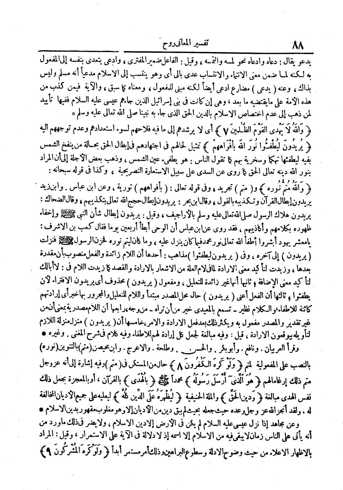 - أي لا يرشدهم إلى ما فيه فلاحهم لسوء استعدادهم وعدم توجههم إليه يريدون ليطفؤا نور الله بأفواههم تمثيل في اجتهادهم في إبطال الحق بحالة منينفخ الشمس بفيه ليطفئها تهكما وسخرية بهم كما تقول الناس : هو يطفيء عين الشمس وذهب بعض الأجلة إلى أن المراد بنور الشمس دينه تعالى الحق كما روي عن السدي على سبيل الأستعارة التصريحية وكذا في قوله سبحانه : والله متم نوره و متم تجريد وفي قوله تعالى : بأفواههم تورية وعن ابن عباس وابن زيد يريدون إبطال القرآن وتكذيبه بالقول وقالابنبحر : يريدون إبطالحجج اللهتعالىبتكذيبهم وقال الضحاك : يريدون هلاك الرسول صلى الله تعالى عليه وسلم بالأراجيف وقيل : يريدونإبطالشأنالنبي صلى الله عليه و سلم وإخفاءظهوره بكلامهم وأكاذيبهم فقد روي عن ابن عباس أن الوحي أبطأ أربعين يوما فقال كعب بن الأشرف : يا معشر يهود أبشروا أطفأ الله تعالىنور محمد فيما كان ينزل عليه وما كان ليتم نوره فحزن الرسول صلى الله عليه و سلم فنزلت يريدون إلى آخره وفي يريدون ليطفئوا مذاهب : أحدهما أن اللام زائدة والفعل منصوب بأن مقدرة بعدها وزيدت لتأكيد معنى الإرادة لما في لام العلة من الإشعار بالإرادة والقصد كما زيدت اللام في : لا أبالكلتأكيد معنى الإضافة ثانيها أنهازائدة للتعليل ومفعول يريدون محذوف أي يريدونالأفتراء لأن يطفئوا ثالثها أنالفعل أعني يريدون حال محلالمصدر مبتدأ واللام للتعليل والمجرور بها خبر أي إرادتهم كائنة للأطفاء والكلام نظير تسمع بالمعيدي خير من أن تراه من وجه رابعها أن اللام مصدرية بمعنة أن من غير تقدير والمصدر مفعوا به ويكثر ذلك بعد فعل الإرادة والأمر خامسها أن يريدون منزل منزلة اللازم لتأويله بيوقعون الإرادة قيل : وفيه مبالغة لجعل كل إرادةلهم للأطفاء وفيه كلامفي شرح المغنى وغيره