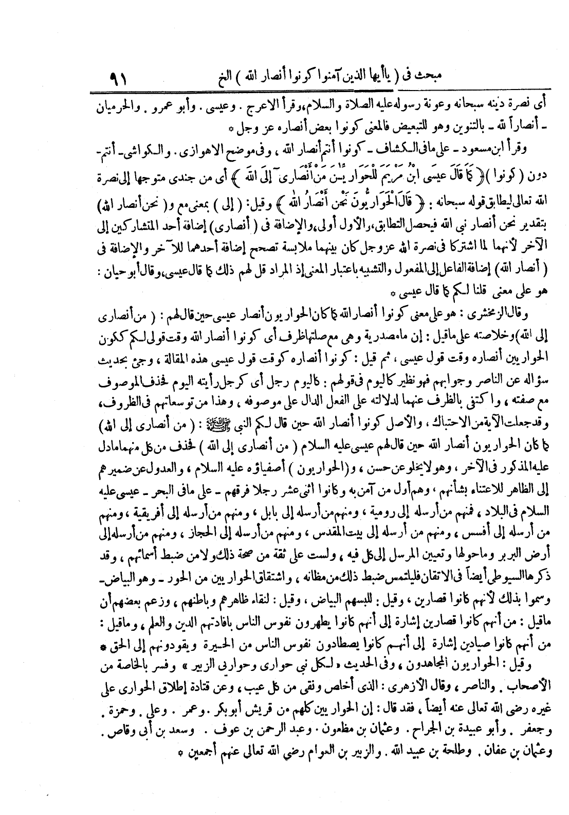 وقالالزمخشري : هو على معنى كونوا أنصار الله كما كان الحواريون أنصار عيسى حين قال لهم : من أنصاري إلى الله وخلاصته على ما قيل : إن ما مصدرية وهي مع صلتها ظرف أي كونوا أنصار الله وقت قولي لكم ككون الحوريين أنصاره وقت قول عيسى ثم قيل : كونوا أنصاره كوقت قول عيسى هذه المقالة وجيء بحديث سؤاله عن الناصر وجوابهم فهو نظير كاليوم في قولهم : كاليوم رجل أي كرجل رأيته اليوم فحذف الموصوف مع صفته واكتفى بالظرف عنهما لدلالته على الفعل الدالعلى موصوفه وهذامن توسعاتهم في الظروف وقد جعلت الآية من الأحتباك والأصل كونوا أنصار الله حين قال لكم النبي صلى الله عليه و سلم : من أنصاري إلى الله كما كان الحواريون أنصار الله حين قال لهم عيسى عليه السلام من أنصاريإلى الله فحذف من كل منهما ما دل عليه المذكور في الآخر وهو لا يخلو عن حسن و الحواريون أصفياؤه عليه السلام والعدول عن ضميرهمإلى الظاهر للأعتناء بشأنهم وهم أول من آمنبه وكانوا اثني عشر رجلا فرقهم على ما في البحر عيسى عليه السلام في البلاد فمنهم من أرسله إلى رومية ومنهممن أرسله إلى بابل ومنهم من أرسله إلى إفريقية ومنهممن أرسله إلى أفسس ومنهم من أرسله إلى بيت المقدس ومنهم من أرسله إلى المجاز ومنهممن أرسله إلى أرض البربر وما حولها وتعيين المرسل إلى كل فيه ولست على ثقة من صحة ذلك ولا من ضبط أسمائهم وقد ذكرها السيوطيأيضا في الأتقان فليلتمس ضبط ذلك من مظانه واشتقاق الحواريين من الحور وهو البياض وسموا بذلك لأنهم كانوا قصارين وقيل : لبسهم البياض وقيل : لنقاء ظاهرهم وباطنهم وزعم بعضهم أنما قيل : من أنهم قصارين إشارة إلى أنهم كانوا يطهرون نفوس الناس بإفادتهم الدين والعلم وما فيل : من أنهم كانوا صيادين إشارة إلى أنهم كانوا يصطادون نفوس الناس من الحيرة ويقودونهم إلى الحق