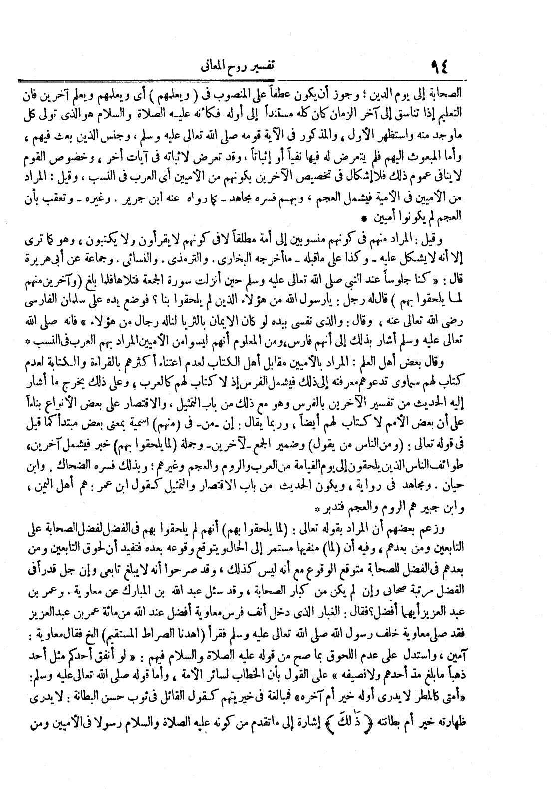 وقال بعض أهل العلم : المراد بالأميين مقابل أهل الكتاب لعدم اعتناء أكثرهم بالقراءة والكتابة لعدم كتاب لهم سسماوي تدعوهم معرفته إلى ذلك فيشمل الفرس إذ لا كتاب لهم كالعرب وعلى ذلك يخرج ما أشار إليه الحديث من تفسير الآخرين بالفرس وهو مع ذلك من باب التمثيل والأقتصار على بعض الأنواع بناءا على أن بعض الأمم لا كتاب لهم أيضا وربما يقال : إن من في منهم إسمية بمعنى بعض مبتدأ كما قيل في قوله تعالى : ومن الناس من يقول وضمير الجمع لآخرين وجملة لما يلحقوا بهم خبر فيشمل آخرين طوائف الناس الذين يلحقون إلى يوم القيامة من العرب والروم والعجم وغيرهم وبذلك فسره الضحاك وابن حيان ومجاهد في رواية ويكون الحديث من باب الأقتصار والتمثيل كقول ابن عمر : هم أهل اليمن وابن جبير هم الروم والعجم فتدبر