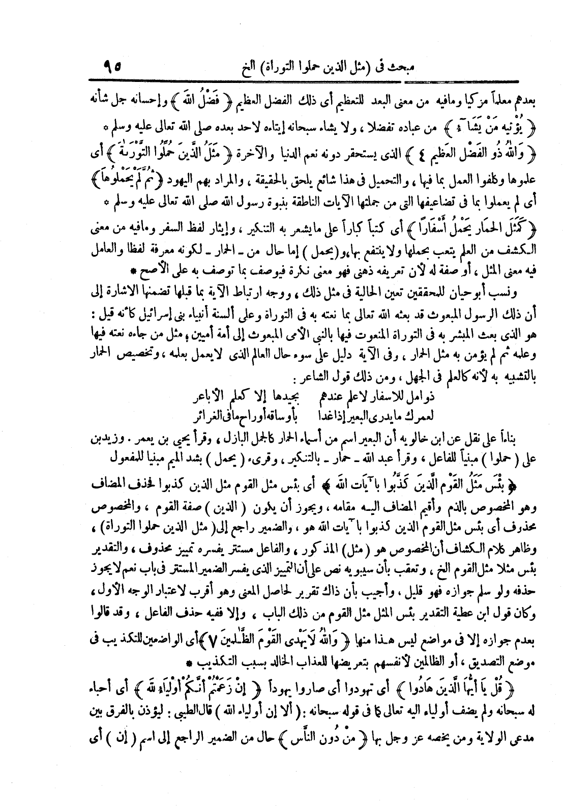ونسب أبو حيان للمحققين تعين الحالية في مثل ذلك ووجه ارتباط الآية بما قبلها تضمنها الإشارة إلى أن ذلك الرسول المبعوث قد بعثه الله تعالى بما نعته به في التوراة وعلى ألسنة أنبياء بني إسرائيل كأنه قيل : هو الذي بعث المبشر به في التوراة المنعوت فيها بالنبي الأمي المبعوث إلى أمة أميين مثل من جاءه نعته فيها وعلمه ثم لم يؤمن به مثل الحمار وفي الآية دليل على سوء حال العالم الذي لا يعمل بعلمه وتخصيص الحمار بالتشبيه به لأنه كالعلم في الجهل ومن ذلك قول الشاعر : ذوامل للأسفار لا علم عندهم يجيدها إلا كعلم الأباعر لعمرك ما يدري البعير إذا غدا بأوساقه أرواح ما في الغرائر بناءا على نقل عن ابن خالويه أن البعير اسم من أسماء الحمار كالجمل البازل وقرأ يحيى بن يعمر وزيد بنعلي حملوا مبنيا للفاعل وقرأ عبد الله حمار بالتنكير وقريء يحمل بشد الميم مبنيا للمفعول بئس مثل القوم الذين كذبوا بآيات الله أي بئس مثل القوم مثل الذين كذبوا فحذف المضاف وهو المخصوص بالذم وأقيم المضاف إليه مقامه ويجوز أن يكون الذين صفة القوم والمخصوص محذوف أي بئس مثل القوم الذين كذبوا بآيات الله وهو والضمير راجع إلى مثل الذين حملوا التوراة وظاهر كلام الكشاف أن المخصوص هو مثل المذكور والفاعل مستتر يفسره تمييز محذوف والتقدير بئس مثلا مثل القوم الخ وتعقب بأن سيبويه نص على أن التمييز الذي يفسر الضمير المستتر في باب نعم لا يجوزحذفه ولو سلم جوازه فهو قليل وأجيب بأن ذاك تقرير لحاصل المعنى وهو أقرب لاعتبار الوجه الأول وكان قول ابن عطية التقدير بئس المثل مثل القوم من ذلك الباب وإلا ففيه حذف الفاعل وقد قالوابعدم جوازه إلا في مواضع ليس هذا منها والله لا يهدي القوم الظالمين