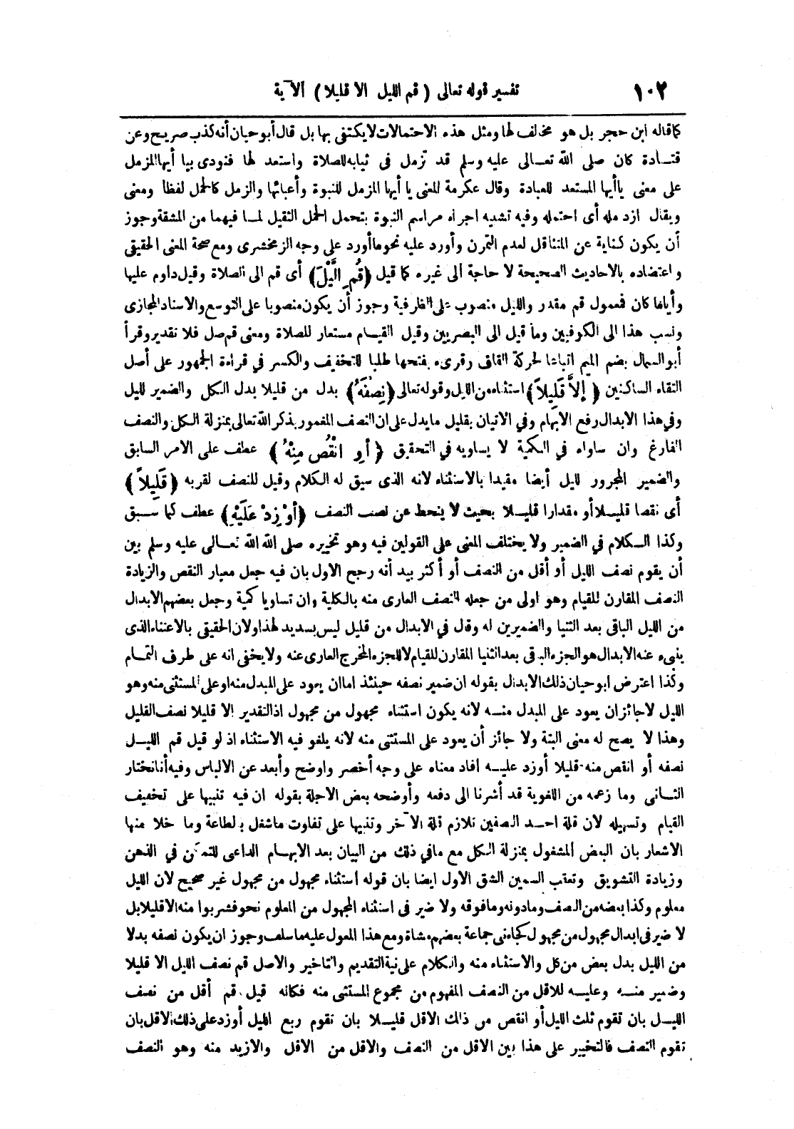 كما قاله ابن حجر بل هو مخالف لها ومثل هذه الإحتمالات لا يكتفي بها بل قال أبو حيان أنه كذب صريح وعن قتادة كان صلى الله تعالى عليه وسلم قد تزمل في ثيابه للصلاة واستعد لها فنودي بيا أيها المزمل على معنى يا أيها المستعد للعبادة وقال عكرمة المعنى يا أيها المزمل للنبوة وأعبائها والزمل كالحمل لفظا ومعنى ويقال أزد مله أي أحتمله وفيه تشبيه إجراء مراسم النبوة بتحمل الثقيل لما فيهما من المشقة وجوز أن يكون كناية عن المتثاقل لعدم التمرن وأورد عليه نحو ما أورد على وجه الزمخشري ومع صحة المعنى الحقيقي واعتضاده بالأحاديث الصحيحة لا حاجة إلى غيره كما قيل قم الليل أي قم إلى الصلاة وقيل داوم عليها وأيا ما كان فمعمول قم مقدر والليل منصوب على الظرفية وجوز أن يكون منصوبا على التوسع والإسناد المجازي ونسب هذا إلى الكوفيين وما قيل إلى البصريين وقيل القيام مستعار للصلاة ومعنى قم صل فلا تقدير وقرأ أبو السمال بضم الميم اتباعا لحركة القاف وقريء بفتحها طلبا للتخفيف والكسر في قراءة الجمهور على أصل التقاء الساكنين إلا قليلا استثناء من الليل وقوله تعالى نصفه بدل من قليلا بدل الكل والضمير لليل وفي هذا الإبدال رفع الإبهام وفي الإتيان بقليل ما يدل على أن النصف المغمور بذكر الله تعالى بمنزلة الكل والنصف الفارغ وإن ساواه في الكمية لا يساويه في التحقيق أو أنقص منه عطف على الأمر السابق والضمير المجرور لليل أيضا مقيدا بالإستثناء لأنه الذي سيق له الكلام وقيل للنصف لقربه قليلا أي نقصا قليلا أو مقدارا قليلا بحيث لا ينحط عن نصف النصف أو زد عليه عطف كما سبق وكذا الكلام في الضمير ولا يختلف على القولين فيه وهو تخيير صلى الله تعالى عليه وسلم بين أن يقوم نصف الليل أو أقل من النصف أو أكثر بيد أنه رجح الأول بأن فيه جعل معيار النقص والزيادة النصف المقارن للقيام وهو أولى من جعله للنصف العاري منه بالكلية وإن تساويا كمية وجعل بعضهم الإبدال من الليل الباقي بعد الثنيا والضميرين له وقال في الإبدال من قليل ليس بسديد لهذا ولأن الحقيقي بالإعتناء الذي ينبيء عنه الإبدال هو الجزء الباقي بعد الثنيا المقارن للقيام لا للجزء المخرج العاري عنه ولا يخفى أنه على طرف التمام وكذا اعترض أبو حيان ذلك الإبدال بقوله أن ضمير نصفه حينئذ إما أن يعود على المبدل منه أو على المستثنى منه وهو الليل لا جائز أن يعود على المبدل منه لأنه يكون استثناء مجهول إذ التقدير إلا قليلا نصف القليل وهذا لا يصح له معنى البتة ولا جائز أن يعود على المستثنى منه لأنه يلغو فيه الإستثناء إذ لو قيل قم الليل نصفه أو انقص منه قليلا أو زد عليه أفاد معناه على وجه أخضر وأوضح وأبعد على الإلباس وفيه أنا نختار الثاني وما زعمه من اللغوية قد أشرنا إلى دفعه وأوضحه بعض الأجلة بقوله إن فيه تنبيها على تخفيف القيام وتسهيله لأم قلة أحد النصفين تلازم قلة الآخر وتنبيها على تفاوت ما شغل بالطاعة وما خلا منها الإشعار بأن البعض المشغول بمنزلة الكل مع ما في ذلك من البيان بعد الإبهام الداعي للتمكن في الذهن وزيادة التشويق وتعقب السمين الشق الأول أيضا بأن قوله استثناء مجهول من مجهول غير صحيح لأن الليل معلوم وكذا بعضه من النضف وما دونه وما فوقه ولا ضير في استثناء المجهول من المعلوم نحو فشربوا منه إلا قليلا بل لا ضير في إبدال مجهول من مجهول كجاءني جماعة بعضهم مشاة ومع هذا المعول عليه ما سلف وجوز أن يكون نصفه بدلا من الليل بدل بعض من كل والإستثناء منه والكلام على نية التقديم والتأخير والأصل قم نصف الليل إلا قليلا وضمير منه وعليه للأقل من النصف المفهوم من مجموع المستثنى منه فكأنه قيل قم أقل من نصف الليل بأن تقوم ثلث الليل أو أنقص من ذلك الأقل قليلا بأن تقوم ربع الليل أو زد على ذلك الأقل بأن تقوم النصف فالتخيير على هذا بين الأقل من النصف والأقل من الأقل والأزيد منه وهو النصف