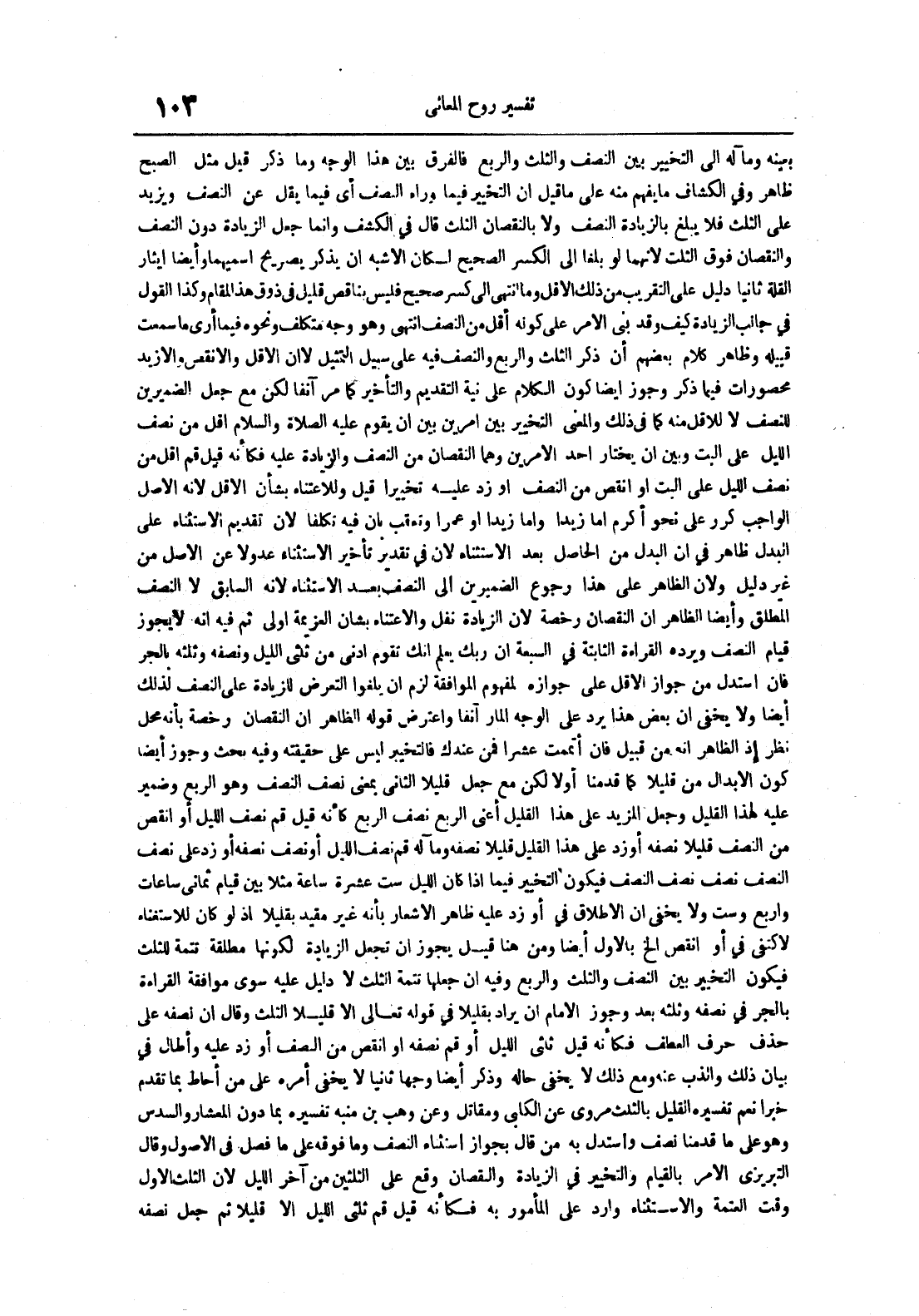 بعينه ومآله إلى التخيير بين النصف والثلث والربع فالفرق بين هذا الوجه وما ذكر قيل مثل الصبح ظاهر وفي الكشاف ما يفهم منه على ما قيل أن التخيير فيما وراء النصف أي فيما يقل عن النصف ويزيد على الثلث فلا يبلغ بالزيادة النصف ولا بالنقصان الثلث قال في الكشف وإنما جعل الزيادة دون النصف والنقصان فوق الثلث لأنهما لو بلغا إلى الكسر الصحيح لكان الأشبه أن يذكر بصريح اسميهما وأيضا إيثار القلة ثانيا دليل على التقريب من ذلك الأقل وما انتهى إلى كسر صحيح فليس بناقص قليل في ذوق هذا المقام وكذا القول في جانب الزيادة كيف وقد بني الأمر على كونه أقل من النصف انتهى وهو وجه متكلف ونحوه فيما أرى ما سمعت قبيله وظاهر كلام بعضهم أن ذكر الثلث والربع والنصف فيه على سبيل التمثيل لا أن الأقل والأنقص والأزيد محصورات فيما ذكر وجوز أيضا كون الكلام على نية التقديم والتأخير كما مر آنفا لكن مع جعل الضميرين للنصف لا للأقل منه كما في ذلك والمعنى التخييرين أمرين بين أن يقوم عليه الصلاة و السلام أقل من نصف الليل على البت وبين أن يختار أحد الأمرين وهما النقصان من النصف والزيادة عليه فكأنه قيل قيل قم أقل من نصف الليل على البت أو انقص من من النصف أو زد عليه تخييرا قيل وللإعتناء بشأن الأقل لأنه الأصل الواجب كرر على نحو أكرم أما زيدا أو عمرا وتعقب بأن فيه تكلفا لأن تقديم الإستثناء على البدل ظاهر في أن البدل من الحاصل بعد الإستثناء لأن في تقدير تأخير الإستثناء عدو لا عن الأصل من غير دليل ولأن الظاهر على هذا رجوع الضميرين إلى النصف بعد الإستثناء لأنه السابق لا النصف المطلق وأيضا الظاهر أن النقصان رخصة لأن الزيادة نقل والإعتناء بشأن العزيمة أولى ثم فيه أنه لا يجوز قيام النصف ويرده القراءة الثابتة في السبعة أن ربك يعلم أنك تقوم أدنى من ثلثي الليل ونصفه وثلثه بالجر فإن استدل من جواز الأقل على جوازه لمفهوم الموافقة لزم أن يلغوا التعرض للزيادة على النصف لذلك أيضا ولا يخفى أن بعض هذا يرد على الوجه المار آنفا واعترض قوله الظاهر أن النقصان رخصة بأنه محل نظر إذ الظاهر أنه من قبيل أتممت عشرا فمن عندك فالتخيير ليس على حقيقته وفيه بحث وجوز أيضا كون الإبدال من قليلا كما قدمنا أولا لكن مع جعل قليلا الثاني بمعنى نصف النصف وهو الربع وضمير عليه لهذا القليل وجعل المزيد على هذا القليل أعني الربع نصف الربع كأنه قيل قم نصف الليل أو انقص من النصف قليلا نصفه أو زد على هذا القليل قليلا نصفه ومآله قم نصف الليل أو نصف نصفه أو زد على نصف النصف نصف نصف النصف فيكون التخيير فيما إذا كان ست عشرة ساعة مثلا بين قيام ثماني ساعات وأربع وست ولا يخفى أن الإطلاق في أو زد عليه ظاهر الإشعار بأنه غير مقيد بقليلا إذ لو كان للإستغناء لاكتفى في أو انقص الخ بالأول أيضا ومن هنا قيل يجوز أن تجعل الزيادة لكونها مطلقة تتمة للثلث فيكون التخيير بين النصف والثلث والربع وفيه أن جعلها تتمة الثلث لا دليل عليه سوى موافقة القراءة بالجر في نصفه وثلثه بعد وجوز الإمام أن يراد بقليلا في قوله تعالى إلا قليلا الثلث وقال إن نصفه على حذف حرف العطف فكأنه قيل ثلثي الليل أو قم نصفه أو انقص من النصف أو زد عليه وأطال في بيان ذلك والذب عنه ومع ذلك لا يخفى حاله وذكر أيضا وجها ثانيا لا يخفى أمره على من أحاط بما تقدم خبرا نعم تفسيره القليل بالثلث مروي عن الكلبي ومقاتل وعن وهب بن منبه تفسيره بما دون المعشار والسدس وهو على ما قدمنا نصف واستدل به من قال بجواز استثناء النصف وما فوقه على ما فصل في الأصول وقال التبريزي الأمر بالقيام والتخيير في الزيادة والنقصان وقع على الثلثين من آخر الليل لأن الثلث الأول وقت العتمة والإستثناء وارد على المأمور به فكأنه قيل قم ثلثي الليل إلا قليلا ثم جعل نصفه