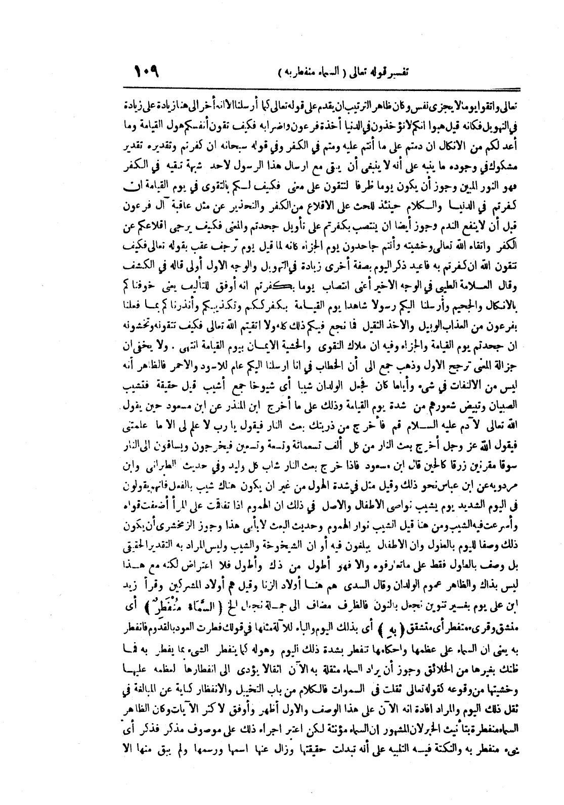 تعالى واتقوا يوما لا يجزي نفس وكان ظاهر الترتيب أن يقدم على قوله تعالى كما أرسلنا إلا أنه أخر إلى هنا زيادة على زيادة في التهويل فكأنه قيل هبوا أنكم لا تؤخذون في الدنيا أخذه فرعون وإضرابه فكيف تقون أنفسكم هول القيامة وما أعد لكم من الإنكال إن دمتم على ما أنتم عليه ومتم في الكفر وفي قوله سبحانه إن كفرتم وتقديره تقدير مشكوك في وجوده ما بينه على أنه لا ينبغي أن يبقى مع إرسال هذا الرسول لأحد شبهة تبقيه في الكفر فهو النور المبين وجوز أن يكون يوما ظرفا لتتقون على معنى فكيف لكم بالتقوى في يوم القيامة إن كفرتم في الدنيا والكلام حينئذ للحث على الإقلاع من الكفر والتحذير عن مثل عاقبة آل فرعون قبل أن لا ينفع الندم وجوز أيضا أن ينتصب بكفرهم على تأويل جحدتم والمعنى فكيف يرجى إقلاعكم عن الكفر واتقاء الله تعالى وخشيته وأنتم جاحدون يوم الجزاء كأنه لما قيل يوم ترجف عقب بقوله تعالى فكيف تتقون الله إن كفرتم به فأعيد ذكر اليوم بصفة أخرى زيادة في التهويل والوجه الأول أولى قاله في الكشف وقال العلامة الطيبي في الوجه الأخير أعني انتصاب يوما بكفرتم أنه أوفق للتأليف يعني خوفناكم بالإنكال والجحيم وأرسلنا إليكم رسولا شاهدا يوم القيامة بكفرككم وتكذيبكم وأنذرناكم بما فعلنا بفرعون من العذاب الوبيل والأخذ الثقيل فما نجع فيكم ذلك كله ولا اتقيتم الله تعالى فكيف تتقونه وتخشونه إن جحدتم يوم القيامة والجزاء وفيه أن ملاك التقوى والخشية الإيمان بيوم القيامة انتهى ولا يخفى أن جزالة المعنى ترجح الأول وذهب جمع إلى أن الخطاب في أنا أرسلنا إليكم عام للأسود والأحمر فالظاهر أنه ليس من الإلتفات في شيء وأيا ما كان فجعل الولدان شيبا أي شيوخا جمع أشيب قيل حقيقة فتشيب الصبيان وتبيض شعورهم من شدة يوم القيامة وذلك على ما أخرج ابن المنذر عن ابن مسعود يقول الله تعالى لآدم عليه السلام فأخرج من ذريتك بعث النار فيقول يا رب لا علم لي إلا بما علمتني فيقول الله عز و جل أخرج بعث النار من كل ألف تسعمائة وتسعة وتسعين فيخرجون ويساقون إلى النار سوقا مقرنين زرقا كالحين قالابن مسعود فإذا خرج بعث النار شاب كل وليد وفي حديث الطبراني وابن مردويه عن ابن عباس نحو ذلك وقيل مثل في شدة الهول من غير أن يكون هناك شيب بالفعل فإنهم يقولون في اليوم الشديد يوم يشيب نواصي الأطفال والأصل في ذلك أن الهموم إذا تفاقمت على المرأ أضعفت قواه وأسرعت فيه الشيب ومن هنا قيل الشيب نوار الهموم وحديث البعث لا يأبى هذا وجوز الزمخشري أن يكون ذلك وصفا لليوم بالطول وإن الأطفال يبلغون فيه أو أن الشيخوخة والشيب وليس المراد به التقدير الحقيقي بل وصف بالطول فقط على ما تعارفوه وإلا فهو أطول من ذاك وأطول فلا اعتراض لكنه مه هذا ليس بذاك والظاهر عموم الولدان وقال السديهم هنا أولاد الزنا وقيل هم أولاد المشركين وقرأ زيد بن علي يوم بغير تنوين نجعل بالنون فالظرف مضاف إلى جملة نجعل الخ السماء منفطر أي منشق وقريء منفطر أي مشتق به أي بذلك اليوم والبناء والباء للآلة مثلها في قولك فطرت العود بالقدوم فانفطر بالقدوم به يعني أن السماء على عظمها وأحكامها تنفطر بشدة ذلك اليوم وهوله كما ينفطر بما يفطر به فما ظنك بغيرها من الخلائق وجوز أن يراد السماء مثقلة به الآن إثقالا يؤدي إلى انفطارها لعظمه وخشيتها من وقوعه كقوله تعالى ثقلت في السماوات فالكلام من باب التخيل والإنفطار كناية عن المبالغة في ثقل ذلك اليوم والمراد إفادة أنه الآن على هذا الوصف والأول أظهر وأوفق لأكثر الآيات وكان الظاهر السماء منفطرة بتأنيث الخبر لأن المشهور أن السماء مؤنثة أعتبر إجراء ذلك على موصوف مذكر فذكر أي شيء منفطر به والنكتة فيه التنبيه على أنه تبدلت حقيقتها وزال عنها اسمها ورسمها ولم يبق منها إلا
