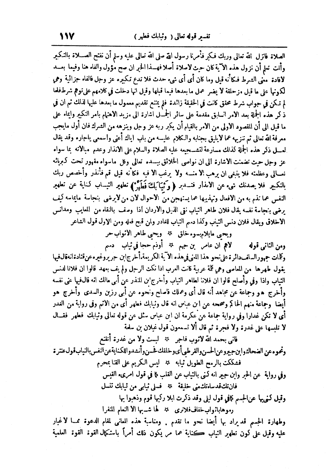 أو ذم حجا في ثياب دسم وكلمات جمهور السلف دائرة على نحو هذا المعنى في الآية الكريمة أخرج ابن جرير وغيره عن قتادة أنه قال فيها يقول طهرها من المعاصي وهي كلمة عربية كانت العرب إذ نكث الرجل ولم يف بعهد قالوا أن فلانا لدنس الثياب وإذا وفي وأصلح قالوا إن فلانا لطاهر الثياب وأخرج ابن المنذر عن أبي مالك أنه قال فيها عني نفسي وأخرج هو وجماعة عن مجاهد أنه قال أي وعملك فأصلح ونحوه عن أبي رزين والسدي وأخرج هو أيضا وجماعة منهم الحاكم وصححه عن ابن عباس أنه قال وثيابك فطهر أيمن الإثم وفي رواية من الغدر أي لا تكن غدارا وفي رواية جماعة عن عكرمة أن ابن عباس سئل عن قوله تعالى وثيابك فطهر لا تلبسها على غدرة ولافجرة ثم قال ألا تسمعون قول غيلان بن سلمة فإني بحمد الله لا ثوب فاجر