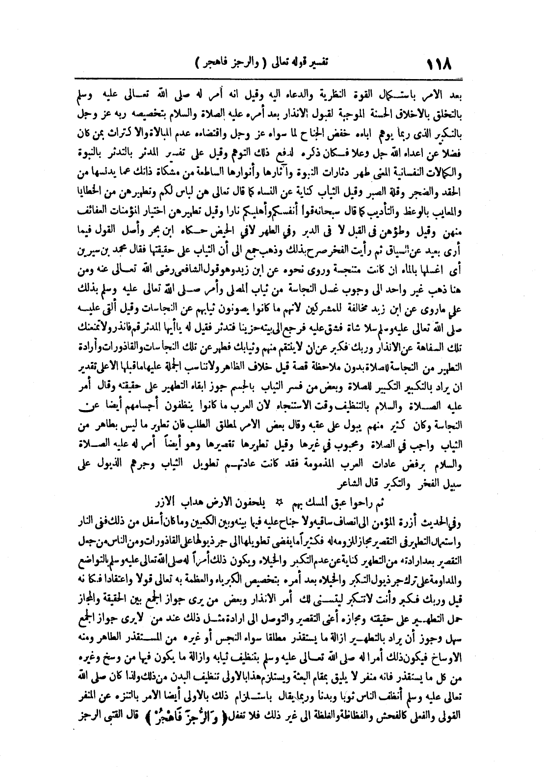 يلحفون الأرض هداب الأزر وفي الحديث أزرة المؤمن إلى أنصاف ساقيه ولا جناح عليه فيما بينه وبين الكعبين وما كان أسفل من ذلك ففي النار واستعمال التطهير في التقصير مجاز للزومه له فكثيرا ما يفضي تطويلها إلى جر ذيولها على القاذورات ومن الناس من جعل التقصير بعد إرادته من التطهير كناية عن عدم التكبر والخيلاء ويكون ذلك أمرا له صلى الله تعالى عليه وسلم بالتواضع والمداومة على ترك جر ذيول التكبر والخيلاء بعد أمره بتخصيص الكبرياء والعظمة به تعالى قولا واعتقادا فكأنه قيل وربك فكبر وأنت لا تتكبر ليتسنى لك أمر الإنذار وبعض من يرى جواز الجمع بين الحقيقة والمجاز حمل التطهير على حقيقته ومجازه أعني التقصير والتوصل إلى إرادة مثل ذلك عند من لا يرى جواز الجمع سهل وجوز أن يراد بالتطهير إزالة مايستقذر مطلقا سواء النجس أو غيره من المستقذر الطاهر ومنه الأوساخ فيكون ذلك أمرا له صلى الله تعالى عليه وسلم بتنظيف ثيابه وإزالة ما يكون فيها من وسخ وغيره منكل ما يستقذر فإنه منفر لا يليق بمقام البعثة ويستلزم هذا بالأولى تنظيف البدن من ذلك ولذا صلى الله تعالى عليه وسلم أنظف الناس ثوبا وبدنا وربما يقال باستلزام ذلك بالأولى أيضا الأمر بالتنزه عن المنفر القولي والفعلي كالفحش والفظاظة والغلظة إلى غير ذلك فلا تغفل والرجز فاهجر قال القتبي الرجز