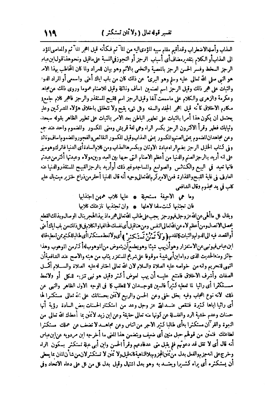 وإن تجتذبها نازعتك كلابها ويقال كل ما ألهى عن الله عز و جل فهو رجز يجب على طالب الله تعالى هجره إذ بهذا الهجر ينال الوصال وبذلك القطع يحصل الإتصال ومن أعظم لاه عن الله تعالى النفس ومن هنا قيل أي نفسك فخالفها والكلام في كل ذلك من باب إياك أعني أو القصد فيه إلى الدوام والثبات كما تقدم ولا تمنن تستكثر أي ولا تعط مستكثرا أي طالبا للكثير ممن تعطيه قاله ابن عباس فهو نهي عن الإستغزار وهو أن يهب شيئا وهو يطمع أن يتعوض من الموهوب له أكثر من الموهوب وهذا جائز ومنه الحديث الذي رواه ابن أبي شيبة موقوفا على شريح المستغزر يثاب من هبته والأصح عند الشافعية أن النهي للتحريم وإنه من خواصه عليه الصلاة و السلام لأن الله تعالى اختار له عليه الصلاة و السلام أكمل الصفات وأشرف الأخلاق فامتنع عليه أن يهب لعوض أكثر وقيل هو نهي تنزيه للكل أو ولا تعط مستكثرا أي رائيا لما تعطيه كثيرا فالسين للوجدان لا للطلب كما في الوجه الأول الظاهر والنهي عن ذلك لأنه نوع إعجاب وفيه بخل خفي وعن الحسن والربيع لا تمنن بحسناتك على الله تعالى مستكثرا لها أي رائيا إياها كثيرة فتنقص عند الله عز و جل وعد من استكثار الحسنات بعض السادة رؤية أنها حسنات وعدم خشية الرد والغفلة عن كونها منه تعالى حقيقة وعن ابن زيد لا تمنن بما أعطاك الله تعالى من النبوة والقرآن مستكثرا به أي طالبا كثير الأجر من الناس وعن مجاهد لا تضعف عن عملك مستكثرا لطاعتك فتمنن من قولهم حبل منين أي ضعيف ويتضمن هذاالمعنى ما أخرجه ابن مردويه عن ابن عباس أنه قال أي لا تقل قد دعوتهم فلم يقبل مني عد فادعهم وقرأ الحسن وابن أبي عبلة تستكثر بسكون الراء وخرج على أنه جزم والفعل بدل من تمنن المجزوم بلا الناهية كأنه قيل ولا تمنن لا تستكثر لأن من شأن المان بما يعطي أن يستكثره أي يراه كثيرا ويعتد به وهو بدل اشتمال وقيل بدل كل من كل على دعاء الإتحاد وفي