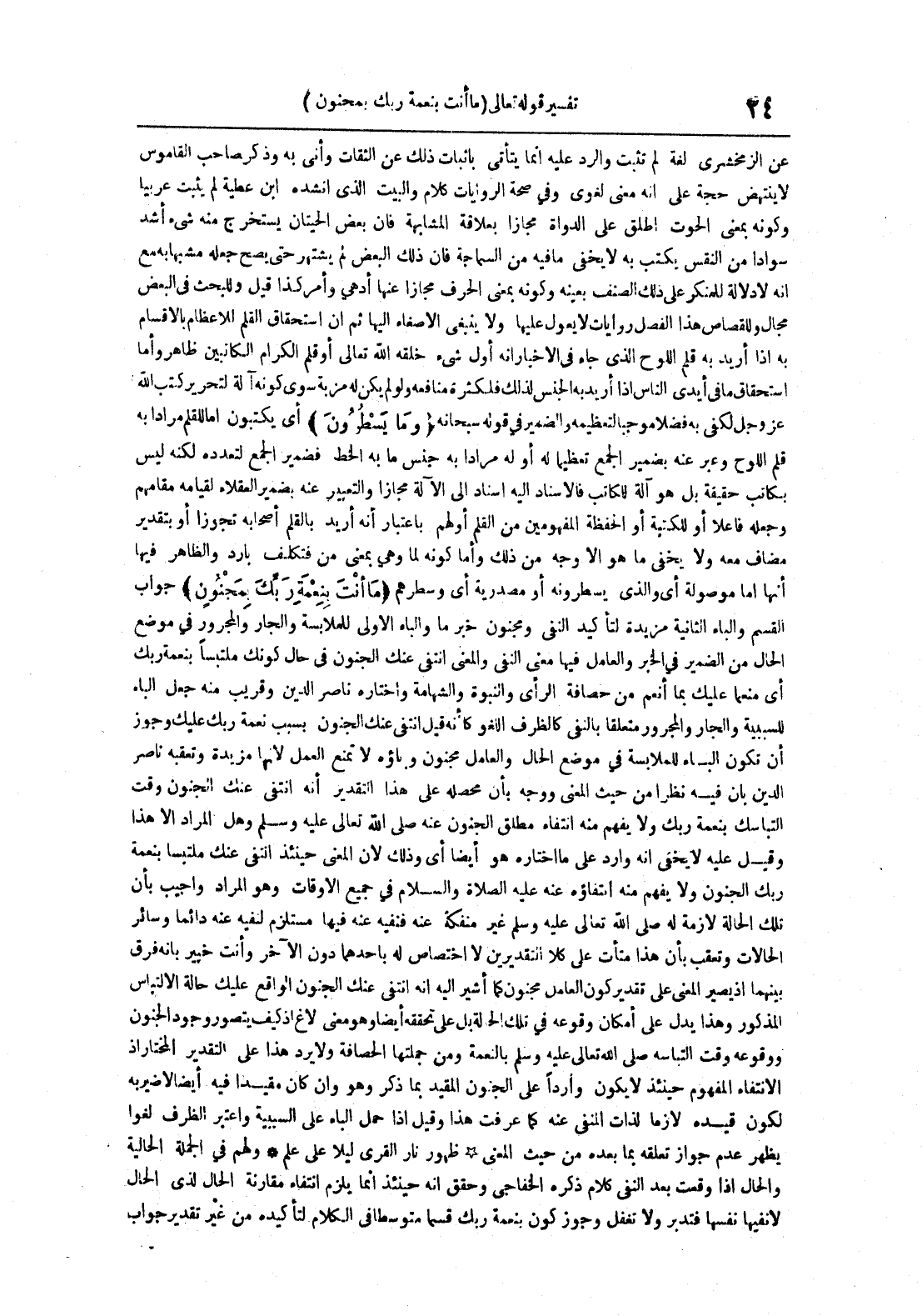 ما أنت بنعمة ربك بمجنون جواب القسم والباء الثانية مزيدة لتأكيد النفي ومجنون خبر ما والباء الأولى للملابسة والجار والمجرور في موضع الحال من الضمير في الخبر والعامل فيها معنى النفي والمعنى انتفى عنك الجنون في حال كونك ملتبسا بنعمة ربك منعما عليك بما أنعم من حصافة الرأي والنبوة والشهامة واختاره ناصر الدين وقريب منه جعل الباء للسببية والجار والمجرور متعلقا بالنفي كالظرف اللغو كأنه قيل انتفى عنك الجنون بسبب نعمة ربك عليك وجوز أن تكون الباء للملابسة في موضع الحال والعامل مجنون وباؤه لا تمنع العمل لأنها مزيدة وتعقبه ناصر الدين بأن فيه نظرا من حيث المعنى ووجه بأن محصله على هذا التقدير أنه انتفى عنك الجنون وقت التباسك بنعمة ربك ولا يفهم منه انتفاء مطلق الجنون عنه صلى الله تعالى عليه وسلم وهل المراد إلا هذا وقيل عليه لا يخفى أنه وارد على ما اختاره هو أيضا أي وذلك لأن المعنى حينئذ انتفى عنك ملتبسا بنعمة ربك الجنون ولا يفهم منه انتفاؤه عنه عليه الصلاة و السلام في جميع الأوقات وهو المراد وأجيب بأن تلك الحالة لازمة له صلى الله تعالى عليه وسلم غير منفكة عنه فنفيه عنه فيها مستلزم لنفيه عنه دائما وسائر الحالات وتعقب بأن هذا متأت على كلا التقديرين لا اختصاص له بأحدهما دون الآخر وأنت خبير بأنه فرق بينهما إذ يصير المعنى على تقدير كون العامل مجنون كما أشير إليه أنه انتفى عنك الجنون الواقع عليك حالة الإلتباس المذكور وهذا يدل على إمكان وقوعه في تلك الحالة بل على تحققه أيضا وهو معنى لاغ إذ كيف يتصور وجود الجنون ووقوعه وقت التباسه صلى الله تعالى عليه وسلم بالنعمة ومن جملتها الحصافة ولا يرد هذا على التقدير المختار إذ الإنتفاء المفهوم حينئذ لا يكون واردا على الجنون المقيد بما ذكر وهو وإن كان مقيدا فيه أيضا لا ضير به لكون قيده لازما لذات المنفي عنه كما عرفت هذا وقيل إذا حمل الباء على السببية واعتبر الظرف لغوا يظهر عدم جواز تعلقه بما بعده من حيث المعنى