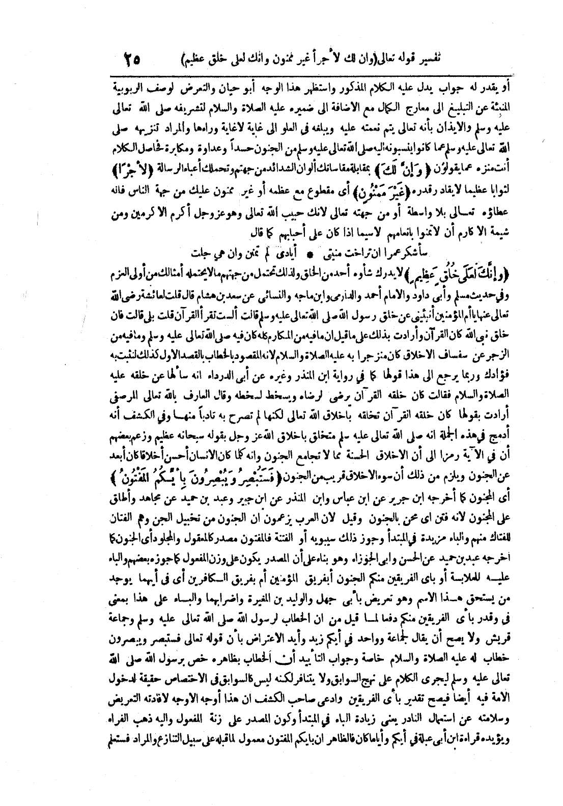 وإنك لعلى خلق عظيم لا يدرك شأوه أحد من الخلق ولذلك تحتمل من جهتهم ما لا يحتمله أمثالك من أولي العزم وفي حديث مسلم وأبي داود والإمام أحمد والدارمي وابن ماجه والنسائي عن سعد بن هشام قال قلت لعائشة رضي الله تعالى عنها يا أم المؤمنين أنبئيني عن خلق رسول الله صلى الله تعالى عليه وسلم قالت ألست تقرأ القرآن قلت بلى قالت فإن خلق نبي الله كان القرآن وأرادت بذلك على ما قيل أن ما فيه من المكارم كله كان فيه صلى الله تعالى عليه وسلم وما فيه من الزجر عن سفساف الأخلاق كان منزجرا به عليه الصلاة و السلام لأنه المقصود بالخطاب بالقصد الأول كذلك لنثبت به فؤادك وربما يرجع إلى هذا قولها كما في رواية ابن المنذر وغيره عن أبي الدرداء أنه سألها عن خلقه عليه الصلاة و السلام فقالت كان خلقه القرآن يرضى لرضاه ويسخط لسخطه وقال العارف بالله تعالى المرصفي أرادت بقولها كان خلقه القرآن تخلقه بأخلاق الله تعالى لكنها لم تصرح به تأدبا منها وفي الكشف أنه أدمج في هذه الجملة أنه صلى الله تعالى عليه وسلم متخلق بأخلاق الله عز و جل بقوله سبحانه عظيم وزعم بعضهم أن في الآية رمزا إلى أن الأخلاق الحسنة مما لا تجامع الجنون وأنه كلما كان الإنسان أحسن أخلاقا كان أبعد عن الجنون ويلزم من ذلك أن سوء الأخلاق قريب من الجنون