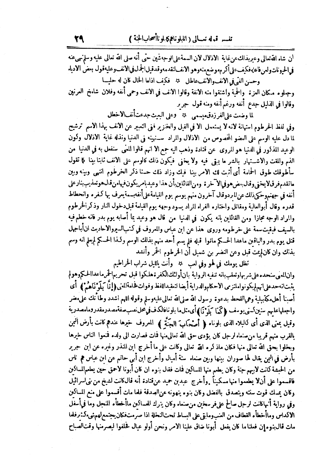 أصحاب الجنة المعروف خيرها عندهم كانت بأرض اليمن بالقرب منهم قريبا من صنعاء لرجل كان يؤدي حق الله تعالى منها فمات فصارت إلى ولده فمنعوا الناس خيرها وبخلوا بحق الله تعالى منها فكان ما ذكره الله تعالى وكانت على ما أخرج ابن المنذر وغيره عن ابن جرير بأرض في اليمن يقال لها صوران بينها وبين صنعاء ستة أميال وأخرج ابن أبي حاتم عن ابن عباس هم ناس من الحبشة كانت لأبيهم جنة وكان يطعم منها المساكين فمات فقال بنوه إن كان أبونا لأحمق حين يطعم المساكين فأقسموا على أن لا يطعموا منها مسكينا وأخرج عبد بن حميد عن قتادة أنه قال كانت لشيخ من بني إسرائيل وكان يمسك قوت سنته ويتصدق بالفضل وكان بنوه ينهونه عن الصدقة فلما مات أقسموا على منع المساكين وفي رواية أنها كانت لرجل صالح على فرسخين من صنعاء وكان يترك للمساكين ما أخطأه المنجل وما في أسفل الأكداس وما أخطأه القطاف من العنب وما بقي على البساط تحت النخلة إذا صرمت فكان يجتمع لهم شيء كثير فلما مات قال بنوه إن فعلنا ما كان يفعل أبونا ضاق علينا الأمر ونحن أولو عيال فحلفوا ليصرمنها وقت الصباح