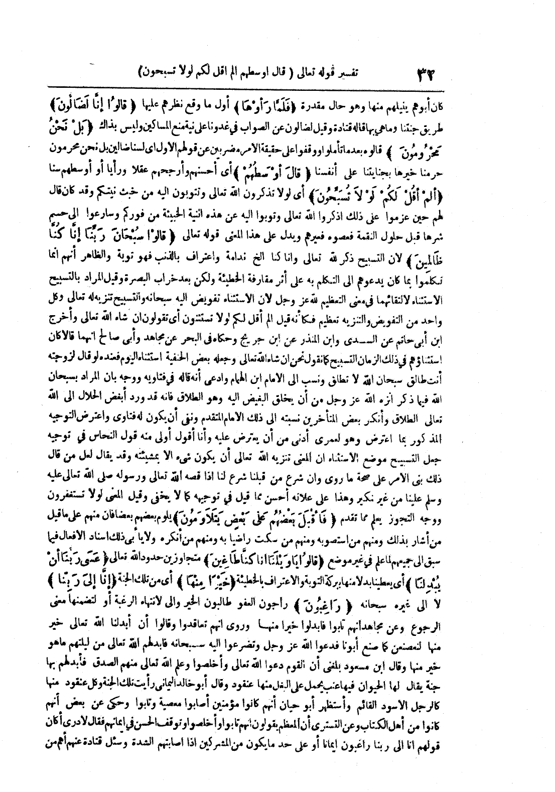 ويدل على هذا المعنى قوله تعالى قالوا سبحان ربنا إنا كنا ظالمين لأن التسبيح ذكر لله تعالى وإنا كنا الخ ندامة واعتراف بالذنب فهو توبة والظاهر أنهم إنما تكلموا بما كان يدعوهم إلى التكلم به على أثر مقارفة الخطيئة ولكن بعد خراب البصرة وقيل المراد بالتسبيح الإستثناء لالتقائهما في معنى التعظيم لله عز و جل لأن الإستثناء تفويض إليه سبحانه والتسبيح تنزيه له تعالى وكل واحد من التفويض والتنزيه تعظيم فكأنه قيل ألم أقل لكم لولا تسثنون أي تقولون إن شاء الله تعالى وأخرج ابن أبي حاتم عن السدي وابن المنذر عن ابن جريج وحكاه في البحر عن مجاهد وأبي صالح أنهما قالا كان استثناؤهم في ذلك الزمان التسبيح كما نقول نحن إن شاء الله تعالى وجعله بعض الحنفية استثناء اليوم فعنده لو قال لزوجته أنت طالق سبحان الله لا تطلق ونسب إلى الإمام ابن الهمام وادعى أنه قاله في فتاويه ووجه بأن المراد بسبحان الله فيما ذكر أنزه الله عز و جل من أن يخلق البغيض إليه وهو الطلاق فإنه قد ورد أبغض الحلال إلى الله تعالى الطلاق وأنكر بعض المتأخرين نسبته إلى ذلك الإمام المتقدم ونفي أن يكون له فتاوي واعترض التوجيه المذكور بما اعترض وهو لعمري أدنى من أن يعترض عليه وأنا أقول أولى منه قول النحاس في توجيه جعل التسبيح موضع الإستثناء أن المعنى تنزيه الله تعالى أن يكون شيء إلا بمشيئته وقد يقال لعل من قال ذلك بنى الأمر على صحة ما روي وإن شرع من قبلنا شرع لنا إذا قصه الله تعالى ورسوله صلى الله تعالى عليه وسلم علينا من غير نكير وهذا على علاته أحسن مما قيل في توجيهه كما لا يخفى وقيل المعنى لولا تستغفرون ووجه التجوز يعلم مما تقدم