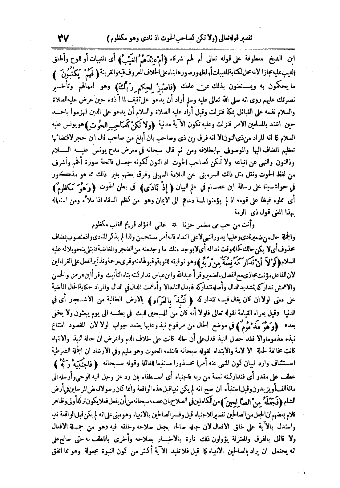 ولا تكن كصاحب الحوت هو يونس عليه السلام كما أنه المراد من ذي النون إلا أنه فرق بين ذي وصاحب بأن أبلغ من صاحب قال ابن حجر لاقتضائها تعظيم المضاف إليها والموصوف بها بخلافه ومن ثم قال سبحانه في معرض مدح يونس عليه السلام وذا النون والنهي عن اتباعه ولا تكن كصاحب الحوت إذ النون لكونه جعل فاتحة سورة أفخم وأشرف من لفظ الحوت ونقل مثل ذلك السرميني عن العلامة السهيلي وفرق بعضهم بغير ذلك مما هو مذكور في حواشينا على رسالة ابن عصام في علم البيان