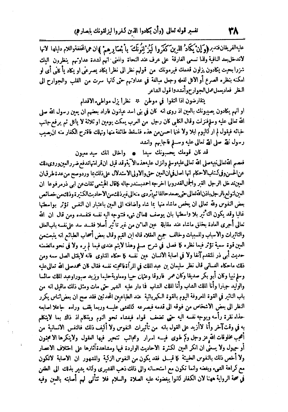 فعصم الله تعالى نبيه صلى الله تعالى عليه وسلم وأنزل عليه هذه الآية وقد قيل أن قراءتها تدفع ضرر العين وروي ذلك عن الحسن وفي كتاب الأحكام أنها أصل في أن العين حق والأولى الإستدلال على ذلك بما ورد وصح من عدة طرق أن العين تدخل الرجل القبر والجمل القدر وبما أخرجه أحمد بسند رجاله كما قال الهيثمي ثقات عن أبي ذر مرفوعا أن العين لتولع بالرجل بإذن الله تعالى حتى يصعد حالقا ثم يتردى منه إلى غير ذلك من الأحاديث الكثيرة وذلك من خصائص بعض النفوس ولله تعالى أن يخص ما شاء منها بما شاء وإضافته إلى العين باعتبار أن النفس تؤثر بواسطتها غالبا وقد يكون التأثير بلا واسطتها بأن يوصف للعائن شيء فتتوجه إليه نفسه فتفسده ومن قال أن الله تعالى أجرى العادة بخلق ما شاء عند مقابلة عين العائن من غير تأثير أصلا فقد سد على نفسه باب العلل والتأثيرات والأسباب والمسببات وخالف جميع العقلاء قاله ابن القيم وقال بعض أصحاب الطبائع أنه ينبعث من العين قوة سمية تؤثر فيها نظره كما فصل في شرح مسلم وهذا لا يتم عندي فيما لم يره ولا في نحو ما تضمنه حديث أبي ذر المتقدم آنفا ولا في إصابة الإنسان عين نفسه كما حكاه المناوي فإنه لا يقتل الصل سمه ومن ذلك ما حكاه الغساني قال نظر سليمان بن عبد الملك في المرآة فأعجبته نفسه فقال كان محمد صلى الله تعالى عليه وسلم نبيا وكان أبو بكر صديقا وكان عمر فاروقا وعثمان حييا ومعاوية حليما ويزيد صبورا وعبد الملك سائسا والوليد جبارا وأنا الملك الشاب وأنا الملك الشاب فما دار عليه الشهر حتى مات ومثل ذلك ما قيل أنه من باب التأثير في القوة المعروفة اليوم بالقوة الكهربائية عند الطباعيين المحدثين فقد صح أن بعض الناس يكرر النظر إلى بعض الأشخاص من فوقه إلى قدمه فيصرعه كالمغشي عليه وربما يقف وراءه جاعلا أصابعه حذاء نقرة رأسه ويوجه نفسه إليه حتى تضعف قواه فيغشاه نحو النوم ويتكلم إذ ذاك بما لا يتكلم به في وقت آخر وأنا لا أزيد على القول بأنه من تأثيرات النفوس ولا أكيف ذلك فالنفس الإنسانية من أعجب مخلوقات الله عز و جل وكم طوى فيه أسرارا وعجائب تتحير فيها العقول ولا ينكرها إلا مجنون أو جهول ولا يسعني أن أنكر العين لكثرة الأحاديث الواردة فيها ومشاهدة آثارها على اختلاف الأعصار ولا أخص ذلك بالنفوس الخبيثة كما قيل فقد يكون من النفوس الزكية والمشهور أن الإصابة لا تكون مع كراهة الشيء وبغضه وإنما تكون مع استحسانه وإلى ذلك ذهب القشيري وكأنه يشير بذلك إلى الطعن في صحة الرواية ههنا لأن الكفار كانوا يبغضونه عليه الصلاة و السلام فلا تتأتى لهم إصابته بالعين وفيه