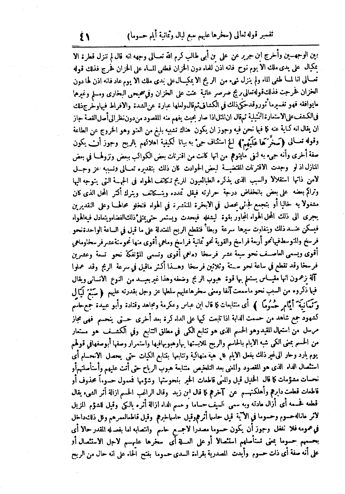 سبع ليال وثمانية أيام حسوما أي متتابعات كما قال ابن عباس وعكرمة ومجاهد وقتادة وأبو عبيدة جمع حاسم كشهود جمع شاهد من حسمت الدابة إذا تابعت كيها على الداء كرة بعد أخرى حتى ينحسم فهي مجاز مرسل من استعمال المقيد وهو الحسم الذي هو تتابع الكي في مطلق التتابع وفي الكشف هو مستعار من الحسم بمعنى الكي شبه الأيام بالحاسم والريح لملابستها بها وهبوبها فيها واستمرار وصفها بوصفها في قولهم يوم بارد وحار إلى غير ذلك بفعل الأيام كل هبة منها كية وتتابعها بتتابع الكيات حتى يحصل الإنحسام أي استئصال الداء الذي هو المقصود والمعنى بعد التلخيص متتابعة هبوب الرياح حتى أتت عليهم واستأصلتهم أو نحسات مشؤمات كما قال الخليل قيل والمعنى قاطعات الخير بنحوستها وشؤمها فمعمول حسوما محذوف أو قاطعات قطعت دابرهم وأهلكتهم عن آخرهم كما قال ابن زيد وقال الراغب الحسم إزالة الشيء أثر الشيء يقال قطعه فحسمه أي أزال مادته وبه سمي السيف حساما وحسم الداء إزالة أثره بالكي وقيل للشؤم المزيل لأثر ما ناله حسوم وحسوما في الآية قيل حاسما أثرهم وقيل حاسما خبرهم وقيل قاطعا لعمرهم وكل ذلك داخل في عمومه فلا تغفل وجوز أن يكون حسوما مصدرا لا جمع حاسم وانتصابه إما بفعله المقدر حالا أي بحسمهم حسوما بمعنى تستأصلهم استئصالا أو على العلة أي سخرها عليهم لأجل الإستئصال أو على أنه صفة أي ذات حسوم وأيدت المصدرية بقراءة السدي حسوما بفتح الحاء على أنه حال من الريح