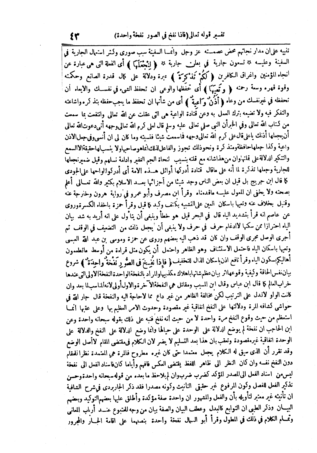 فإذا نفخ في الصور نفخة واحدة شروع بيان نفس الحاقة وكيفية وقوعها أثر بيان عظم شأنها بإهلاك مكذبيها والمراد بالنفخة الواحدة النفخة الأولى التي عندها خراب العالم كما قال ابن عباس وقال ابن المسيب ومقاتل هي النفخة الآخرة والأول أولى لأنه المناسب لما بعد وإن كانت الواو لا تدل على الترتيب لكن مخالفة الظاهر من غير داع مما لا حاجة إليه والنفخة قال جار الله في حواشي كشافه المرة ودلالتها على النفخ اتفاقية غير مقصودة وحدوث الأمر العظيم بها وعلى عقبها إنما استعظم من حيث وقوع النفخ مرة واحدة لا من حيث أنه نفخ فنبه على ذلك بقوله سبحانه واحدة وعن ابن الحاجب أن نفخة لم يوضع للدلالة على الوحدة على حيالها وإنما وضع للدلالة على النفخ والدلالة على الوحدة اتفاقية غير مقصودة وتعقب بأن هذا بعد التسليم لا يضر لأن الكلام في مقتضى المقام لا أصل الوضع وقد تقرر أن الذي سيق له الكلام يجعل معتمدا حتى كان غيره مطروح فالمرة هي المعتمدة نظرا للمقام دون النفخ نفسه وإن كان النظر إلى ظاهر اللفظ يقتضي العكس فافهم وأيا ما كان فإسناد الفعل إلى نفخة ليس من إسناد الفعل إلى المصدر المؤكد كضرب ضرب وإن لم يلاحظ ما بعده من قوله سبحانه واحدة وحسن تذكير الفعل للفصل وكون المرفوع غير حقيقي التأنيث وكونه مصدرا فقد ذكر الجاربردي في شرح الشافية أن تأنيثه غير معتبر لتأويله بأن والفعل والمشهور أن واحدة صفة مؤكدة وأطلق عليها بعضهم التوكيد وبعضهم البيان وذكر الطيبي أن التوابع كالبدل وعطف البيان والصفة بيان من وجه للمتبوع عند أرباب المعاني وتمام الكلام في ذلك في المطول وقرأ أبو السمال نفخة واحدة بنصبهما على إقامة الجار والمجرور