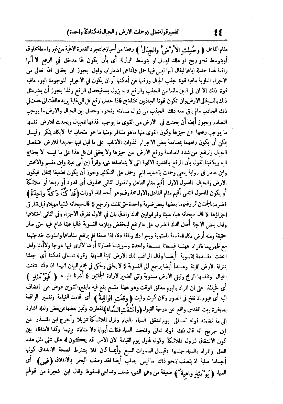 وحملت الأرض والجبال رفعتا من أحيازهما بمجرد القدرة الإلهية من غير واسطة مخلوق أو بتوسط نحو ريح أو ملك قيل أو بتوسط الزلزلة أي بأن يكون لها مدخل في الرفع لا أنها رافعة لهما حاملة إياها ليقال أنها ليس فيها حمل وإنما هي إضطراب وقيل يجوز أن يخلق الله تعالى من الأجرام العلوية ما فيه قوة جذب الجبال ورفعها عن أماكنها أو أن يكون في الأجرام الموجودة اليوم ما فيه قوة ذلك إلا أن في البين مانعا من الجذب والرفع وأنه يزول بعد فيحصل الرفع وكذا يجوز أن يعتبر مثل ذلك بالنسبة إلى الأرض وأن تكون قوتا الجاذبين مختلفتين فإذا حصل رفع كل إلى غاية يريدها الله تعالى حدث في ذلك الجاذب ما لم يبق معه ذلك الجذب من زوال مسامته ونحوه وحصل بين الجبال والأرض ما يوجب التصادم ويجوز أيضا أن يحدث في الأرض من القوى ما يوجب قذفها للجبال ويحدث للأرض نفسها ما يوجب رفعها عن حيزها وكون القوى منها ما هو متنافر ومنها ما هو متحاب مما لا يكاد ينكر وقيل يمكن أن يكون رفعهما بمصادمة بعض الأجرام كذوات الأذناب على ما قيل فيها جديدا للأرض فتنفصل الجبال وترتفع من شدة المصادمة ورفع الأرض من حيزها ولا يخفى أن كل هذا على ما فيه لا يحتاج إليه ويكفينا القول بأن الرفع بالقدرة الإلهية التي لا يتعاصاها شيء وقرأ ابن أبي عبلة وابن مقسم والأعمش وابن عامر في رواية يحيى وحملت بتشديد الميم وحمل على التكثير وجوز أن يكون تضعيفا للنقل فيكون الأرض والجبال المفعول الأول أقيم مقام الفاعل والمفعول الثاني محذوف أي قدرة أو ريحا أو ملائكة أو يكون المفعول الثاني أقيم مقام الفاعل والأول محذوف وهو أحد المذكورات