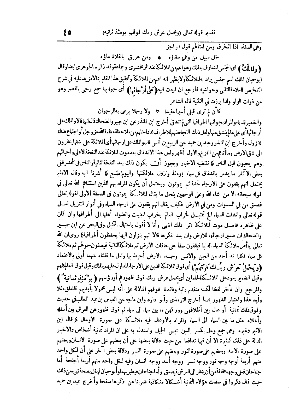يومئذ ثمانية والمرجع وإن تأخر لفظا لكنه متقدم رتبة وفائدة فوقهم الدلالة على أنه ليس محمولا بأيديهم كالمعلق مثلا وأيد هذا واعتبار الظهور بما أخرج الترمذي وأبود داود وابن ماجه عن العباس بن عبد المطلب في حديث وفوق ذلك ذلك ثمانية أوعال بين أظلافهن ووركهن ما بين سماء إلى سماء ثم فوق ظهورهن العرش بين أسفله وأعلاه مثل ما بين السماء إلى السماء والمراد بالأوعال وفيه ملائكة على صورة الأوعال كما قال ابن الأثير وغيره وهي جمع وعل بكسر العين تيس الجبل واستدل به على أن المراد ثمانية أشخاص والأخبار الدالة على ذلك كثيرة إلا أن فيها تدافعا من حيث دلالة بعضها على أن بعضهم على صورة الإنسان وبعضهم على صورة الأسد وبعضهم على صورة الثور وبعضهم على صورة النسر ودلالة بعض آخر على أن لكل واحد منهم أربعة أوجه وجه ثور ووجه نسر ووجه أسد ووجه إنسان وفيه لكل واحد منهم أربعة أجنحة أما جناحان فعلى وجهه مخافة من أن ينظر إلى العرش فيصعق وأما جناحان فيطير بهما وأبو حيان لم يقل بصحة شيء من ذلك حيث قال ذكروا في صفات هؤلاء الثمانية أشكالا متكاذبة ضربنا عن ذكرها صحفا وأخرج عبد بن حميد