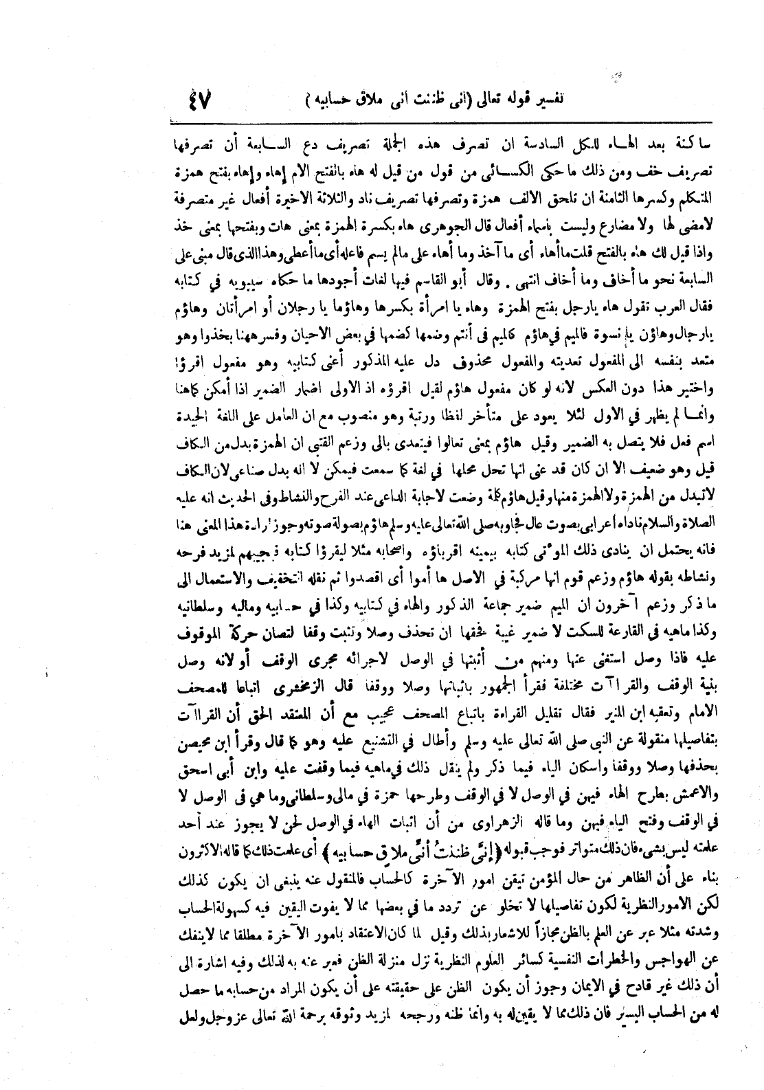 ساكنة بعد الهاء للكل السادسة أن تصرف هذه الجملة تصريف دع السابعة أن تصرفها تصريف خف ومن ذلك ما حكى الكسائي من قول من قيل له هاء بالفتح الأم إهاء وإهاء بفتح همزة المتكلم وكسرها الثامنة أن تلحق الألف همزة وتصرفها تصريف ناد والثلاثة الأخيرة أفعال غير متصرفة لا ماضي لها ولا مضارع وليست بأسماء أفعال قال الجوهري هاء بكسرة الهمزة بمعنى هات وبفتحها بمعنى خذ وإذا قيل لك هاء بالفتح قلت ما أهاء أي ما آخذ وما أهاء على ما لم يسم فاعله أي ما أعطى وهذا الذي قال مبني على السابعة نحو ما أخاف وما أخاف انتهى وقال أبو القاسم فيها لغات أجودها ما حكاه سيبويه في كتابه فقال العرب تقول هاء يا رجل بفتح الهمزة وهاء يا امرأة بكسرها وهاؤما يا رجلان أو امرأتان وهاؤم يا رجال وهاؤن يا نسوة فالميم في هاؤم كالميم في أنتم وضمها كضمها في بعض الأحيان وفسر ههنا بخذوا وهو متعد بنفسه إلى المفعول تعديته والمفعول محذوف دل المذكور أعني كتابيه وهو مفعول اقرؤا واختير هذا دون العكس لأنه لو كان مفعول هاؤم لقيل اقرؤه إذ الأولى إضمار الضمير إذا أمكن كما هنا وإنما لم يظهر في الأول لئلا يعود على متأخر لفظا ورتبة وهو منصوب مع أن العامل على اللغة الجيدة اسم فعل فلا يتصل به الضمير وقيل هاؤم بمعنى تعالوا فيتعدى بإلى وزعم القتبي أن الهمزة بدل من الكاف قيل وهو ضعيف إلا أن كان قد عني أنها تحل محلها في لغة كما سمعت فيمكن لا أنه بدل صناعي لأن الكاف لا تبدل من الهمزة ولا الهمزة منها وقيل هاؤم كلمة وضعت لإجابة الداعي عند الفرح والنشاط وفي الحديث أنه عليه الصلاة و السلام ناداه أعرابي بصوت عال فجاوبه صلى الله تعالى عليه وسلم هاؤم بصولة صوته وجوز إرادة هذا المعنى هنا فإنه يحتمل أن ينادي ذلك المؤتى كتابه بيمينه اقرباؤه وأصحابه مثلا ليقرؤا كتابه فيجيبهم لمزيد فرحه ونشاطه بقوله هاؤم وزعم قوم أنها مركبة في الأصل ها أموا أي اقصدوا ثم نقله التخفيف والإستعمال إلى ما ذكر وزعم آخرون أن الميم ضمير جماعة الذكور والهاء في كتابيه وكذا في حسابيه وماليه وسلطانيه وكذا ما هيه في القارعة للسكت لا ضمير غيبة فحقها أن تحذف وصلا وتثبت وقفا لتصان حركة الموقوف عليه فإذا وصل استغنى عنها ومنهم من أثبتها في الوصل لإجرائه مجرى الوقف أو لأنه وصل بنية الوقف والقراآت مختلفة فقرأ الجمهور بإثباتها وصلا ووقفا قال الزمخشري اتباعا للمصحف الإمام وتعقبه ابن المنير فقال تقليل القراءة باتباع المصحف عجيب مع أن المعتقد الحق أن القراآت بتفاصيلها منقولة عن النبي صلى الله تعالى عليه وسلم وأطال في التشنيع عليه وهو كما قال وقرأ ابن محيصن بحذفها وصلا ووقفا وإسكان الياء فيما ذكر ولم ينقل ذلك في ماهية فيما وقفت عليه وابن أبي إسحاق والأعمش بطرح الهاء فيهن في الوصل لا في الوقف وطرحها حمزة في مالي وسلطاني وما هي في الوصل لا في الوقف وفتح الياء فيهن وما قاله الزهراوي من أن إثبات الهاء في الوصل لحن لا يجوز عند أحد علمته ليس بشيء فإن ذلك متواتر فوجب قبوله