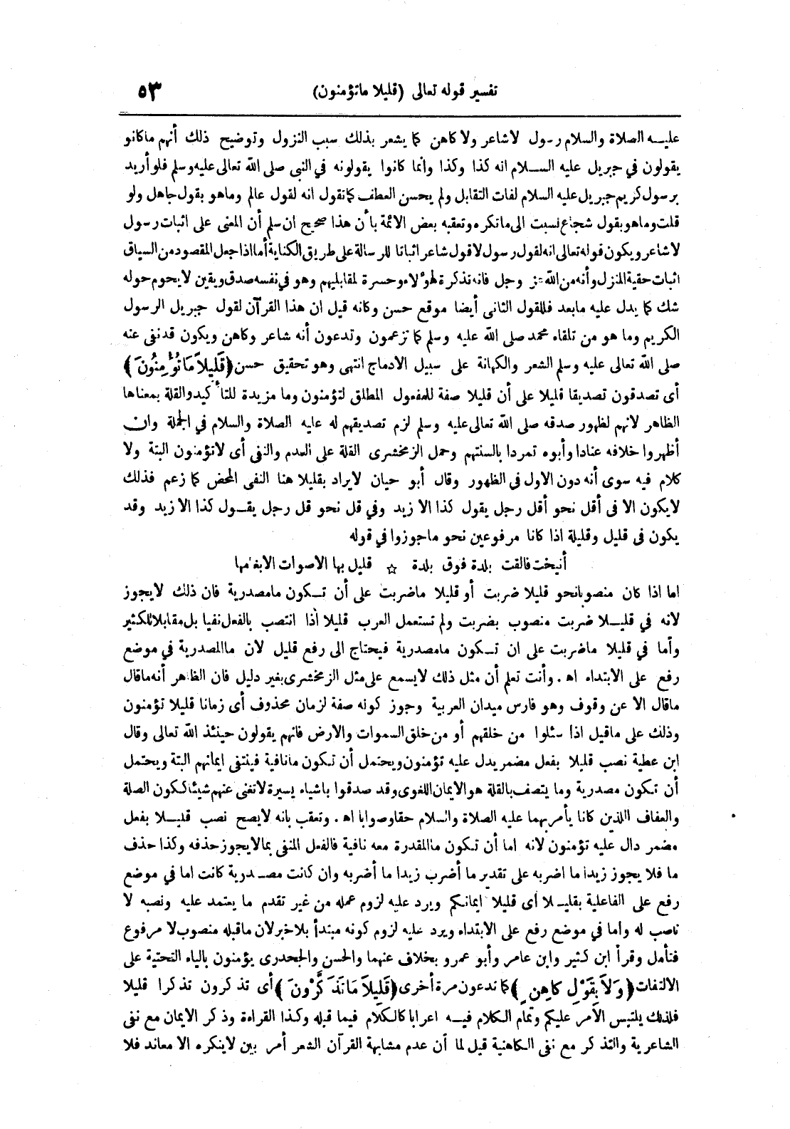 وتعقب بأنه لا يصح نصب قليلا بفعل مضمر دال عليه تؤمنون لأنه إما أن تكون ما المقدرة معه نافية فالفعل المنفي بما لا يجوز حذفه وكذا حذفه ما فلا يجوز زيدا ما أضربه على تقدير ما أضرب زيدا ما أضربه وإن كانت مصدرية كانت إما في موضع رفع على الفاعلية بقليلا أي قليلا إيمانكم ويرد عليه لزوم عمله من غير تقدم ما يعتمد عليه ونصبه لا ناصب له وأما في موضع رفع على الإبتداء ويرد عليه لزوم كونه مبتدأ بلا خبر لأن ما قبله منصوب لا مرفوع فتأمل