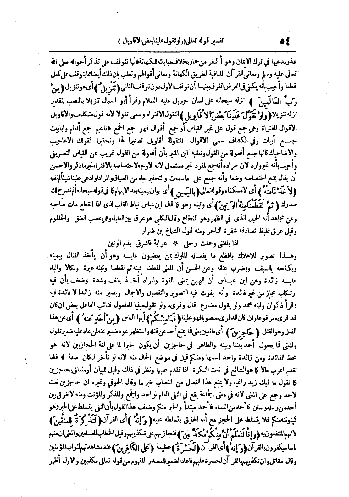 ولو تقول علينا بعض الأقاويل التقول الإفتراء وسمي تقولا لأنه قول متكلف والأقاويل الأقوال المفتراة وهي جمع قول على غير القياس أو جمع أقوال فهو جمع كأناعيم جمع أنعام وأبابيت جمع أبيات وفي الكشاف سمي الأقوال المتقولة أقاويل تصغيرا لها وتحقيرا كقولك الأعاجيب والأضاحيك كأنها جمع أفعولة من القول وتعقبه ابن المنذر بأن أفعولة من القول غريب عن القياس التصريفي وأجيب بأنه غير وارد لأن مراده أنه جمع لمفرد غير مستعمل لأنه لا وجه لاختصاصه بالإفتراء غير ما ذكر والأحسن أن يقال بمنع اختصاصه وضعا وأنه جمع على ما سمعت والتحقير جاء من السياق والمراد لو ادعى علينا شيئا لم نقله