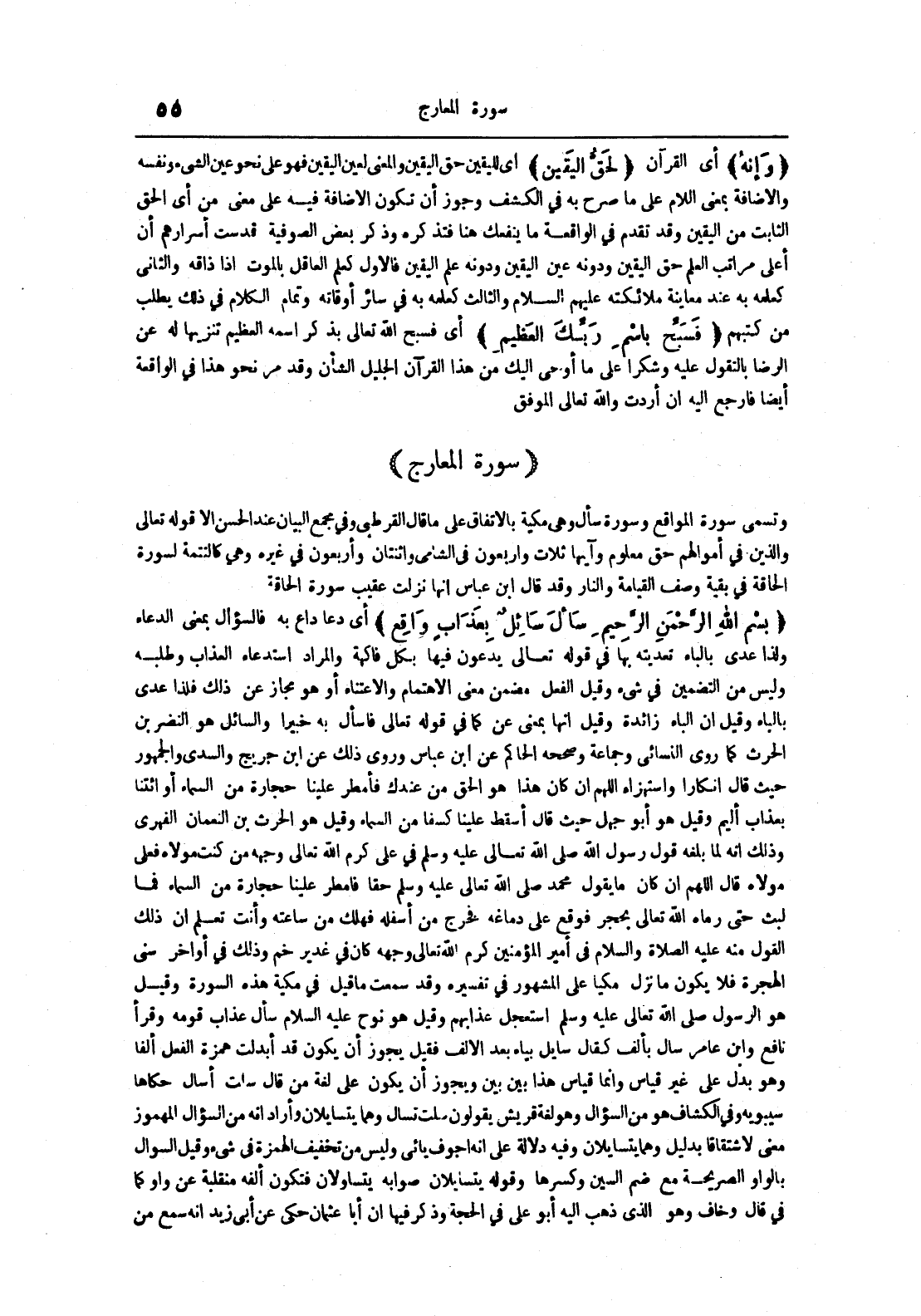 بسم الله الرحمن الرحيم سأل سائل بعذاب واقع أي دعا داع به فالسؤال بمعنى الدعاء ولذا عدي بالباء تعديته بها في قوله تعالى يدعون فيها بكل فاكهة والمراد استدعاء العذاب وطلبه وليس من التضمين في شيء وقيل الفعل مضمن معنى الإهتمام والإعتناء أو هو مجاز عن ذلك فلذا عدي بالباء وقيل إن الباء زائدة وقيل أنها بمعنى عن كما في قوله تعالى فاسأل به خبيرا والسائل هو النضر بن الحرث كما روى النسائي وجماعة وصححه الحاكم عن ابن عباس وروي ذلك عن ابن جريج والسدي والجمهور حيث قال إنكار واستهزاء اللهم إن كان هذا هو الحق من عندك فأمطر علينا حجارة من السماء أو ائتنا بعذاب أليم وقيل هو أبو جهل حيث قال أسقط علينا كسفا من السماء وقيل هو الحرث بن النعمان الفهري وذلك أنه لما بلغه قول رسول الله صلى الله عليه و سلم في علي كرم الله تعالى وجهه من كنت مولاه فعلي مولاه قال اللهم إن كان ما يقول محمد صلى الله تعالى عليه وسلم حقا فأمطر علينا حجارة من السماء فما لبث حتى رماه الله تعالى بحجر فوقع على دماغه فخرج من أسفله فهلك من ساعته وأنت تعلم أن ذلك القول منه عليه الصلاة و السلام في أمير المؤمنين كرم الله تعالى وجهه كان في غدير خم وذلك في أواخر سنة الهجرة فلا يكون ما أنزل مكيا على المشهور في تفسير وقد سمعت ما قيل في مكية هذه السورة وقيل هو الرسول صلى الله تعالى عليه وسلم استعجل عذابهم وقيل هو نوح عليه السلام سأل عذاب قومه وقرأ نافع وابن عامر سأل بألف كقال سايل بياء بعد الألف فقيل يجوز أن يكون قد أبدلت همزة الفعل ألفا وهو بدل على غير قياس وإنما قياس هذا بين بين ويجوز أن يكون على لغة من قال سلت أسأل حكاها سيبويه وفي الكشاف هو من السؤال وهو لغة قريش يقولون سلت تسال وهما يتسايلان وأراد أنه من السؤال المهموز معنى لاشتقاقا بدليل وهما يتسايلان وفيه دلالة على أنه أجوف يأتي وليس من تخفيف الهمزة في شيء وقيل السؤال بالواو الصريحة مع ضم السين وكسرها وقوله يتسايلان صوابه يتساولان فتكون ألفه منقلبة عن واو كما في قال وخاف وهو الذي ذهب إليه أبو علي في الحجة وذكر فيها أن أبا عثمان حكى عن أبي زيد أنه سمع من