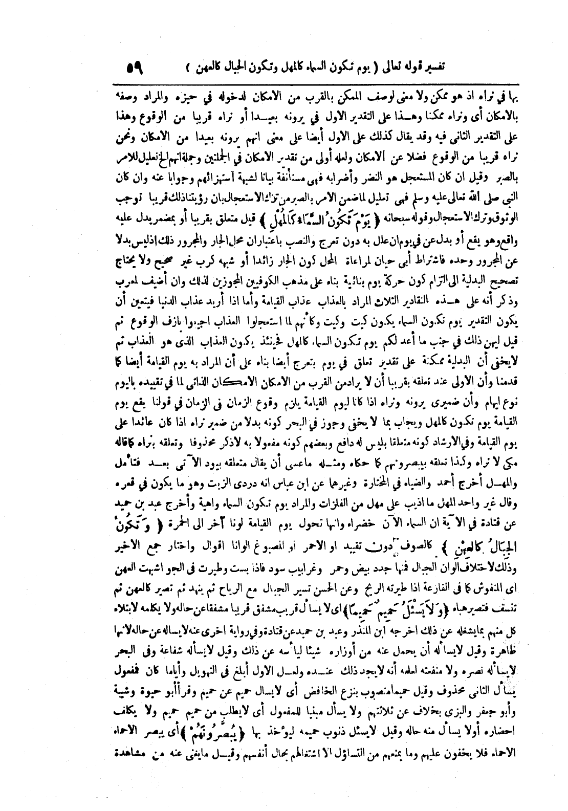 وقوله سبحانه يوم تكون السماء كالمهل قيل متعلق بقريبا أو بمضمر يدل عليه واقع وهو يقع أو بدل عن في يوم إن علل به دون تعرج والنصب باعتبار أن محل الجار والمجرور ذلك ليس بدلا عن المجرور وحده فاشتراط أبي حيان لمراعاة المحل كون الجار زائدا أو شبهه كرب غير صحيح ولا يحتاج تصحيح البدلية إلى التزام كون حركة يوم بنائية بناء على مذهب الكوفيين المجوزين لذلك وإن أضيف لمعرب وذكر أنه على هذه التقادير الثلاث المراد بالعذاب عذاب القيامة وأما إذا أريد عذاب الدنيا فيتعين أن يكون التقدير يوم تكون السماء يكون كيت وكيت وكأنهم لما استعجلوا العذاب أجيبوا بأزف الوقوع ثم قيل ليهن ذلك في جنب ما أعد لكم يوم تكون السماء كالمهل فحينئذ يكون العذاب الذي هو العذاب ثم لا يخفى أن البدلية ممكنة على تقدير تعلق في يوم بتعرج أيضا بناء على أن المراد به يوم القيامة أيضا كما قدمنا وأن الأولى عند تعلقه بقريبا أن لا يراد من القريب من الإمكان الإمكان الذاتي لما في تقييده باليوم نوع إيهام وأن ضميري يرونه ونراه إذا كانا ليوم القيامة يلزم وقوع الزمان في الزمان في قولنا يقع يوم القيامة يوم تكون كالمهل ويجاب بما لا يخفى وجوز في البحر كونه بدلا من ضمير نراه إذا كان عائدا على يوم القيامة وفي الإرشاد كونه متعلقا بليس له دافع وبعضهم كونه مفعولا به لا ذكر محذوفا وتعلقه بنراه كما قاله مكي لا نراه وكذا تعلقه بيبصرونهم كما حكاه ومثله ما عسى أن يقال متعلقه بيود الآتي بعد فتأمل