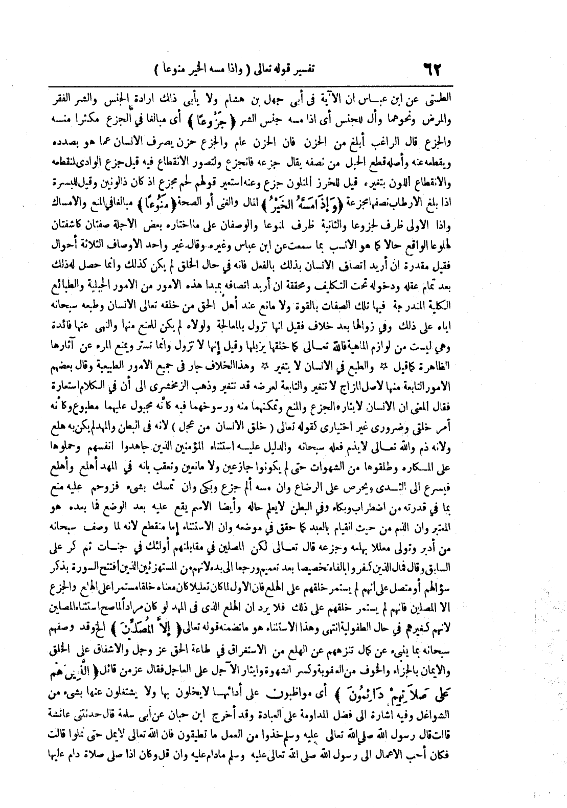 وهذا الخلاف جار في جميع الأمور الطبيعية وقال بعضهم الأمور التابعة منها لأصل المزاج لا تتغير والتابعة لعرضه قد تتغير وذهب الزمخشري إلى أن في الكلام استعارة فقال المعنى أن الإنسان لا يثاره الجزع والمنع وتمكنهما منه ورسوخهما فيه كأنه مجبول عليهما مطبوع وكأنه أمر خلقي وضروري غير اختياري كقوله تعالى خلق الإنسان من عجل لأنه في البطن والمهد لم يكن به هلع ولأنه ذم والله تعالى لا يذم فعله سبحانه والدليل عليه استثناء المؤمنين الذين جاهدوا أنفسهم وحملوها على المكاره وطلقوها من الشهوات حتى لم يكونوا جازعين ولا مانعين وتعقب بأنه في المهد أهلع وأهلع فيسرع إلى الثدي ويحرص على الرضاع وإن مسه ألم جزع وبكى وإن تمسك بشيء فزوحم عليه منع بما في قدرته من اضطراب وبكاء وفي البطن لا يعلم حاله وأيضا الاسم يقع عليه بعد الوضع فما بعده هو المعتبر وإن الذم من حيث القيام بالعبد كما حقق في موضعه وإن الإستثناء إما منقطع لأنه لما وصف سبحانه من أدبر وتولى معللا بهلعه وجزعه قال تعالى لكن المصلين في مقابلتهم أولئك في جنات ثم كر على السابق وقال فمال الذين كفروا بالفاء تخصيصا بعد تعميم ورجعا إلى بدء لأنهم من المستهزئين الذين افتتح السورة بذكر سؤالهم أو متصل على أنهم لم يستمر خلقهم على الهلع فإن الأول لما كان تعليلا كان معناه خلقا مستمرا على الهلع والجزع إلا المصلين فإنهم لم يستمر خلقهم على ذلك فلا يرد أن الهلع الذي في المهد لو كان مرادا لما صح استثناء المصلين لأنهم كغيرهم في حال الطفولية انتهى