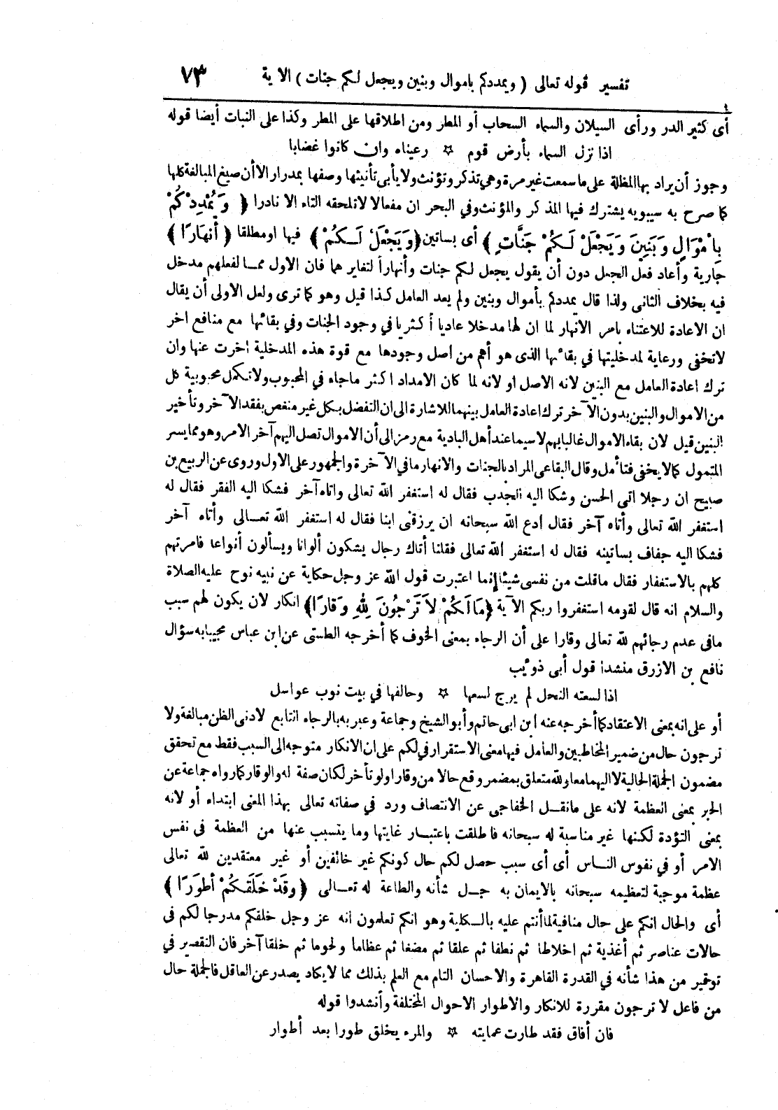 وقال البقاعي المراد بالجنات والأنهار ما في الآخرة والجمهور على الأول وروي عن الربيع بن صبيح أن رجل أتى الحسن وشكا إليه الجدب فقال له استغفر الله تعالى وأتاه آخر فشكا إليه الفقر فقال له استغفر الله تعالى وأتاه آخر فقال ادع الله سبحانه أن يرزقني ابنا فقال له استغفر الله تعالى وأتاه آخر فشكا إليه جفاف بساتينه فقال له استغفر الله تعالى فقلنا أتاك رجال يشكون ألوانا ويسألون أنواعا فأمرتهم كلهم بالإستغفار فقال ما قلت من نفسي شيئا إنما اعتبرت قول الله عز و جل حكاية عن نبيه نوح عليه الصلاة و السلام أنه قال لقومه استغفروا ربكم الآية