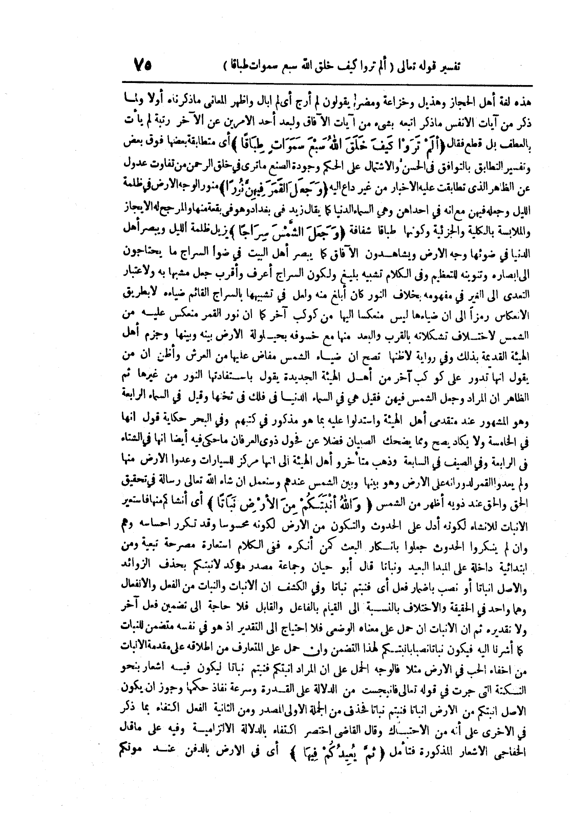 ألم تروا كيف خلق الله سبع سماوات طباقا أي متطابقة بعضها فوق بعض وتفسير التطابق بالتوافق في الحسن والإشتمال على الحكم وجودة الصنع ما ترى في خلق الرحمن من تفاوت عدول عن الظاهر الذي تطابقت عليه الأخبار من غير داع إليه