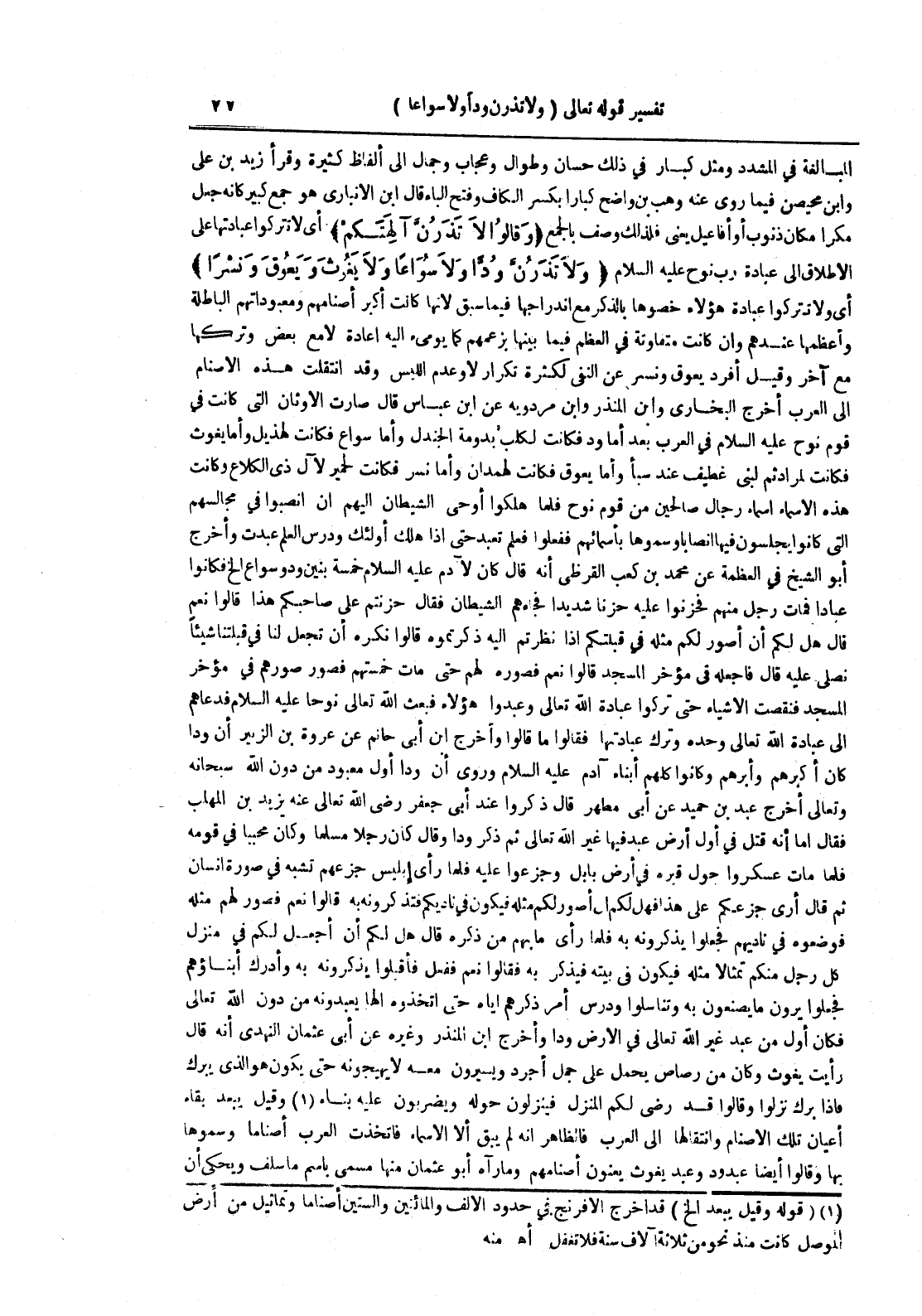 ولا تذرن ودا ولا سواعا ولا يغوث ويعوق ونسرا أي ولا تتركوا عبادة هؤلاء خصوصا بالذكر مع اندراجها فيما سبق لأنها كانت أكبر أصنامهم ومعبوداتهم الباطلة وأعظمها عندهم وإن كانت متفاوتة في العظم فيما بينها بزعمهم كما يؤميء إليه إعادة لا مع بعض وتركها مع آخر وقيل أفرد يعوق ونسر عن النفي لكثرة تكرار لا وعدم اللبس وقد انتقلت هذه الأصنام إلى العرب أخرج البخاري وابن المنذر وابن مردويه عن ابن عباس قال صارت الأوثان التي كانت في قوم نوح عليه السلام في العرب بعد أما ود فكانت لكلب بدومة الجندل وأما سواع فكانت لهذيل وأما يغوث فكانت لمراد ثم لبني غطيف عند سبأ وأما يعوق فكانت لهمدان وأما نسر فكانت لحمير لآل ذي الكلاع وكانت هذه الأسماء أسماء رجال صالحين من قوم نوح فلما هلكوا أوحى الشيطان إليهم أن انصبوا في مجالسهم التي كانوا يجلسون فيها أنصابا وسموها بأسمائهم ففعلوا فعلم تعبد حتى إذا هلك أولئك ودرس العلم عبدت وأخرج أبو الشيخ في العظمة عن محمد بن كعب القرظي أنه قال كان لآدم عليه السلام خمسة بنين ود وسواع الخ فكانوا عبادا فمات رجل منهم فحزنوا عليه حزنا شديدا فجائهم الشيطان فقال حزنتم على صاحبكم هذا قالوا نعم قال هل لكم أن أصور لكم مثله في قبلتكم إذا نظرتم إليه ذكرتموه قالوا نكره أن تجعل لنا في قبلتنا شيئا نصلي عليه قال فأجعله في مؤخر المسجد قالوا نعم فصوره لهم حتى مات خمستهم فصور صورهم في مؤخر المسجد فنقصت الأشياء حتى تركوا عبادة الله تعالى وعبدوا هؤلاء فبعث الله تعالى نوحا عليه السلام فدعاهم إلى عبادة الله تعالى وحده وترك عبادتها فقالوا ما قالوا وأخرجا بن أبي حاتم عن عروة بن الزبير أن ودا كان أكبرهم وأبرهم وكانوا كلهم أبناء آدم عليه السلام وروي أن ودا أول معبود من دون الله سبحانه وتعالى أخرج عبد بن حميد عن أبي مطهر قال ذكروا عند أبي جعفر رضي الله تعالى عنه يزيد بن المهلب فقال إما أنه قتل في أول أرض عبد فيها غير الله تعالى ثم ذكر ودا وقال كان رجلا مسلما وكان محببا في قومه فلما مات عسكروا حول قبره في أرض بابل وجزعوا عليه فلما رأى إبليس جزعهم تشبه في صورة إنسان ثم قال أرى جزعكم على هذا فهل لكم أن أصور لكم مثله فيكون في ناديكم فتذكرونه به قالوا نعم فصور لهم مثله فوضعوه في ناديهم فجعلوا يذكرونه به فلما رأى ما بهم من ذكره قال هل لكم أن أجعل لكم في منزل كل رجل منكم تمثالا مثله فيكون في بيته فيذكر به فقالوا نعم ففعل فأقبلوا يذكرونه به وأدرك أبناؤهم فجعلوا يرون ما يصنعون به وتناسلوا ودرس أمر ذكرهم إياه حتى اتخذوه إلها يعبدونه من دون الله تعالى فكان أول من عبد غير الله تعالى في الأرض ودا وأخرج ابن المنذر وغيره عن أبي عثمان النهدي أنه قال رأيت يغوث وكان من رصاص يحمل على جمل أجرد ويسيرون معه لا يهيجونه حتى يكون هو الذي يبرك فإذا برك نزلوا وقالوا قد رضي لكم المنزل فينزلون حوله ويضربون عليه بناء وقيل يبعد بقاء أعيان تلك الأصنام وانتقالها إلى العرب فالظاهر أنه لم يبق إلا الأسماء فاتخذت العرب أصناما وسموها بها وقالوا أيضا عبد ود وعبد يغوث يعنون أصنامهم وما رآه أبو عثمان منها باسم ما سلف ويحكى أن