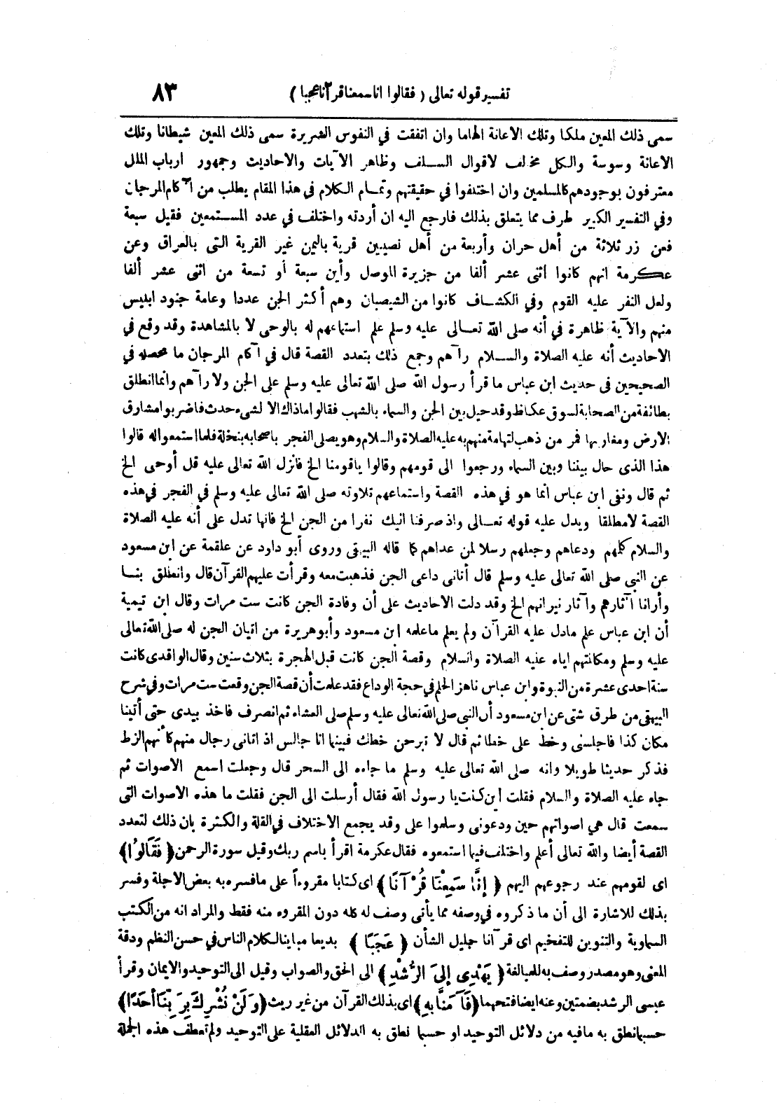 واختلف في عدد المستمعين فقيل سبعة فعن زر ثلاثة من أهل حران وأربعة من أهل نصيين قرية باليمن غير القرية التي بالعراق وعن عكرمة أنهم كانوا اثني عشر ألفا من جزيرة الموصل وأين سبعة أو تسعة من اثنتي عشر ألفا ولعل النفر عليه القوم وفي الكشاف كانوا من الشيصبان وهم أكثر الجن عددا وعامة جنود إبليس منهم والآية ظاهر في أنه صلى الله تعالى عليه وسلم علم استماعهم له بالوحي لا بالمشاهدة وقد وقع في الأحاديث أنه عليه الصلاة و السلام رآهم وجمع ذلك بتعدد القصة قال في آكام المرجان ما محصله في الصحيحين في حديث ابن عباس ما قرأ رسول الله صلى الله تعالى عليه وسلم على الجن ولا رآهم وإنما انطلق بطائفة من الصحابة به لسوق عكاظ وقد حيل بين الجن والسماء بالشهب فقالوا ما ذاك إلا لشيء حدث فاضربوا مشارق الأرض ومغاربها فمر من ذهب لتهامة منهم به عليه الصلاة و السلام وهو يصلي الفجر بأصحابه بنخلة فلما استمعوا له قالوا هذا الذي حال بيننا وبين السماء ورجعوا إلى قومهم وقالوا يا قومنا الخ فأنزل الله تعالى عليه قل أوحي الخ ثم قال ونفى ابن عباس إنما هو في هذه القصة واستماعهم تلاوته صلى الله تعالى عليه وسلم في الفجر في هذه القصة لا مطلقا ويدل عليه قوله تعالى وإذ صرفنا إليك نفرا من الجن الخ فإنها تدل على أنه عليه الصلاة و السلام كلمهم ودعاهم وجعلهم رسلا لمن عداهم كما قاله البيهقي وروى أبو داود عن علقمة عن ابن مسعود عن النبي صلى الله تعالى عليه وسلم قال أتاني داعي الجن فذهبت معه وقرأت عليهم القرآن قال وانطلق بنا وأرانا آثارهم وآثار نيرانهم الخ وقد دلت الأحاديث على أن وفادة الجن كانت ست مرات وقال ابن تيمية أن ابن عباس علم ما دل عليه القرآن ولم يعلم ما علمه ابن مسعود وأبو هريرة من إتيان الجن له صلى الله تعالى عليه وسلم ومكالمتهم إياه عليه الصلاة و السلام وقصة الجن كانت قبل الهجرة بثلاث سنين وقال الواقدي كانت سنة إحدى عشرة من النبوة وابن عباس ناهز الحلم في حجة الوداع فقد علمت أن قصة الجن وقعت ست مرات وفي شرح البيهقي من طرق شتى عن ابن مسعود أن النبي صلى الله تعالى عليه وسلم صلى العشاء ثم انصرف فأخذ بيدي حتى أتينا مكان كذا فأجلسني وخط علي خطا ثم قال لا تبرحن خطك فبينما أنا جالس إذ أتاني رجال منهم كأنهم الزط فذكر حديثا طويلا وأنه صلى الله تعالى عليه وسلم ما جاءه إلى السحر قال وجعلت أسمع الأصوات ثم جاء عليه الصلاة و السلام فقلت أين كنت يا رسول الله فقال أرسلت إلى الجن فقلت ما هذه الأصوات التي سمعت قال هي أصواتهم حين ودعوني وسلموا علي وقد يجمع الإختلاف في القلة والكثرة بأن ذلك لتعدد القصة أيضا والله تعالى أعلم