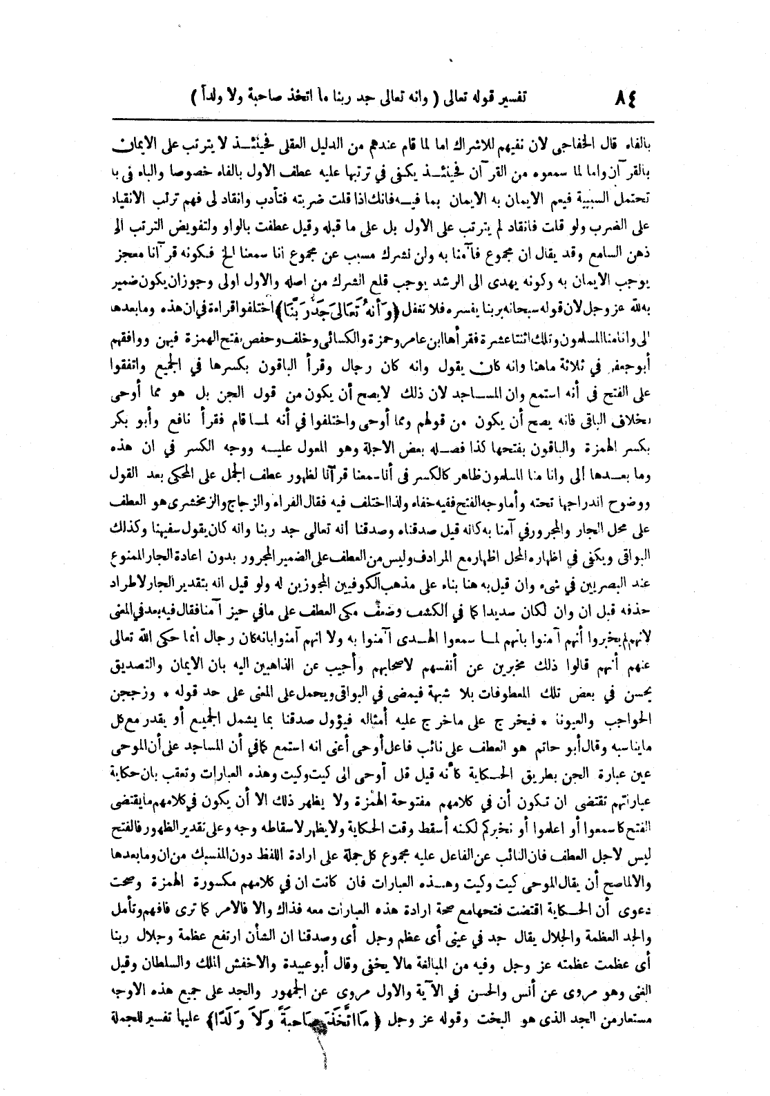 وأنه تعالى جد ربنا اختلفوا قراءة في أن هذه وما بعدها إلى وأنا منا الهمزة فيهن ووافقهم أبو جعفر في ثلاثة ما هنا وأنه كان يقول وأنه رجال وقرأ الباقون بكسرها في الجميع واتفقوا على الفتح في أنه استمع وإن المساجد لأن ذلك لا يصح أن يكون من قول الجن بل هو مما أوحي بخلاف الباقي فإنه يصح أن يكون من قولهم ومما أوحي واختلفوا في أنه لما قام فقرأ نافع وأبو بكر بكسر الهمزة والباقون بفتحها كذا فصله بعض الأجلة وهو المعول عليه ووجه الكسر في إن هذه وما بعدها إلى وأنا منا المسلمون ظاهر كالكسر في أنا سمعنا قرآنا لظهور عطف الجمل على المحكي بعد القول ووضوح اندراجها تحته وأما وجه الفتح ففيه خفاء ولذا اختلف فيه فقال الفراء والزجاج والزمخشري هو العطف على محل الجار والمجرور في آمنا به كأنه قيل صدقناه وصدقنا أنه تعالى جد ربنا وأنه كان يقول سفيهنا وكذلك البواقي ويكفي في إظهاره المحل إظهار مع المرادف وليس من العطف على الضمير المجرور بدون إعادة الجار الممنوع عند البصريين في شيء وإن قيل به هنا بناء على مذهب الكوفيين المجوزين له ولو قيل أنه بتقدير الجار لإطراد حذفه قبل أن وإن لكان سديدا كما في الكشف وضعف مكي العطف على ما في حيز آمنا فقال فيه بعد في المعنى لأنهم لم يخبروا أنهم آمنوا بأنهم لما سمعوا الهدى آمنوا به ولا أنهم آمنوا بأنه كان رجال إنما حكى الله تعالى عنهم أنهم قالوا ذلك مخبرين عن أنفسهم لأصحابهم وأجيب عن الذاهبين إليه بأن الإيمان والتصديق يحسن في بعض تلك المعطوفات بلا شبهة فيمضي في البواقي ويحمل على المعنى على حد قوله