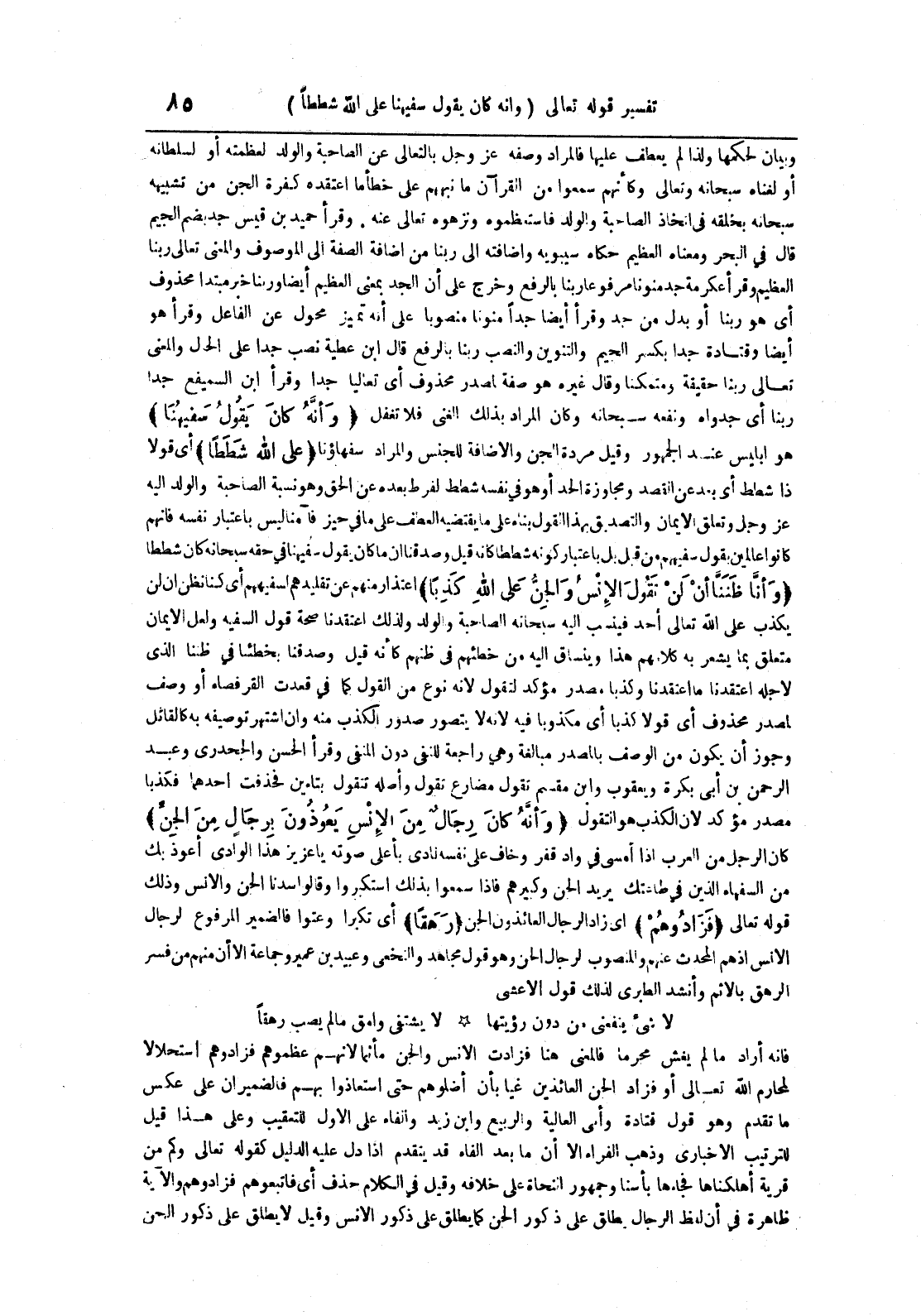وأنه كان رجال من الإنس يعوذون برجال من الجن كان الرجل من العرب إذا أمسى في واد قفر وخاف على نفسه نادى بأعلى صوته يا عزيز هذا الوادي أعوذ بك من السفهاء الذين في طاعتك يريد الجن وكبيرهم فإذا سمعوا بذلك استكبروا وقالوا سدنا الجن والإنس وذلك قوله تعالى