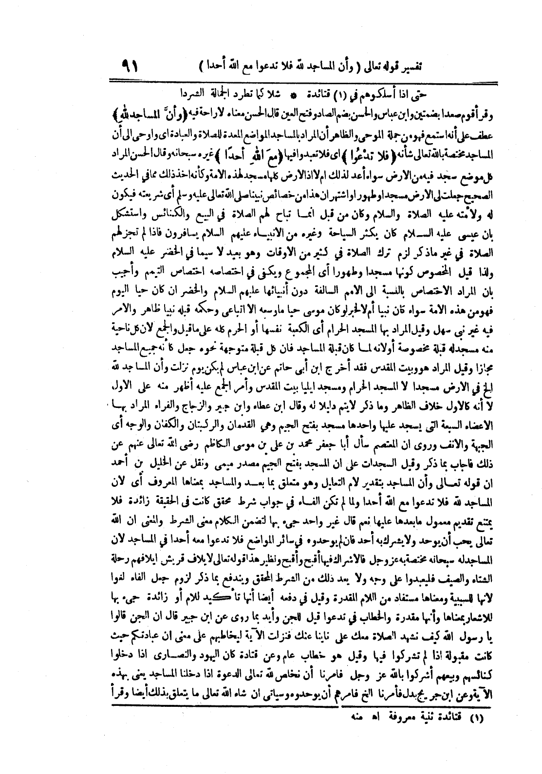 فلا تدعوا أي فلا تعبدوا فيها مع الله أحدا غيره سبحانه وقال الحسن المراد كل موضع سجد فيه من الأرض سواء أعد لذلك أم لا إذ الأرض كلها مسجد لهذه الأمة وكأنه أخذ ذلك مما في الحديث الصحيح جعلت لي الأرض مسجدا وطهورا واشتهر أن هذا من خصائص نبينا صلى الله تعالى عليه وسلم أي شريعته فيكون له ولأمته عليه الصلاة و السلام وكان من قبل إنما تباح لهم الصلاة في البيع والكنائس واستشكل بأن عيسى عليه السلام كان يكثر السياحة وغيره من الأنبياء عليهم السلام يسافرون فإذا لم تجز لهم الصلاة في غير ما ذكر لزم ترك الصلاة في كثير من الأوقات وهو بعيد لا سيما في الخضر عليه السلام ولذا قيل المخصوص كونها مسجدا وطهورا أي المجموع ويكفي في اختصاصة اختصاص التيمم وأجيب بأن المراد الإختصاص بالنسبة إلى الأمم السالفة دون أنبيائها عليهم السلام والحضر إن كان حيا اليوم فهو من هذه الأمة سواء كان نبيا أم لا لخبر لو كان موسى حيا ما وسعه إلا اتباعي وحكمه قبله نبيا ظاهر والأمر فيه غير نبي سهل وقيل المراد بها المسجد الحرام أي الكعبة نفسها أو الحرم كله على ما قيل والجمع لأن كل ناحية منه مسجد له قبلة مخصوصة أو لأنه لما كان قبلة المساجد فإن كل قبلة متوجهة محوه جعل كأنه جميع المساجد مجازا وقيل المراد هو وبيت المقدس فقد أخرج ابن أبي حاتم عن ابن عباس لم يكن يوم نزلت وأن المساجد لله الخ في الأرض مسجدا لا المسجد الحرام ومسجد إيليا بيت المقدس وأمر الجمع عليه أظهر منه على الأول لا أنه كالأول خلاف الظاهر وما ذكر لا يتم دليلا له وقال ابن عطاء وابن جبير والزجاج والفراء المراد بها قتائدة ثنية معروفة أه منه الأعضاء السبعة التي يسجد عليها واحدها مسجد بفتح الجيم وهي القدمان والركبتان والكفان والوجه أي الجبهة والأنف وروي أن المعتصم سأل أبا جعفر محمكد بن علي بن موسى الكاظم رضي الله تعالى عنهم عن ذلك فأجاب بما ذكر وقيل السجدات على أن المسجد بفتح الجيم مصدر ميمي ونقل عن الخليل بن أحمد أن قوله تعالى وأن المساجد بتقدير لام التعليل وهو متعلق بما بعد والمساجد بمعناها المعروف أي لأن المساجد لله فلا تدعوا مع الله أحدا ولما لم تكن الفاء في جواب شرط محقق كانت في الحقيقة زائدة فلا يمتنع تقديم معمول ما بعدها عليها نعم قال غير واحد جيء بها لتضمن الكلام معنى الشرط والمعنى أن الله تعالى يحب أن يوحد ولا يشرك به أحد فإن لم يوحدوه في سائر المواضع فلا تدعوا معه أحدا في المساجد لأن المساجد له سبحانه مختصة به عز و جل فالإشراك فيها أقبح وأقبح ونظير هذا قوله تعالى لإيلاف قريش إيلافهم رحلة الشتاء والصيف فليعبدوا على وجه ولا يعد ذلك من الشرط المحقق ويندفع بما ذكر لزوم جعل الفاء لغوا لأنها للسببية ومعناها مستفاد من اللام المقدرة وقيل في دفعه أيضا أنها تأكيد للام أو زائدة جيء بها للإشعار بمعناها وأنها مقدرة والخطاب في تدعوا قيل للجن وأيد بما روي عن ابن جبير قال أن الجن قالوا يا رسول الله كيف نشهد الصلاة معك على ناينا عنك فنزلت الآية ليخاطبهم على معنى أن عبادتكم حيث كانت مقبولة إذا لم تشركوا فيها وهو خطاب عام وعن قتادة كان اليهود والنصارة إذا دخلوا كنائسهم ويبعهم أشركوا بالله عز و جل فأمرنا أن نخلص لله تعالى الدعوة إذا دخلنا المساجد بهذه الآية وعن ابن جريج بدل فأمرنا الخ فأمرهم أن يوحدوه وسيأتي إن شاء الله تعالى ما يتعلق بذلك أيضا وقرأ