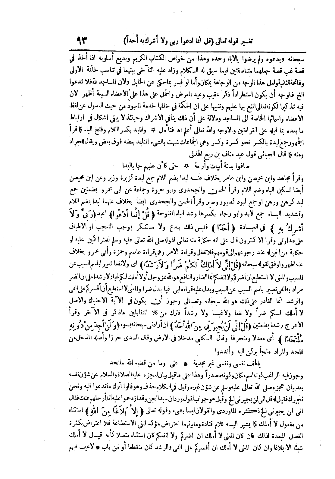 سبحانه ويدعوه ولم يرضوا بالإباء وحده وهذا من خواص الكتاب الكريم وبديع أسلوبه إذا أخذ في قصة غب قصة جعلهما متناصفتين فيما سيق له الكلام وزاد عليه التآخي بينهما في تناسب خاتمة الأولى وفاتحة الثانية ولعل هذا الوجه من الوجاهة بمكان وأما لو فسر بما حكى عن الخليل ولأن المساجد لله فلا تدعوا الخ فالوجه أن يكون استطرادا ذكر عقيب وعيد المعرض والحمل والآيتان 21 و 22 على هذا على الأعضاء السبعة أظهر لأن فيه تذكيرا لكونه تعالى المنع بها عليهم وتنبيها على أن الحكمة في خلقها خمدمة المعبود من حيث العدول على لفظ الأعضاء وأسمائها الخاصة إلى المساجد ودلالة على أن ذلك ينافي الإشراك وحينئذ لا يبقى إشكال في ارتباط ما بعده بما قبله على القراءتين والأوجه والله تعالى أعلم أه فتأمل