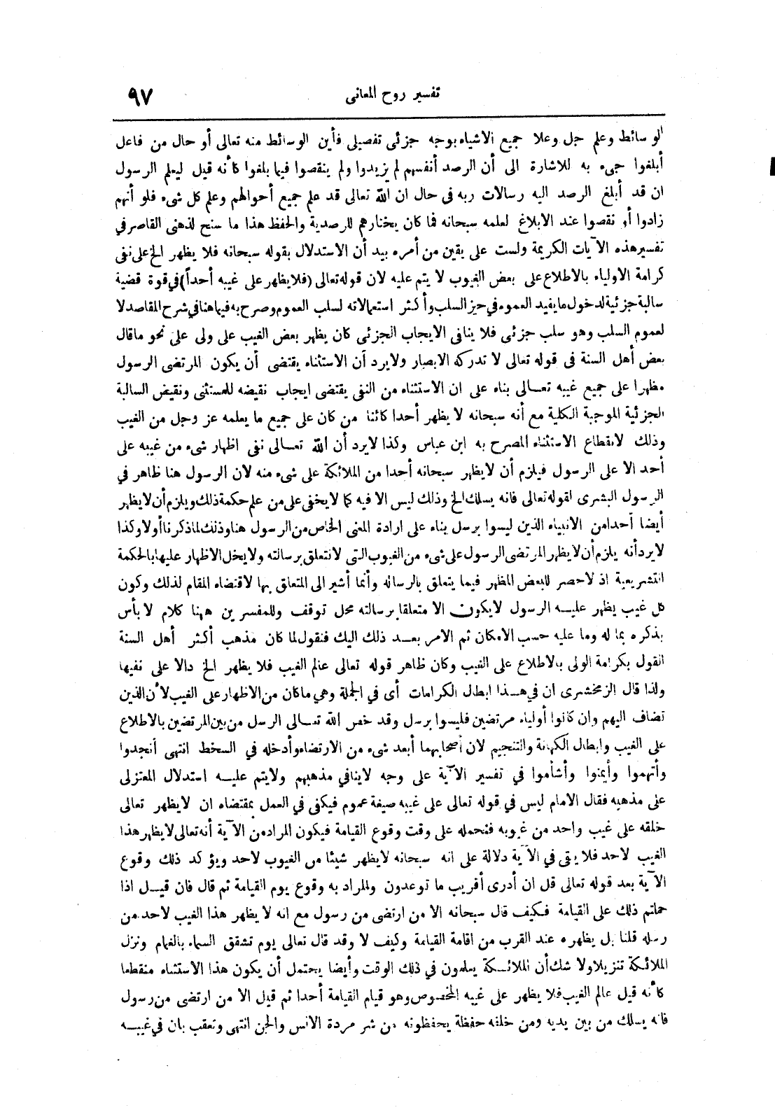 الوسائط وعلم جل وعلا جميع الأشياء بوجه جزئي تفصيلي فأين الوسائط منه تعالى أو حال من فاعل أبلغوا جيء به للإشارة إلى أن الرصد أنفسهم لم يزيدوا ولم ينقصوا فيما بلغوا كأنه قيل ليعلم الرسول أن قد أبلغ الرصد إليه رسالات ربه في حال إن الله تعالى قد علم جميع أحوالهم وعلم كل شيء فلو أنهم زادوا أو نقصوا عند الإبلاغ لعلمه سبحانه فما كان يختارهم للرصدية والحفظ هذا ما سنح لذهني القصر في تفسير هذه الآيات الكريمة وليت على يقين من أمره بيد أن ألإستدلال بقوله سبحانه فلا يظهر الخ على نفي كرامة الأولياء بالإطلاع على بعض الغيوب لا يتم عليه لأن قوله تعالى فلا يظهر على غيبه أحدا في قوة قضية سالبة جزئية لدخول ما يفيد العموم في حيز السلب وأكثر استمالاته لسلب العموم وصرح به فيما هنا في شرح المقاصد لا لعموم السلب وهو سلب جزئي فلا ينافي الإيجاب الجزئي كان يظهر بعض الغيب على ولي على نحو ما قال بعض أهل السنة في قوله تعالى لا تدركه الإبصار ولا يرد إن الإستثناء يقتضي أن يكون المرتضي الرسول مظهرا على جميع غيبه تعالى بناء على أن الإستثناء من النفي يقتضي إيجاب نقيضه للمستثنى ونقيض السالبة الجزئية الموجبة الكلية مع أنه سبحانه لا يظهر أحدا كائنا من كان على جميع ما يعلمه عز و جل من الغيب وذلك لانقطاع الإستثناء المصرح به ابن عباس وكذا لا يرد أن الله تعالى نفى إظهار شيء من غيبه على أحد إلا على الرسول فليلزم أن لا يظهر سبحانه أحدا من الملائكة على شيء منه لأن الرسول هنا ظاهر في الرسول البشري لقوله تعالى فإنه يسلك الخ وذلك ليس إلا في كما لا يخفى على من علم حكمة ذلك ويلزم أن لا يظهر أيضا أحدا من الأنبياء الذين ليسوا برسل بناء على إرادة المعنى الخاص من الرسول هنا وذلك لما ذكرنا أولا وكذا لا يرد أنه يلزم أن لا يظهر المرتضى الرسول على شيء من الغيوب التي لا تتعلق برسالته ولا يخل الإظهار عليها بالحكمة التشريعية إذ لا حصر للبعض المظهر فيما يتعلق بالرسالة وأنما أشير إلى المتعلق بها لاقتضاء المقام لذلك وكون كل غيب يظهر عليه الرسول لا يكون إلا متعلقا برسالته محل توقف وللمفسرين ههنا كلام لا بأس بذكره بما له وما عليه حسب الإمكان ثم الأمر بعد ذلك إليك فنقول لما كان مذهب أكثر أهل السنة القول بكرامة الولي بالإطلاع على الغيب وكان ظاهر قوله تعالى عالم الغيب فلا يظهر الخ دالا على نفيها ولذا قال الزمخشري أن في هذا إبطال الكرامات أي في الجملة وهي ما كان من الإظهار على الغيب لأن الذين تضاف إليهم وإن كانوا أولياء مرتضين فليسوا برسل وقد خصالله تعالى الرسل من بين المرتضين بالإطلاع على الغيب وإبطال الكهانة والتنجيم لأن أصحابهما أبعد شيء من الإرتضاء وأدخله في السخط انتهى أتجدوا وأتهموا وأيمنوا وأشأموا في تفسير الآية على وجه لا ينافي مذهبهم ولا يتم عليه استدلال المعتزلي على مذهبه فقال الإمام ليس في قوله تعالى على غيبه صيغة عموم فيكفي عموم في العمل بمقتضاه أن لا يظهر تعالى خلقه على غيب واحد من غيوبه فنحمله على وقت وقوع القيامة فيكون المراد من الآية أنه تعالى لا يظهر هذا الغيب لأحد فلا يبقى في الآية دلالة على أنه سبحانه لا يظهر شيئا من الغيوب لأحد ويؤكد ذلك وقوع الآيةبعد قوله تعالى قل إن أدري أقريب ما توعدون والمراد به وقوع يوم القيامة ثم قال فإن قيل إذا حملتم ذلك على القيامة فكيف قال سبحانه إلا من ارتضى من رسول مع أنه لا يظهر هذا الغيب لأحد من رسله قلنا بل يظهره عند القرب من إقامة القيامة وكيف لا وقد قال تعالى يوم تشقق السماء بالغمام ونزل الملائكة تنزيلا ولا شك أن الملائكة يعلمون في ذلك الوقت وأيضا يحتمل أن يكون هذا الإستثناء منقطعا كأنه قيل عالم الغيب فلا يظهر على غيبه المخصوص وهو قيام القيامة أحدا ثم قيل إلا من ارتضى من رسول فإنه يسلك من بين يديه ومن خلفه حفظة يحفظونه من شر مردة الإنس والجن انتهى وتعقب بأن في غيبه