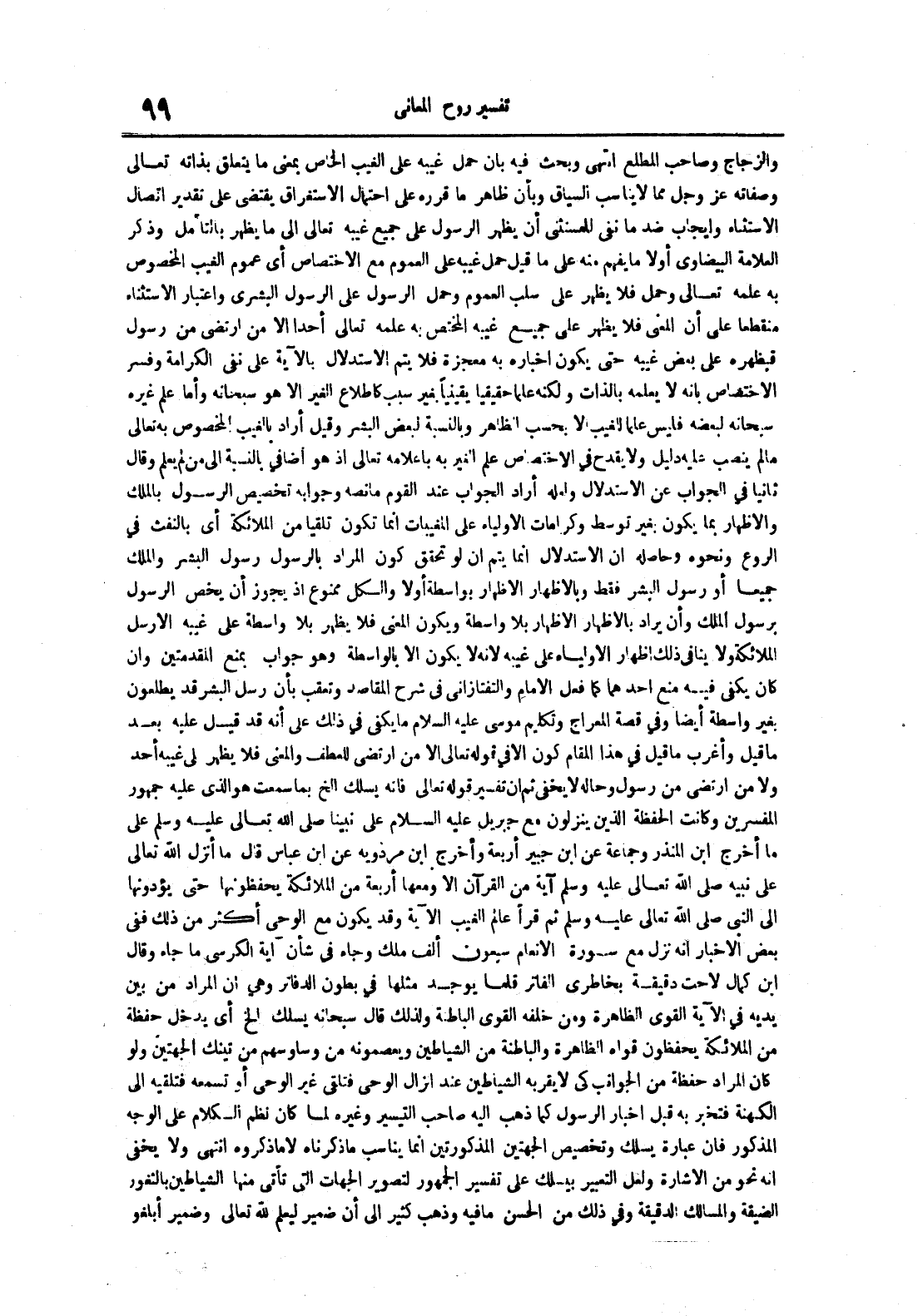 والزجاج وصاحب المطلع انتهى وبحث فيه بأن حمل غيبه على الغيب الخاص بمعنى ما يتعلق بذاته تعالى وصفاته عز و جل مما لا يناسب السياق وبأن ظاهر ما قرره على احتمالالإستغراق يقتضي على تقدير اتصال الإستثناء وإيجاب ضد ما نفي للمستثنى أن يظهر الرسول على جميع غيبه تعالى إلى ما يظهر بالتأمل وذكر العلامة البيضاوي أولا ما يفهم منه على ما قيل حمل غيبه على العموم مع الإختصاص أي عموم الغيب المخصوص به علمه تعالىة وحمل فلا يظهر على سلب العموم وحمل الرسول على الرسول البشري واعتبار الإستثناء منقطعا على أن المعنى فلا يظهر على جميع غيبه المختص به علمه تعالى أحدا إلا من ارتضى من رسول فيظهره على بعض غيبه حتى يكون إخباره به معجزة فلا يتم الإستدلال بالآية على نفي الكرامة وفسر الإختصاص بأنه لا يعلمه بالذات ولكنه علما حقيقيا يقينيا بغير سبب كاطلاع الغير إلا هو سبحانه وأما علم غيره سبحانه لبعضه فليس علما للغيب إلا بحسب الظاهر وبالنسبة لبعض البشر وقيل أراد بالغيب المخصوص به تعالى ما لمك ينصب عليه دليل ولا يقدح في الإختصاص علم الغير به بإعلامه تعالى غذ هو إضافي بالنسبة إلى من لم يعلم وقال ثانيا في الجواب عن الإستدلال ولعله أراد الجواب عند القوم ما نصه وجوابه تخصيص الرسول بالملك والإظهار بما يكون بغير توسط وكرامات الأولياء على المغيبات إنما تكون تلقيا من الملائكة أي بالنفث في الروع ونحوه وحاصله أن الإستدلال إنما لم يتم لو تحقق كون المراد بالرسول رسول البشر والملك جميع لا أو رسول البشر فقط وبالإظهار الإظهار بواسطة أو لا والكل ممنوع إذ يجوز أن يخص الرسول برسول الملك وأن يراد بالإظهار الإظهار بلا واسطة ويكون المعنى فلا يظهر بلا واسطة على غيبه إلا رسل الملائكة ولا ينافي ذلك إظهار الأولياء على غيبه لا يكون إلا بالواسطة وهو جواب بمنع المقدمتين وإن كان يكفي فيه منع أحدهما كما فعل الإماموالتفتازاني في شرح المقاصد وتعقب بأن رسل البشر قد يطلعون بغير واسطة أيضا وفي قصة المعراج وتكليم موسى عليه السلام ما يكفي في ذلك على أنهقد قيل عليه بعد ما قيل وأغرب ما قيل في هذا المقام كون إلا في قوله تعالى إلا من ارتضى للعطف والمعنى فلا يظهر على غيبه أحد ولا من ارتضى من رسول وحاله لا يخفى ثم إن تفسير قوله تعالى فإن يسلك الخ بما سمعت هو الذي عليه جمهور المفسرين وكانت الحفظة الذين ينزلون مع جبريل عليه السلام على نبينا صلى الله تعالى عليه وسلم على ما أخرج ابن المنذر وجماعة عن ابن جبير أربعة وأخرج ابن مردويه عن ابن عباس قال ما أنزل الله تعالى على نبيه صلى الله تعالى عليه وسلم آية من القرآن إلا ومعها أربعة من الملائكة يحفظونها حتى يؤدونها إلى النبي صلى الله تعالى عليه وسلم ثم قرأ عالم الغيب الآية وقد يكون الوحي أكثر من ذلك ففي بعض الأخبار أنه نزل مع سورة الأنعام سبعون ألف ملك وجاء في شأن آية الكرسي ما جاء وقال ابن كمال لا حت دقيقة بخاطري الفاتر قلما يوجد مثلها في بطون الدفاتر وهي أن المراد من بين يديه في الآية القوى الظاهرة ومن خلفه القوى الباطنة ولذلك قال سبحانه يسلك الخ أي يدخل حفظة من الملائكة يحفظون قواه الظاهرة والباطنة من الشياطين ويعصمونه من وساوسهم من تينك الجهتين ولو كان المراد حفظة من الجوانب كي لا يقربه الشياطين عند إنزال الوحي فتلقى غير الوحي أو تسمعه فتلقيه إلى الكهنة فتخبر به من قبل إخبار الرسول كما ذهب إليه صاحب التيسير وغيره لما كان نظم الكلام على الوجه المذكور فإن عبارة يسلك وتخصيص الجهتين المذكورتين إنما يناسب ما ذكرناه لا ما ذكروه انتهى ولا يخفى أنه نحو من الإشارة ولعل التعبير بيسلك على تفسير الجمهور لتصوير الجهات التي تأتي منها الشياطين بالثغور الضيقة والمسالك الدقيقة وفي ذلك من الحسن ما فيه وذهب إلى أن ضمير ليعلم لله تعالى وضمير أبلغوا