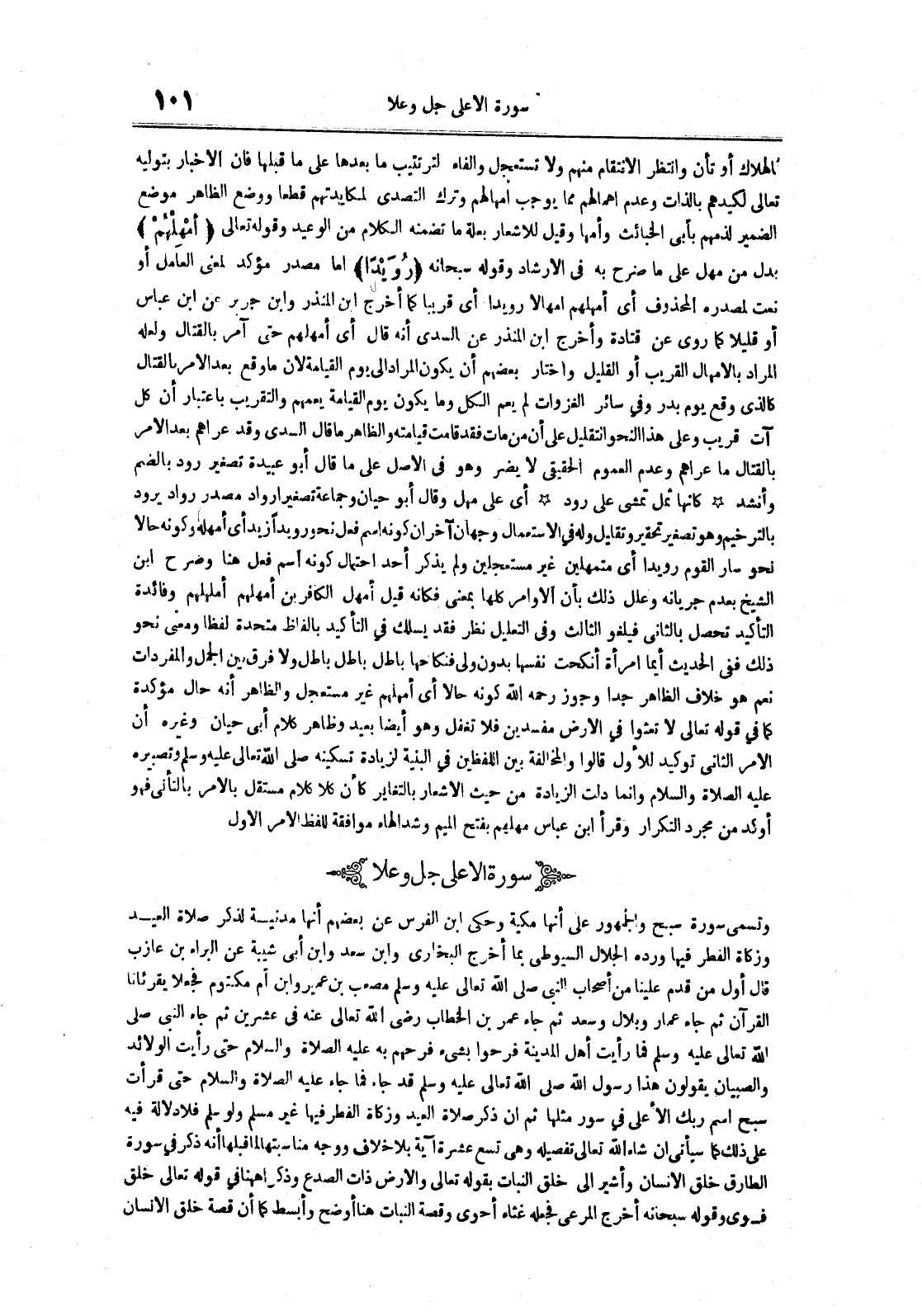 وتسمى سورة سبح والجمهور على أنها مكية وحكى ابن الفرس عن بعضهم أنها مدنية لذكر صلاة العيد وزكاة الفطر فيها ورده الجلال السيوطي بما أخرج البخاري وابن سعد وابي أبي شيبة عن البراء ابن عازب قال أول من قدم علينا من أصحاب النبي صلى الله تعالى عليه وسلم مصعب بن عمير وابن مكتوم فجعلا يقرئانا القرآن ثم جاء عمار وبلال وسعد ثم جاء عمر بن الخطاب رضي الله تعالى عنه في عشرين ثم جاء النبي صلى الله تعالى عليه وسلم فما رأيت أهل المدينة فرحوا بشيء فرحهم به عليه الصلاة و السلام حتى رأيت الولائد والصبيان يقولون هذا رسول الله صلى الله تعالى عليه وسلم قد جاء فما جاء عليه الصلاة و السلام حتى قرأت سبح اسم ربك الأعلى في سور مثلها ثم إن ذكر صلاة العيد وزكاة الفطر فيها غير مسلم ولو سلم فلا دلالة فيه على ذلك كما سيأتي إن شاء الله تعالى تفصيله وهي تسع عشرة آية بلا خلاف ووجه مناسبتها لما قبلها أنه ذكر في سورة الطارق خلق الإنسان وأشير إلى خلق النبات بقوله تعالى والأرض ذات الصدع وذكرا ههنا في قوله تعالى خلق فسيرى وقوله سبحانه أخرج المرعى فجعله غثاء أحوى وقصة النبات هنا أوضح وأبسط كما أن قصة خلق الإنسان
