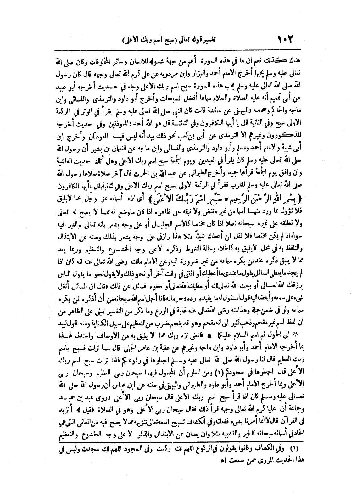 هناك كذلك نعم إن ما في هذه السورة أعم من جهة شموله للإنسان وسائر المخلوقات وكان صلى الله تعالى عليه وسلم يحبها أخرج الإمام أحمد والبزار وابن مردويه عن علي كرم الله تعالى وجهه قال كان رسول الله صلى الله تعالى عليه وسلم يحب هذه السورة سبح اسم ربك الأعلى وجاء في حديث أخرجه أبو عبيدة عن أبي تميم أنه عليه الصلاة و السلام سماها أفضل المسبحات وأخرج أبو داود والترمذي والنسائي وابن ماجه والحاكم وصححه والبيهقي عن عائشة قالت كان النبي صلى الله تعالى عليه وسلم يقرأ في الوتر في الركعة الأولى سبح وفي الثانية قل يا أيها الكافرون وفي الثالثة قل هو الله أحد والمعوذتين وفي حديث أخرجه المذكورون وغيرهم إلا الترمذي عن أبي بن كعب نحو ذلك بيد أنه ليس فيه المعوذتان وأخرج ابن أبي شيبة والإمام أحمد ومسلم وأبو داود والترمذي والنسائي وابن ماجه عن النعمان بن بشير أن رسول الله صلى الله تعالى عليه وسلم كان يقرأ في العيدين ويوم الجمعة سبح اسم ربك الأعلى وهل أتاك حديث الغاشية وإن وافق يوم الجمعة قرأهما جميعا وأخرج الطبراني عن عبد الله بن الحرث قال آخر صلاة صلاها رسول الله صلى الله تعالى عليه وسلم المغرب فقرأ في الركعة الأولى بسبح اسم ربك الأعلى وفي الثانية بقل يا أيها الكافرون بسم الله الرحمن الرحيم