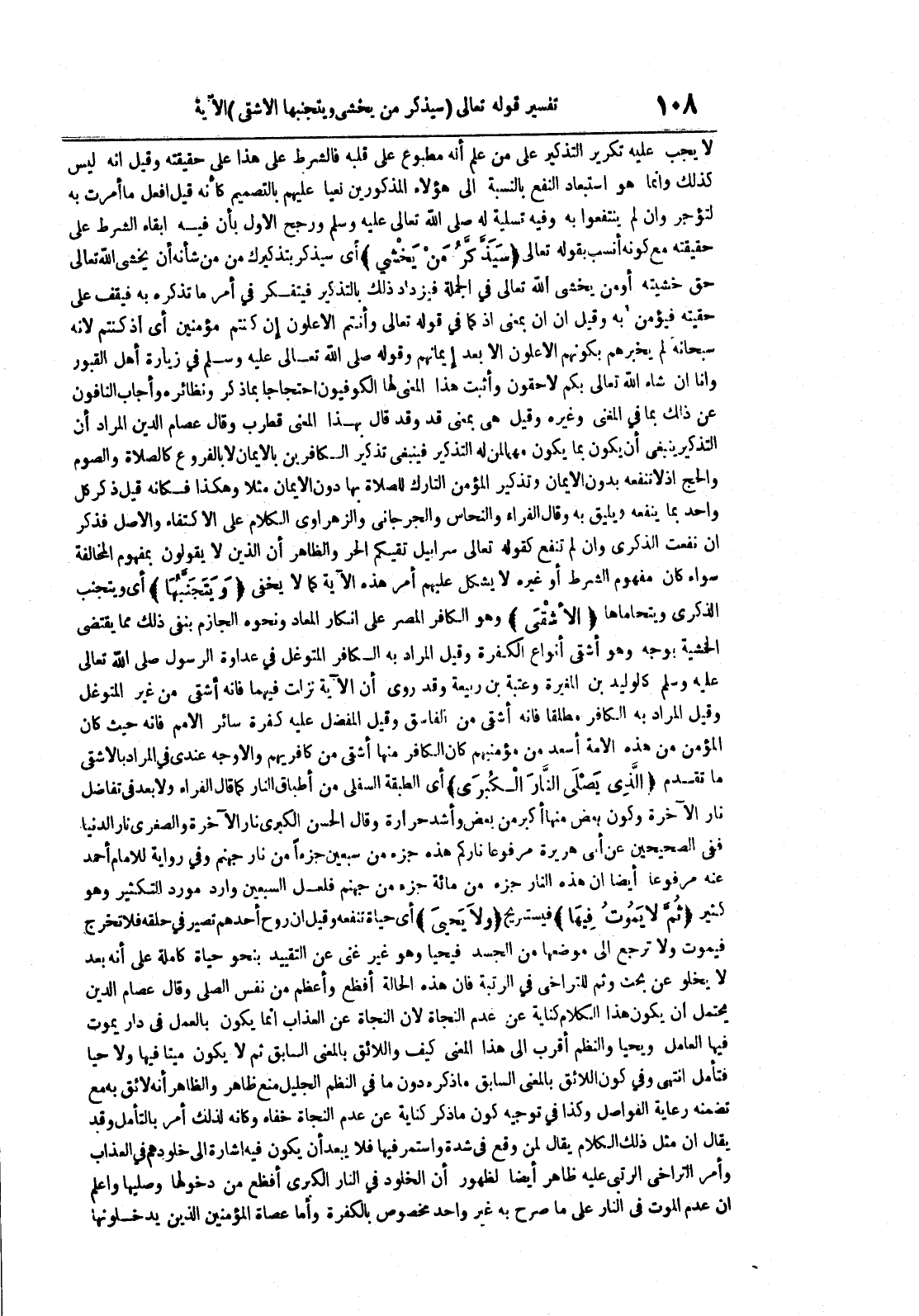 لا يجب عليه تكرير التذكير على من علم أنه مطبوع على قلبه فالشرط على هذا على حقيقته وقيل أنه ليس كذلك وإنما هو استبعاد النفع بالنسبة إلى هؤلاء المذكورين نعيا عليهم بالتصميم كأنه قيل افعل ما أمرت به لتؤجر وإن لم ينتفعوا به وفيه تسلية له صلى الله تعالى عليه وسلم ورجح الأول بأن فيه إبقاء الشرط على حقيقته مع كونه أنسب بقوله تعالى سيذكر من يخشى أي سيذكر بتذكيرك من من شأنه أن يخشى الله تعالى حق خشيته أو من يخشى الله تعالى في الجملة فيزداد ذلك بالتذكير فيتفكر في أمر ما تذكره به فيقف على حقيقته فيؤمن به وقيل إن إن بمعنى إذ كما في قوله تعالى وأنتم العلون إن كنتم مؤمنين أي إذ كنتم لأنه سبحانه لم يخبرهم بكونهم الأعلون إلا بعد إيمانهم وقوله صلى الله تعالى عليه وسلم في زيادة أهل القبور وأنا إن شاء الله تعالى بكم لاحقون وأثبت هذا المعنى لها الكوفيون احتجاجا بما ذكر ونظائره وأجاب النافون عن ذلك بما في المغنى وغيره وقيل هي بمعنى قد وقد قال بهذا المعنى قطرب وقال عصام الدين المردا أن التذكير ينبغي أن يكون بما يكون مهما لمن له التذكير فينبغي تذكير الكافرين بالإيمان إلا بالفروع كالصلاة والصوم والحج إذ لا تنفعه بدون الإيمان وتذكير المؤمن التارك للصلاة بها دون الإيمان مثلا وهكذا فكأنه قيل ذكر كل واحد بما ينفعه ويليق به وقال الفراء والنحاس والجرجاني والزهراوي الكلام على الأكتفاء والأصل فذكر أن نفعت الذكر وإن لم تنفع كقوله تعالى سرابيل تقيكم الحر والظاهر أن الذين لا يقولون بمفهوم المخافة سواء كان مفهوم الشرط أو غيره لا يشكل عليهم أمر هذه الآية كما لا يخفى ويتجنبها أي ويتجنب الذكرى ويتحاماها الأشقى وهو الكافر المصر على إنكار المعاد ونحوه الجازم بنفي ذلك مما يقتضي الخشية بوجه وهو أشقى أنواع الكفرة وقيل المراد الكافر المتوغل في عداوة الرسول صلى الله تعالى عليه وسلم كالوليد بن المغيرة وعتبة بن ربيعة وقد روي أن الآية نزلت فيهما فإنه أشقى من غير المتوغل وقيل المراد به الكافر مطلقا فإنه أشقى من الفاسق وقيل المفضل عليه كفرة سائر الأمم فإنه حيث كان المؤمن من هذه الأمة أسعد من مؤمنيهم كان الكافر منها أشقى من كافريهم والأوجه عندي في المراد بالأشقى ما تقدم الذي يصلى النار الكبرى أي الطبقة السفلى من أطباق النار كما قال الفراء ولا بعد في تفاضل نار الآخرة وكون بعض منها أكبر من بعض وأشد حرارة وقال الحسن الكبرى نار الآخرة والصغرى نار الدنيا ففي الصحيحين عن أبي هريرة مرفوعا ناركم هذه جزء منسبعين جزءا من نار جهنم وفي رواية للإمام أحمد عنه مرفوعا أيضا إن هذه النار جزء من مائة جزء من جهنم فلعل السبعين وارد مورد التكثير وهو كثير ثم لا يموت فيها فيستريح ولا يحيى أي حياة تنفعه وقيل إن روح أحجدهم تصير في حلقه فلا تخرج فيموت ولا ترجع إلى موضعها من الجسد فيحيا وهو غير غني عن التقييد بنحو حياة كاملة على أنه بعد لا يخلو عن بحث وثم للتراخي في الرتبة فإنهذه الحالة أفظع وأعظم من نفس المصلي وقال عصام الدين يحتمل أن يكون هذا الكلام كناية عن عدم النجاة لأن النجاة عن العذاب إنما يكون بالعمل في دار يموت فيها العامل ويحيا والنظم أقرب إلى هذا المعنى كيف واللائق بالمعنى السابق ثم لا يكون ميتا فيها ولا حيافتأمل انتهى وفي كون اللائق بالمعنى السابق ما ذكره دون ما في النظم الجليل منع ظاهر والظاهر أنه لائق به مع تضمنه رعاية الفواصل وكذا في توجيه كون ما ذكر كناية عن عدم النجاة خفاء وكأنه لذلك أمر بالتأمل وقد يقال إن مثل ذلك الكلام يقال لمن وقع في شدة واستمرفيها فلا يبعد أن يكون فيه إشارة إلى خلودهم في العذاب وأمر التراخي الرتبي عليه ظاهر أيضا لظهور أن الخلود في النار الكبرى أفظع من دخولها وصليها واعلم أن عدم الموت في النار على ما صرح به غير واحد مخصوص بالكفرة وأما عصاة المؤمنين الذين يدخلونها