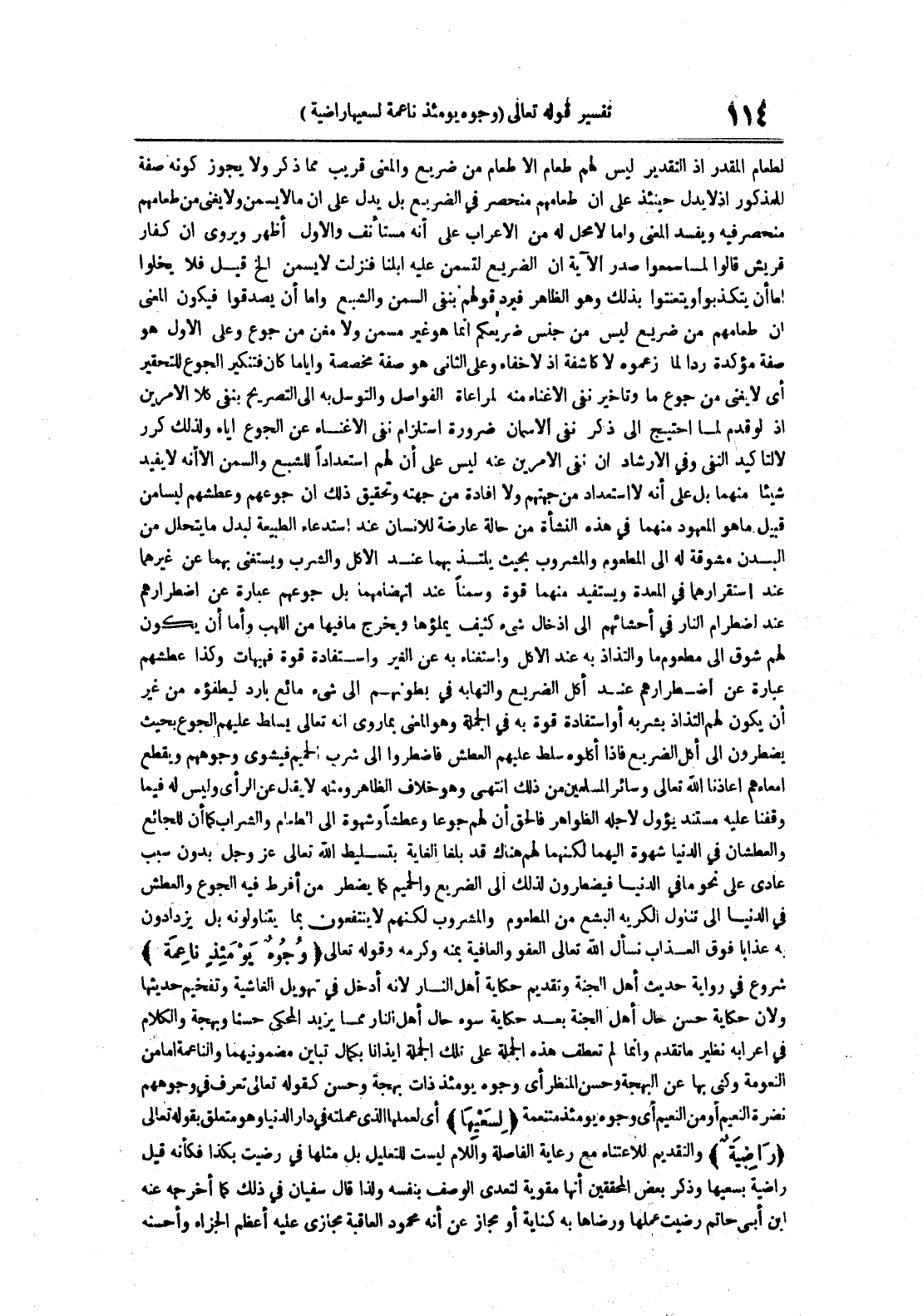لطعام المقدر إذ التقدير ليس لهم ذعام إلا طعام من ضريع والمعنى قريب مما ذكر ولا يجوز كونه صفة للمذكور إذ لا يدل حينئذ على أن طعامهم منحصر في الضريع بل يدل على أن ما لا يسمن ولا يغني من طعامهم منحصر فيه ويفسد المعنى وأما لا محل له من الإعراب على أنه مستأنف والأول أظهر ويروي أن كفار قريش قالوا صدر الآية أن الضريع لتسمن عليه إبلنا فنزلت لا يسمن الخ قيل فلا يخلوا إما أن يتكذبوا أو يتعنتوا بذلك وهو الظاهر فيرد قولهم بنفي السمن والشبع وأما أن يصدقوا فيكون المعنى إن طعامهم من ضريع ليس من جنس ضريعكم إنما هو غير مسمن ولا مغن من جوع وعلى الأول هو صفة مؤكدة ردا لما زعموه لا كاشفة إذ لا خفاء وعلى الثاني هو صفة مخصصة وأيا ما كان فتنكير الجوع للتحقير أي لا يغني من جوع ما وتأخير نفي الإغناء عنه لمراعاة الفواصل والتوسل به إلى التصريح بنفي كلا الأمرين إذ لو قدم لما احتيج إلى ذكر نفي الإسمان ضرورة استلزام نفي الإغناء من الجوع إياه ولذلك كرر لا لتأكيد النفي وفي الإرشاد أن نفي الأمرين عنه ليس على أن لهم استعدادا للشبع والسمن إلا أنه لا يفيد شيئا منهما بل على أنه لا استعداد من جهتهم ولا إفادة من جهته ذلك أن جوعهم وعطشهم ليسا من قبيلما هو المعهود منهما في هذه النشأة من حالة عارضة للإنسان عند استدعاء الطبيعة لبدل ما يتحلل من البدن مشوقة له إلى المطعوم والمشروب بحيث يلتذ بهما عند الأكل والشرب ويستغني بهما عن غيرهما عند استقرارهما في المعدة ويستفيد منهما قوة وسمنا عند انهضامهما بل جوعهم عبارة عن اضطرارهم عند اضطرام النار في أحشائهم إلى إدخال شيء كثيف يملؤها ويخرج ما فيها من اللهب وأما أن يكون لهم شوق إلى مطعوم ما والتذاذ به عند الأكل واستغناء به عن الغير واستفادة قوة فهيهات وكذا عطشهم عبارة عن اضطرارهم عند أكل الضريع والتهابه في بطونه مخ إلى شيء مائع بارد ليطفؤه من غير أن يكون لهم التذاذ بشربه أو استفادة قوة به في الجملة وهو المعنى بما روي أنه تعالى يسلط عليهم الجوع بحيث يضطرون إلى أكل الضريع فإذا أكلوه سلط عليهم العطش فاضطروا إلى شرب الحميم فيشوي وجوههم ويقطع أمعاءهم أعاذنا الله تعالى وسائر المسلمين من ذلك انتهى وهو خلاف الظاهر ومثله لا يقال عن الرأي له فيما وقفنا عليه مستند يؤول لأجله الظواهر فالحق أن لهم جوعا وعطشا وشهوة إلى الطعام والشراب كما أن للجائع والعطشان في الدنيا شهوة إليهما لكنهما لهم هناك قد بلغا الغاية بتسليط الله تعالى عز و جل بدون سبب عادي على نحو ما في الدنيا فيضطرون لذلك إلى الضريع والحميم كما يضطر من إفرط فيه الجوع والعطش في الدنيا إلى تناول الكريه البشع من المطعوم والمشروب لكنهم لا ينتفعون بما يتناولونه بل يزدادون به عذابا فوق العذاب نسأل الله تعالى العفو والعافية بمنه وكرمه وقوله تعالى وجوه يومئذ ناعمة شروع في رواية حديث أهل الجنة وتقديم حكاية أهل النار لأنه أدخل في تهويل الغاشية وتفخيم حديثها ولأن حكاية حسن حال أهل الجنة بعد حكاية سوء حال أهل النارؤ مما يزيد المحكي حسنا وبهجة والكلام في إعرابه نظير ما تقدم وإنمالم تعطف هذه الجملة على تلك الجملة إيذانا بكمال تباين مضمونيها والناعمة إما من النعومة وكنيبها عن البهجة وحسن المنظر أي وجوه يومئذ ذات بهجة وحسن كقوله تعالى تعرف في وجوههم نضرة النعيم أو من النعيم أي وجوه يومئذ متنعمة لسعيها أي لعملها الذي عملته في دار الدنيا وهو متعلق بقوله تعالى راضية والتقديم للإعتناء مع رعاية الفاصلة واللام ليست للتعليل بل مثلها في رضيت بكذا قيل راضية بسعيها وذكر بعض المحققين أنها مقوية لتعدي الوصف بنفسه ولذا قال سفيان في ذلك كما أخرجه عنه ابن أبي حاتم رضيت عملها ورضاها به كناية أو مجاز عن أنه محمود العاقبة مجازي عليه أعظم الجزاء وأحسنه