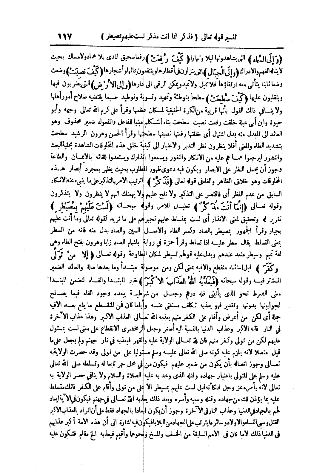 وإلى السماء التي يشاهدونها ليلا ونهارا كيف رفعت رفعا سحيق المدى بلا عماد ولا مساك بحيث لا يناله الفهم والإدراك وإلى الجبال التي ينزلون في أقطارها وينتفعون بمائها وأشجارها كيف نصبت وضعت وضعا ثابتا يتأتى معه ارتقاؤها فلا تميل ولا تميد ويمكن الرقي إلى دارها وإلى الأرض التي يضربون فيها ويتقلبون عليها كيف سطحت سفحا بتوطئة وتمهيد وتسوية وتوطيد حسبما يقتضيه صلاح أمور أهلها ولا ينافي ذلك القول بأنها قريبة من الكرة الحقيقية لمكان عظمها وقرأ علي كرم الله تعالى وجهه وأبو حيوة وابن أبي عبلة خلقت رفعت نصبت سطحت بتاء المتكلم مبنيا للفاعل والمفعول ضمير محذوف وهو العائد إلى المبدل منه اشتمال أي خلقتها رفعتها نصبتها سطحتها وقرأ الحسن وهارون الرشيد سطحت بتشديد الطاء والمعنى أفلا ينظرون نظر التدبر والأعتبار إلى كيفية خلق هذه المخلوقات الشاهدة بحقية البعث والنشور ليرجعوا عما هم عليه من الإنكار والنفور ويسمعوا إنذارك ويستعدوا للقائه بالإيمان والطاعة وجوز أن يحمل النظر على الإبصار ويكون فيه دعوى ظهور المطلوب بحيث يظهر أبصار هذه المخلوقات وهو خلاف الظاهر والفاء في قوله تعالى فذكر لترتيب الأمر بالتذكير على ما ينبيء عنه الإنكار السابق من عدم النظر أي فاقتصر على التذكير ولا تلح عليهم ولا يهمنك أنهملا ينظرون ولا يتذكرون وقوله تعالى إنما أنت مذكر تعليل للأمر وقوله سبحانه لست عليهم بمصيطر تقرير له وتحقيق لمعنى الإنذار أي لست بمتسلط عليهم تجبرهم على ما تريد كقوله تعالى وما أنت عليهم بجبار وقرأ الجمهور بمصيطر بالصاد وكسر الطاء والأصل السين والصاد بدل منه فإنه من السطر بمعنى التسلط يقال سطر عليه إذا تسلط وقرأ حمزةفي رواية بإشمام الصاد زيا وهارون بفتح الطاء وهي لغة تميم وسيطر متعد عندهم ويدل عليه قولهم تسيطر لمكان المطاوعة وقوله تعالى إلا من تولى وكفر قيل استثناء منقطع وإلا فيه بمعنى لكن ومن موصولة مبتدأ وما بعدها صلة والعائد الضمير المستتر فيه وقوله سبحانه فيعذبه الله العذاب الأكبر خبر المبتدأ والفاء لتضمن المبتدأ معنى الشرط نحو الذي يأتيني فله درهم وجعل من شرطية يبعده وجود الفاء فيما يصلح لجوابيتها بدونها وتقدير فهو يعذبه تكلف مستغني عنه وأيا ما كان فمن المنقطع ما يقع بعد إلا فيه جملة أي لكن من أعرض وأقام على الكفر منهم يعذبه الله تعالى العذاب الأكبر وهذا عذاب الآخرة في النار فإنه الأكبر وعذاب الدنيا بالنسبة إليه أصغر وجعل الزمخشري الإنقطاع على معنى لست بمستول عليهم لكن من تولى وكفر منهم فإن الله تعالى الولاية عليه والقهر فيعذبه في نار جهنم ولم يجعل على ما قيل متصلا لأنه يلزم عليه كونه صلى الله تعالى عليه وسلم مستوليا على من تولى وقد حصرت الولاية به تعالى وجوز اتصاله بأن يكون من ضمير عليهم فيكون من في محل جر تابعا له وتسلط صلى الله تعالى عليه وسلم على المتولي باعتبار جهاده وقتله الذي وعد به عليه الصلاة و السلام ولا ينافيه حصر الولاية به تعالى لأنه بأمره عز و جل فكأنه قيل لست عليهم بمسيطر إلا على من تولى وأقام على الكفر فإنك متسلط عليه بما يؤذن لك من جهاده وقتله وسببه وأسره وبعد ذلك يعذبه الله تعالى في جهنم فيكون في الآية إيعاد لهم بالجهاد في الدنيا وعذاب النار في الآخرة وجوز أن يكون أبعادا بالجهاد فقط على أن المراد بالعذاب الأكبر القتل وسبي النساء والأولاد وسائر ما يترتب على الجهاد من البلايا فيكون فيه إشارة إلى أن هذه الأمة أكبر عذابهم في الدنيا ذلك لا ما كان في المم السابقة من الخسف ونحوهما وأقيم فيعذبه الخ مقام فتكون عليه