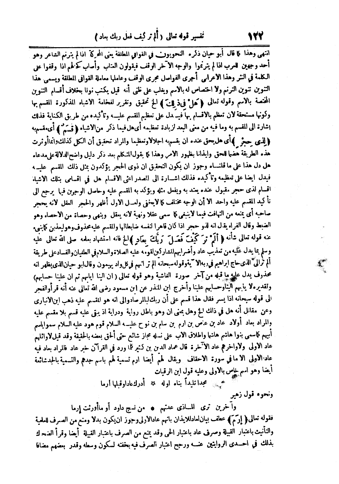 انتهى وهذا كما قال أبو حيان ذكره النحويون في القوافي المطلقة يعني المحركة إذا لم يترنم الشاعر وهو أحد وجهين للعرب إذا لم يترنموا والوجه الآخر الوقوف فيقولون العتاب وأصاب كحالهم إذا وقفوا على الكلمة في النثر وهذا الأعرابي أجرى الفواصل مجرى الوقف وعاملها معاملة القوافيالمطلقة ويسمى هذا التنوين تنوين الترنم ولا اختصاص له بالأسم ويغلب على ظني أنه قيل يكتب نونا بخلاف أقسام التنوين المختصة بالأسم وقوله تعالى هل في ذلك الح تحقيق وتقرير لفخامة الأشياء المذكورة المقسم بها وكونها مستحقة لأن تعظم بالأقسام بها فيدل على تعظيم المقسم عليه وتأكيده من طريق الكنلة فذلك إشارة إلى المقسم به وما فيه من معنى البعد لزيادة تعظيمه أي هل فيما ذكر من الأشياء قسم أي مقسم به لذي حجر أي هل يحق عنده أن يقسم به إجلالا وتعظيما والمراد تحقيق أن الكل كذلك وإنما أوثرت هذه الطريقة هضما للحق وإيذانا بظهور الأمر وهذا كما يقول المتكلم بعد ذكر دليل واضح الدلالة على مدعاه هل دل هذا على ما قلناه وجوز أن يكون التحقيق أن ذوي الحجر يؤكدون بمثل ذلك المقسم عليه فيدل أيضا على تعظيمه وتأكيده فذلك إشارة إلى المصدر أعني الأقسام هل في أقسامي بتلك الأشياء أقسام لذي حجر مقبول عنده يعتد به ويفعل مثله ويؤكد به المقسم عليه وحاصل الوجهين فيما يرجع إلى تأكيد المقسم عليه واحد إلا أن الوجه مختلف كما لا يخفى ولعل الأول أظهر والحجر العقل لأنه يحجر صاحبه أي يمنعه من التهافت فيما لا ينبغي كما سمي عقلا ونهية لأنه يعقل وينهى وحصاة من الإحصاء وهو الضبط وقال الفراء يقال أنه لذو حجر إذا كان قاهرا لنفسه ضابطا لها والمقسم عليه محذوف وهو ليعذبن كما ينبيء عنه قوله تعالى شأنه ألم تر كيف فعل ربك بعاد الخ فإنه استشهاد بعلمه صلى الله تعالى عليه وسلم بما يدل عليه من تعذيب عاد وأضرابهم المشاركين لقومه عليه الصلاة و السلام في الطغيان والفساد على طرقة ألم تر إلى الذي حاج إبراهيم في ربه الآية وقوله سبحانه ألم تر أنهم في كل واد يهيمنون وقال أبو حيان الذي يظهر أنه محذوف يدل عليه ما قبله من آخر سورة الغاشية وهو قوله تعالى إن إلينا إيابهم ثم إن علينا حسابهم وتقديره لأيابهم إلينا وحسابهم علينا وأخرج ابن المنذر عن ابن مسعود رضي الله تعالى عنه أنه قرأ والفجر إلى قوله سبحانه إذا يسر فقال هذا قسم على أن ربك لبالمرصاد وإلى أنه هو المقسم عليه ذهب ابن الأنباري وعن مقاتل أنه هل في ذلك الخ وهل بمعنى أن وهو باطل رواية ودراية إذ يبقى عليه قسم بلا مقسم عليه والمراد بعاد أولاد عاد بن عاص بن أرم ابن سام بن نوح عليه الصلاة و السلام قوم هود عليه السلام سموا باسم أبيهم كما سمي بنوا هاشم هاشما وإطلاق الأب على نسله مجاز شائع حتى ألحق بعضه بالحقيقة وقد قيل لأوائلهم عاد الأولى ولأواخرهم عاد الآخرة عماد الدين بن كثير كلما ورد في القرآن خبر عاد فالمراد بعاد فيه عاد الأولى إلا ما في سورة الأحقاف ويقال لهم أيضا إرم تسمية لهم باسم جدهم والتسمية بالجد شائعة أيضا وهو اسم خاص بالأولى وعليه قول ابن الرقيات مجدا تليدا بناه أوله