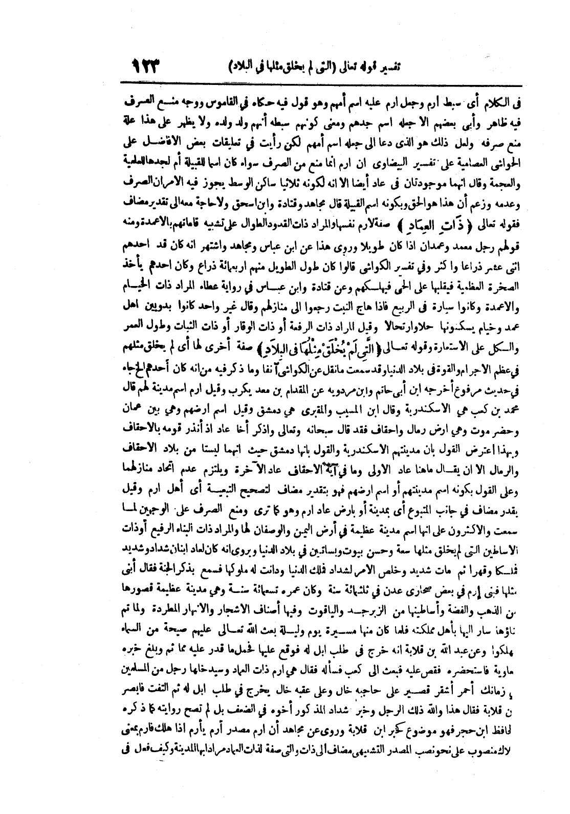 في الكلام أي سبط إرم وجعل إرم عليه اسم أمهم وهو قول فيه حكاه في القاموس ووجه منع الصرف فيه ظاهر وأبى بعضهم إلا جعله اسم جدهم ومعنى كونهم سبطه أنهم ولد ولده ولا يظهر على هذا علة منع صرفه ولعل ذلك هو الذي دعا إلى جعله اسم أمهم لكن رأيت في تعليقات بعض الأفاضل على الحواشي العصامية على تفسير البيضاوي إن إرم إنما منع من الصرف سواء كان إسما للقبيلة أم لجدها للعلمية والعجمة وقال أنهما موجودتان في عاد أيضا إلا أنه لكونه ثلاثيا ساكن الوسط يجوز فيه الأمر إن الصرف وعدمه وزعم أن هذا هو الحق وبكونه اسم القبيلة قال مجاهد وقتادة وابن إسحق ولا حاجة معه إلى تقدير مضاف فقوله تعالى ذات العماد صفة لأرم نفسها والمراد ذات القدود الطوال على تشبيه قاماتهم بالأعمدة ومنه قولهم معمد وعمدان إذا كان طويلا وروي هذا عن ابن عباس ومجاهد واشتهر أنه كان قد أحدهم اثني عشر ذراعا وأكثر وفي تفسير الكواشي قالوا كان طول الطويل منهم أربعمائة ذراع وكان أحدهم يأخذ الصخرة العظيمة فيقلبها على الحي فيهلكهم وعن قتادة وابن عباس في رواية عطاء المراد ذات الخيام والأعمدة وكانوا سيارة في الربيع فإذا هاج النبت رجعوا إلى منازلهم وقال غير واحد كانوا بدويين أهل عمد وخيام يسكنونها حلا وارتحالا وقيل المراد ذات الرفعة أو ذات الوقار أو ذات الثبات وطول العمر والكل على الأستعارة وقوله تعالى التي لم يخلق مثلها في البلاد صفة أخرى لها أي لم يخلق مثلهم في عظم الأجرام والقوة في بلاد الدنيا وقد سمعت ما نقل عن الكواشي آنفا وما ذكر فيه من أنه كان أحدهم الخ جاء في حديث مرفوع أخرجه ابن أبي حاتم وابن مردويه عن المقدام بن معد يكرب وقيل إرم اسم مدينة لهم قال محمد بن كعب هي الأسكندرية وقال ابن المسيب والمقبري هي دمشق وقيل اسم أرضهم وهي عمان وحضرموت وهي أرض رمال وأحقاف فقد قال سبحانه وتعالى واذكر أخا عاد إذ أنذر قومه بالأحقاف وبهذا اعترض القول بأن مدينتهم السكندرية والقول بأنها دمشق حيث أنهما ليستا من بلاد الأحقاف والرمال إلا أن يقال ما هنا عاد الأولى وما في آية الأحقاف عاد الآخرة ويلتزم عدم اتحاد منازلهما وعلى القول بكونه اسم مدينتهم أو اسم أرضهم فهو بتقدير مضاف لتصحيح التبعية أي أهل أرم وقيل يقدر مضاف في جانب المتبوع أي بمدينة أو بأرض عاد إرم وهو كما ترى ومنع الصرف على الوجهين لما سمعت والأكثرون على أنها اسم مدينة عظيمة في أرض اليمن والوصفان لها والمراد ذات البناء الرفيع أو ذات الأساطين التي لم يخلق مثلها سعة وحسن بيوت وبساتين في بلاد الدنيا ويروى أنه كان لعان ابنان شداد وشديد فملكا وقهرا ثم مات شديد وخلص الأمر لشداد فملك الدنيا ودانت له ملوكها فسمع بذكر الجنة فقال أبني مثلها فبنى إرم في بعض صحاري عدن في ثلثمائة سنة وكان عمره تسعمائة سنة وهي مدينة عظيمة قصوتها من الذهب والفضة وأساطلينها من الزبرجد والياقوت وفيها أصناف الأشجار والأنهار المطردة ولما تم بناؤها سار إليها بأهل مملكته فلما كان منها مسيرة يوم وليلة بعث الله تعالى عليهم صيحة من السماء فهلكوا وعن عبد الله بن قلابة أنه خرج في طلب إبل له فوقع عليها فحمل ما قدر عليه مما ثم وبلغ خبره معاوية فاستحضره فقص عليه فبعث إلى كعب فسأله فقال هي إرم ذات العماد وسيدخلها رجل من المسلمين في زمانك أحمر أشقر قصير على حاجبه خال وعلى عقبه خال يخرج في طلب إبل له ثم التفت فأبصر ابن قلابة فقا هذا والله ذلك الرجل وخبر شداد المذكور أخوه في الضعف بل لم تصح روايته كما ذكره الحافظ ابن حجر فهو موضوع كخبر ابن قلابة وروي عن مجاهد أن إرم مصدر أرم يأرم إذا هلك فارم بمعنى هلاك منصوب على نحو نصب المصدر التشبيهي مضاف إلى ذات والتي صفة لذات العماد مرادا بها المدينة وكيف فعل في