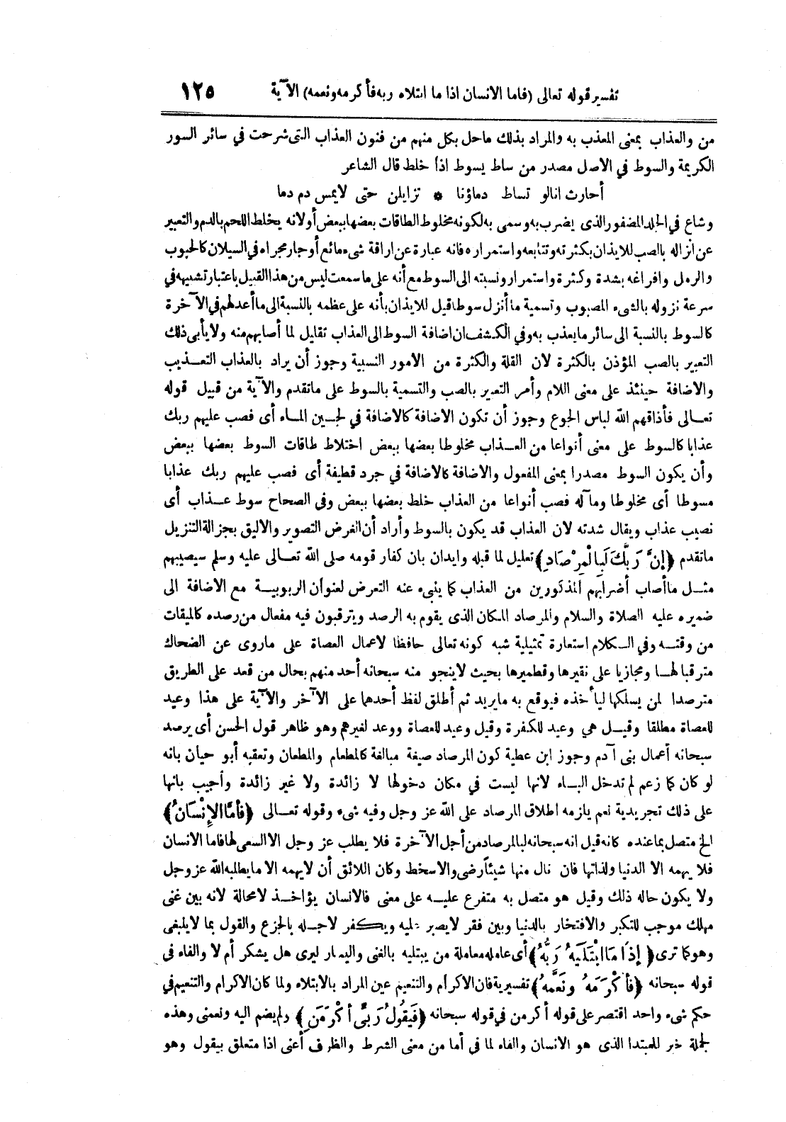 تزايلن حتى لا يمس دم دما وشاع في الجلد المضفور والذي يضرب به وسمى به لكونه مخلوط الطاقات بعضها ببعض أو لأنه يخلط اللحم بالدم والتعبير عن إنزاله بالصب للإيذان بكثرته وتتابعه واستمراره فإنه عبارة عن إراقة شيء مائه أو جار مجراه في السيلان كالحبوب والرمل وإفراغه بشدة وكثرة واستمرار ونسبته إلى السوط مع أنه على ما سمعت ليس من هذا القبيل باعتبار تشبيه في سرعة نزوله بالشيء المصبوب وتسمية ما أنزل سوطا قيل للإيذان بأنه على عظمة بالنسبة إلى ما أعد لهم في الآخرة كالسوط بالنسبة إلى سائر ما يعذب به أفي الكشف أن إضافة السوط إلى العذاب تقليل لما أصابهم منه ولا يأبى ذلك التعبير بالصب المؤذن بالكثرة لأن القلة والكثرة من الأمور النسبية وجوز أن يراد بالعذاب التعذيب والإضافة حينئذ على معنى اللام وأمر التعبير بالصب والتسمية بالسوط على ما تقدم والآية من قبيل قوله تعالى فأذاقهم الله لباس الجوع وجوز أن تكون الأضافة كالأضافة في لجين الماء أي فصب عليهم ربك عذابا كالسوط على معنى أنواعا من العذاب مخلوطا بعضها ببعض اختلاط طاقات السوط بعضها ببعض وأن يكون السوط مصدرا بمعنى المفعول والإضافة كالأضافة في جرد قطيفة أي فصب عليهم ربك عذابا مسوطا أي مخلوطا ومآله فصب أنواعا من العذاب خلط بعضها ببعض وفي الصحاح سوط عذاب أي نصيب عذاب ويقال شدته لأن العذاب قد يكون بالسوط وأراد أن الغرض التصوير والأليق بجزالة التنزيل ما تقدم إن ربك لبالمرصاد تعليل لما قبله وإيذان بأن كفار قومه صلى الله تعالى عليه وسلم سيصيبهم مثل ما أصاب أضرابهم المذكورين من العذاب كما ينبيء عنه التعرض لعنوان الربوبية مع الإضافة إلى ضميره عليه الصلاة و السلام والمرصاد المكان الذي يقوم به الرصد ويترقبون فيه مفعال من رصده كالميقات من وقته وفي الكلام استعارة تمثيلية شبه كونه تعالى حافظا لأعمال العصاة على ما روي عن الضحاك مترقبا لها ومجازيا على نقيرها وقطميرها بحيث لا ينجو منه سبحانه أحد منهم بحال من قعد على الطريق مترصدا لمن يسلكها ليأخذه فيوقع به ما يريد ثم أطلق لفظ أحدهما على الآخر والآية على هذا وعيد للعصاة مطلقا وقيل هي وعيد للكفرة وقيل وعيد للعصاة ووعد لغيرهم وهو ظاهر قول الحسن أي يرصد سبحانه أعمال بني آدم وجوز ابن عطية كون المرصاد صيغة مبالغة كالمطعام والمطعان وتعقبه أبو حيان بأنه لو كان كما زعم لم تدخل الباء لأنها ليست في مكان دخولها لا زائدة ولا غير زائدة وأجيب بأنها على ذلك تجريدية نعم يلزمه إطلاق المرصاد على الله عز و جل وفيه شيء وقوله تعالى فأما الإنسان الخ متصل بما عنده كأنه قيل أنه سبحانه لبالمرصاد من أجل الآخرة فلا يطلب عز و جل إلا السعي لها فأما الإنسان فلا يهمه إلا الدنيا ولذاتها فإن نال منها شيئارضي وإلا سخط وكان اللائق أن لا يهمه إلا ما يطلبه الله عز و جل ولا يكون حاله ذلك وقيل هو متصل به متفرع عليه على معنى فالإنسان يؤاخذ لا محالة لأنه بين غني مهلك موجب للتكبر والأفتخار بالدنيا وبين فقر لا يصبر عليه ويكفر لأجله بالجزع والقول بما لا ينبغي وهو كما ترى إذا ما بتلاه ربه أي عامله معاملة من يبتليه بالغنى واليسار ليرى هل يشكر أم لا والفاء في قوله سبحانه فأكرمه ونعمه تفسيرية فإن الإكرام والتنعيم عين المراد بالأبتلاء ولما كان الإكرام والتنعيم في حكم شيء واحد اقتصر على قوله كرمن في قوله سبحانه فيقول ربي أكرمن ولم يضم إليه ونعمتي وهذه الجملة خبر للمبتدأ الذي هو الإنسان والفاء لما في أما من معنى الشرط والظرف أعني إذا متعلق بيقول وهو