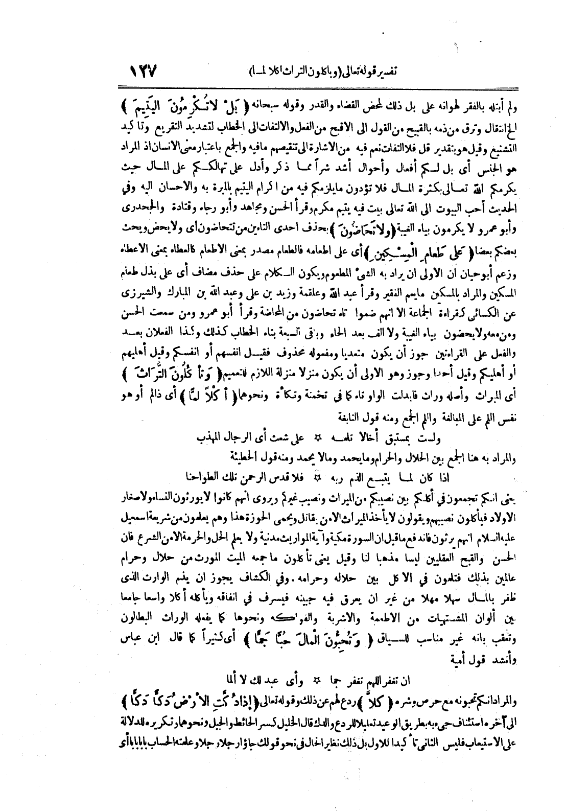 فلا قدس الرحمن تلك الطواحنا يعني أنكم تجمعون في أكلكم بين نصيبكم من الميراث ونصب غيركم ويروى أنهم كانوا لا يورثون النساء ولا صغار الأولاد فيأكلون نصيبهم ويقولون لا يأخذ الميراث إلا من يقاتل ويحمي الحوزة هذا وهم يعلمون من شريعة إسماعيل عليه السلام أنهم يرثون فاندفع ما قيل أن السورة مكية وآية المواريث مدنية ولا يعلم الحلو الحرمة إلا من الشرع فإن الحسن والقبح العقلين ليبسا مذهبا لنا وقيل يعني تأكلون ما جمعه الميت المورث من حلال وحرام عالمين بذلك فتلمون في الأكل بين حلاله وحرامه وفي الكشاف يجوز أن يذم الوارث الذي ظفر بالمال سهلا مهلامن غير أن يعرق فيه جبينه فيسرف في إنفاقه ويأكله أكلا واسعا جامعا بين ألوان المشتهيات من الأطعمة والأشربة والفواكه ونحوها كما يفعله الوارث البطالون وتعقب بأنه غير مناسب للسياق وتحبون المال حبا جما أي كثيرا كما قال ابن عباس وأنشد قول أمية إن تغفر اللهم تغفر جما